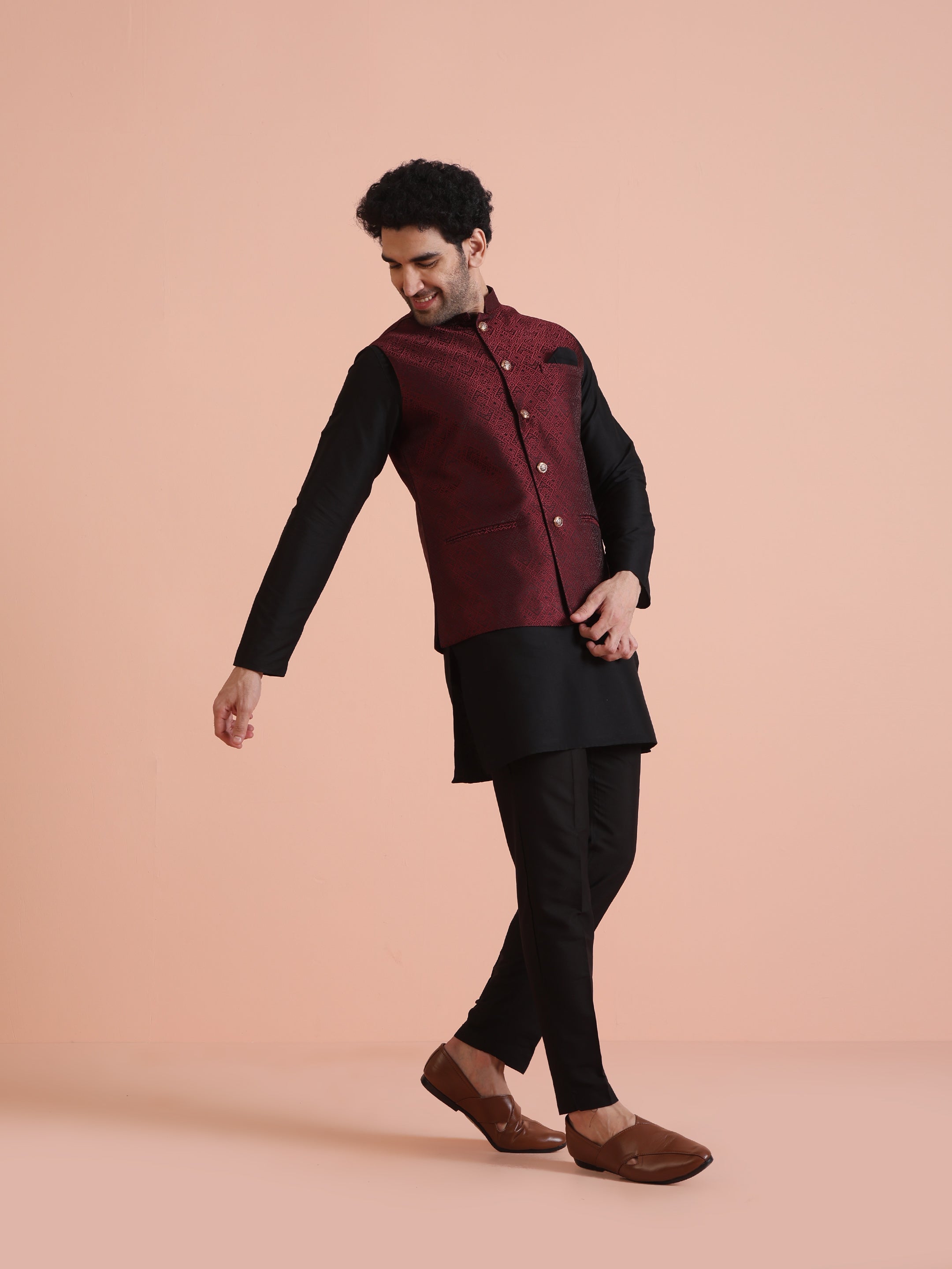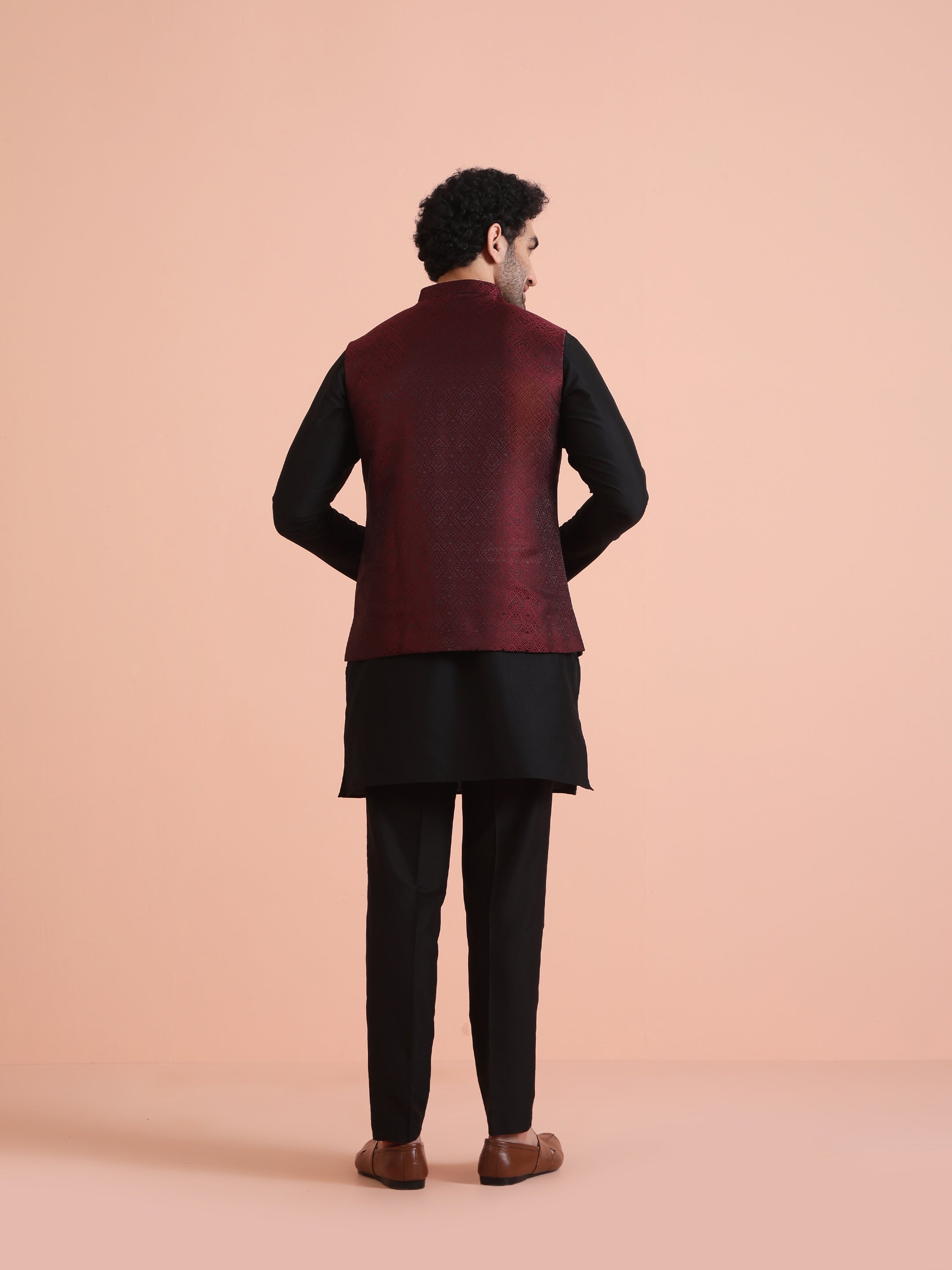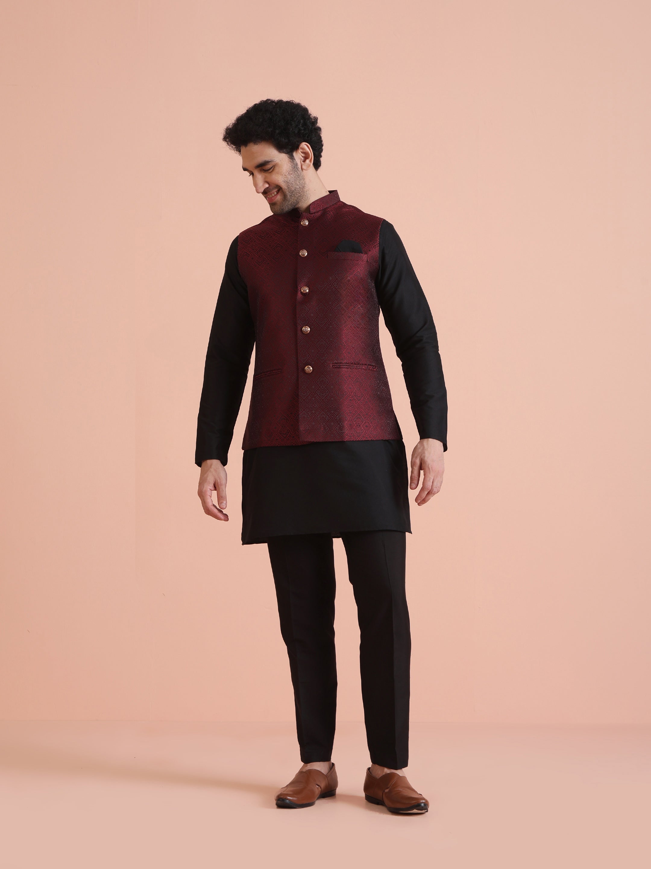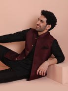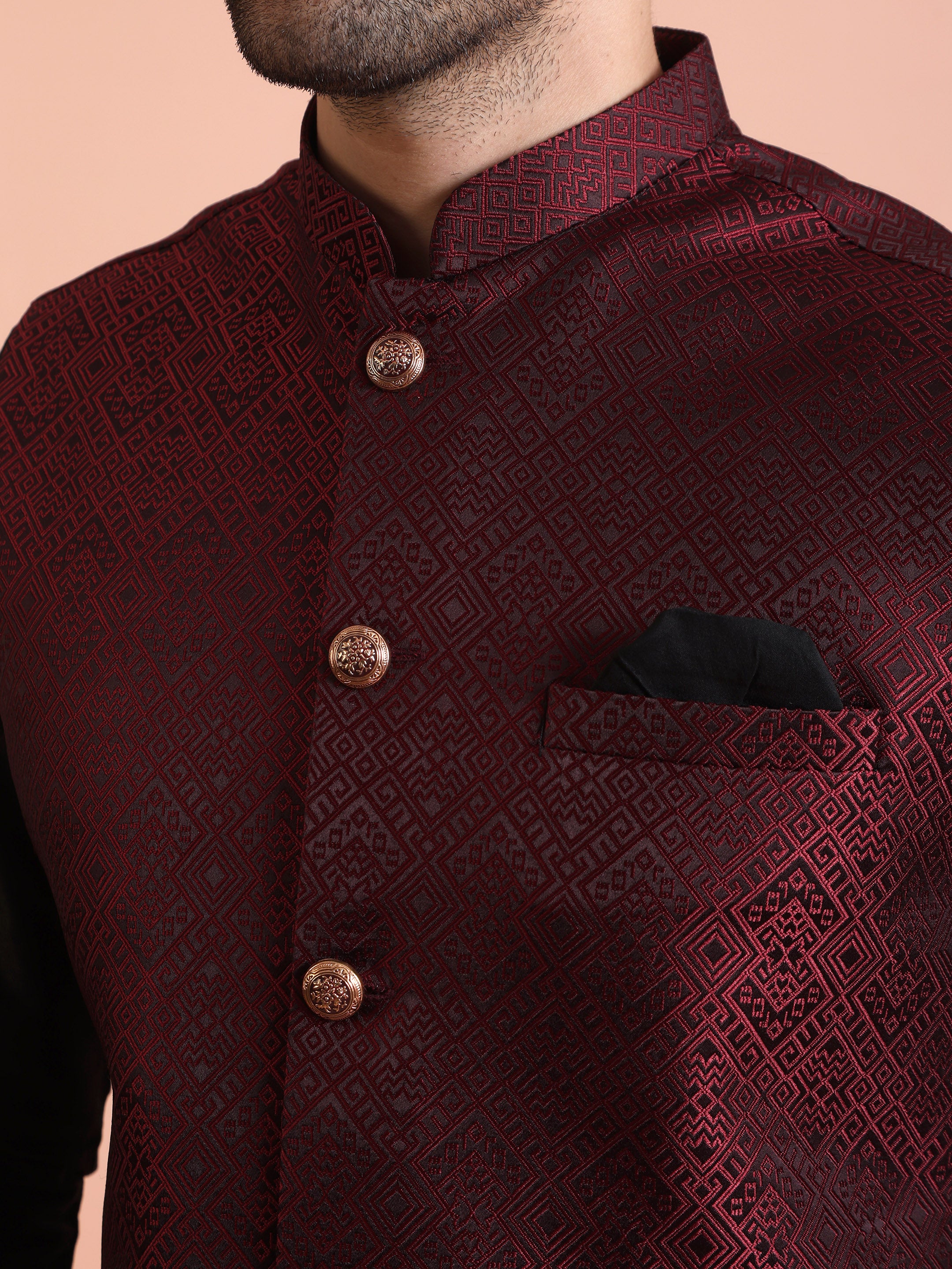 Wine Jacquard Silk Blend Kurta Jacket Set