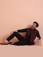 Wine silk blend jacquard kurta jacket trouser set for men. Perfect for festive celebrations and wedding functions.