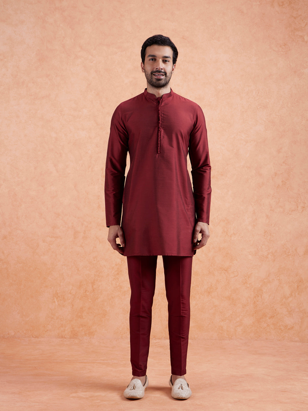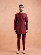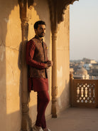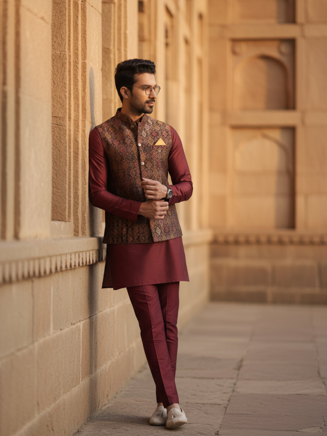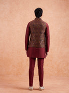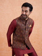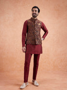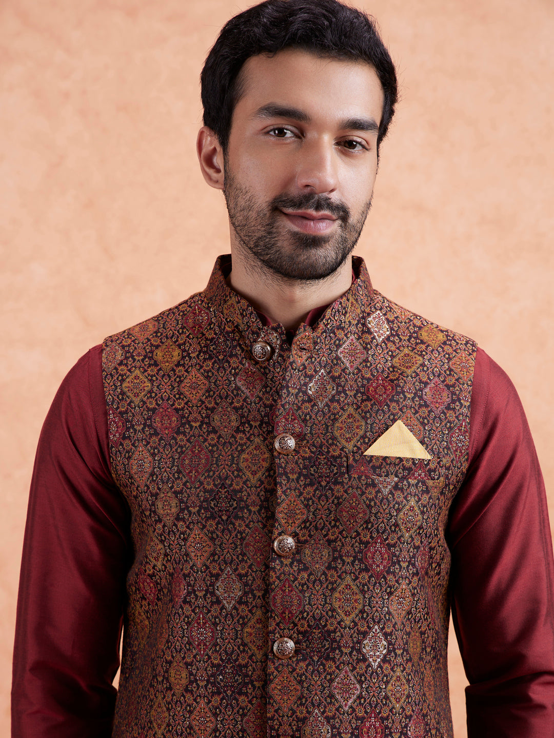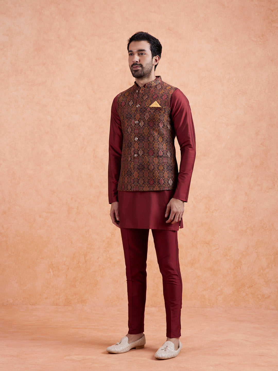 Yellow-Multicolor Silk Blend Jacquard Mid Kurta Jacket Trouser Set, Perfect festive ethnic wear for men, ideal festive and casual occasions.