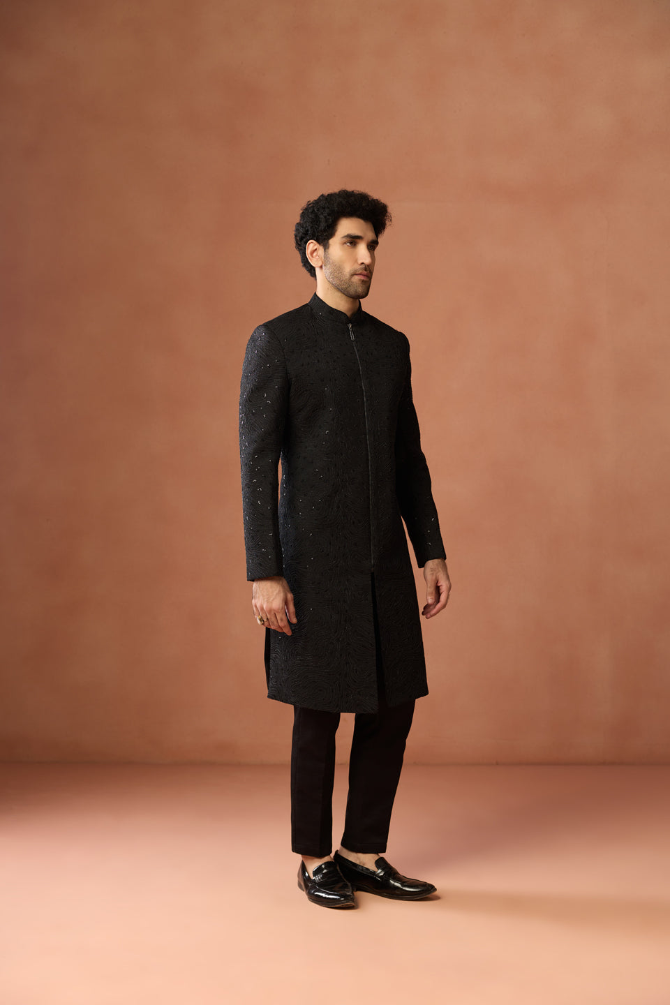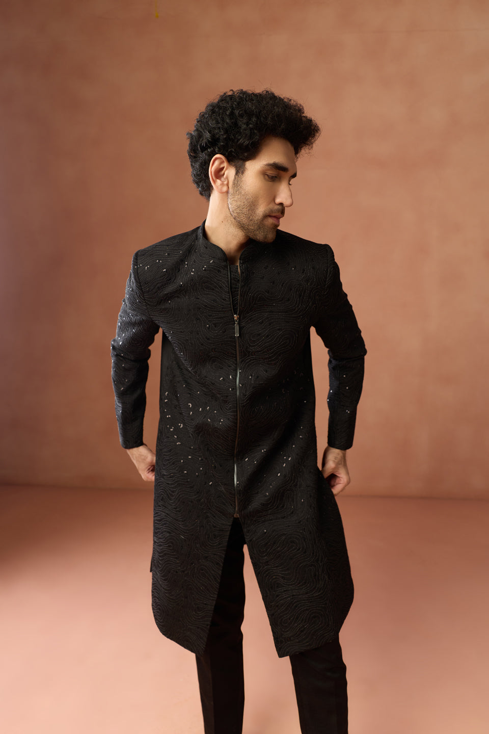 Black Polyviscose Embellished Sherwani with Zip Trouser Set, Perfect festive ethnic wear for men, ideal festive and casual occasions.