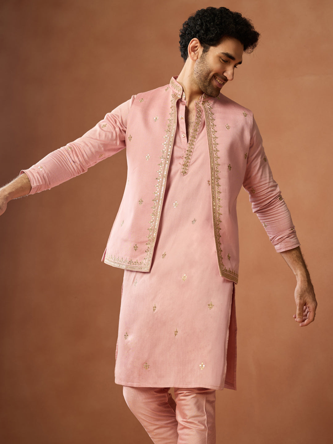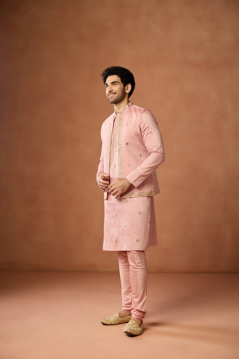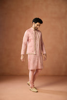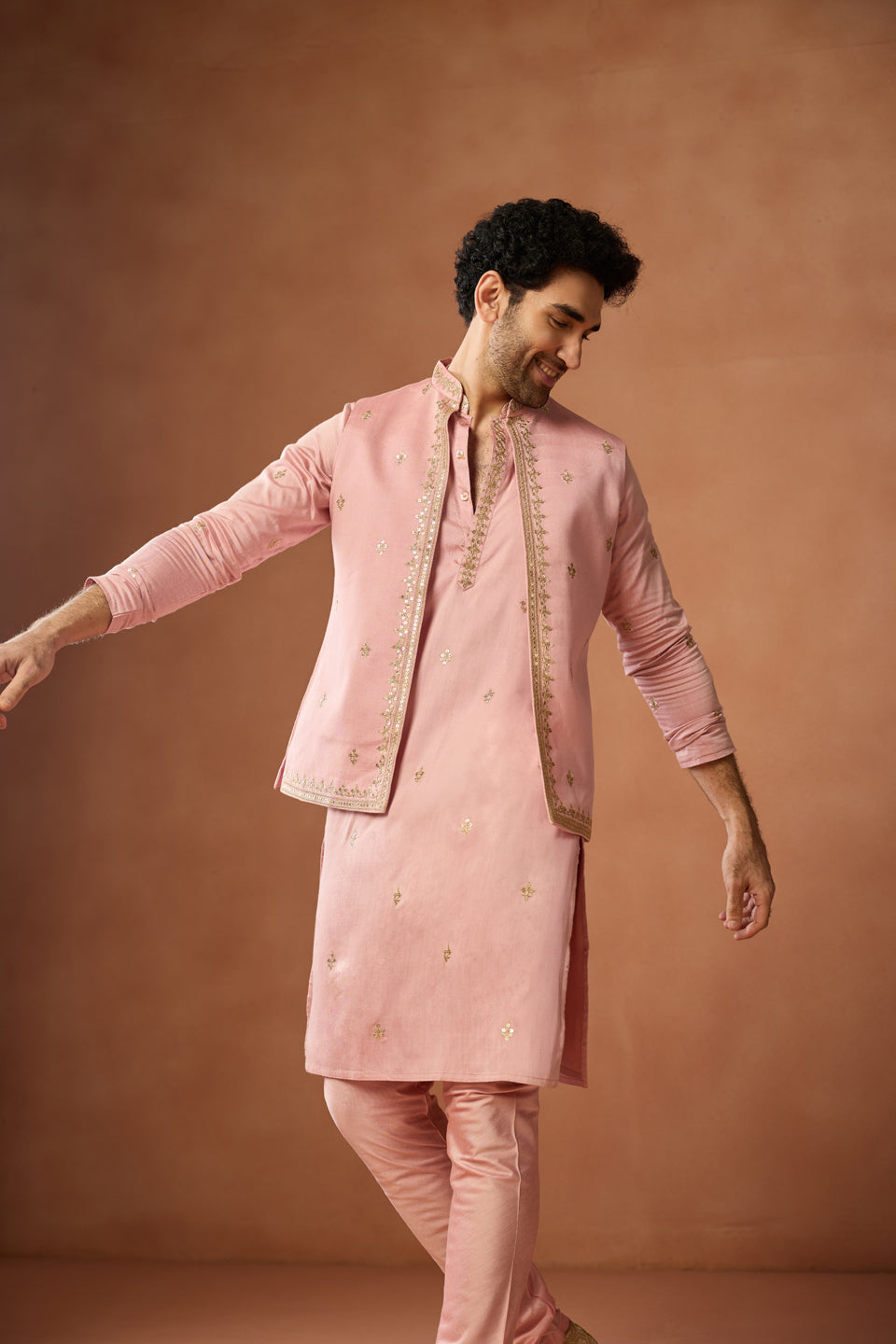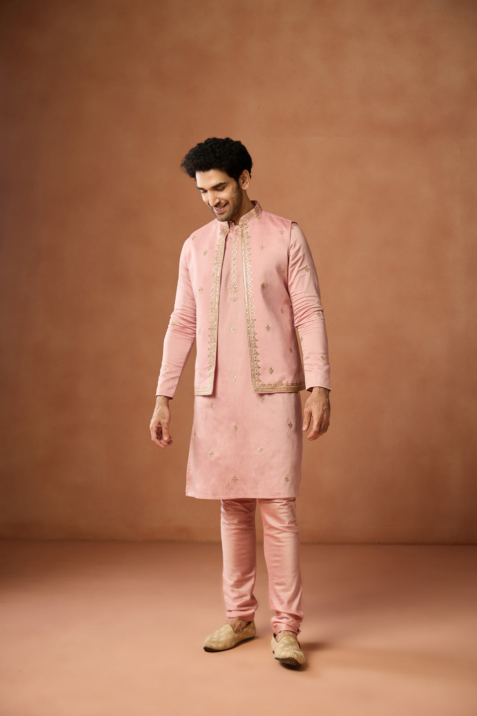 Kisah blush pink silk blend kurta with embroidered front open jacket and churidar. Perfect festive wear set for weddings, sangeet, and receptions.