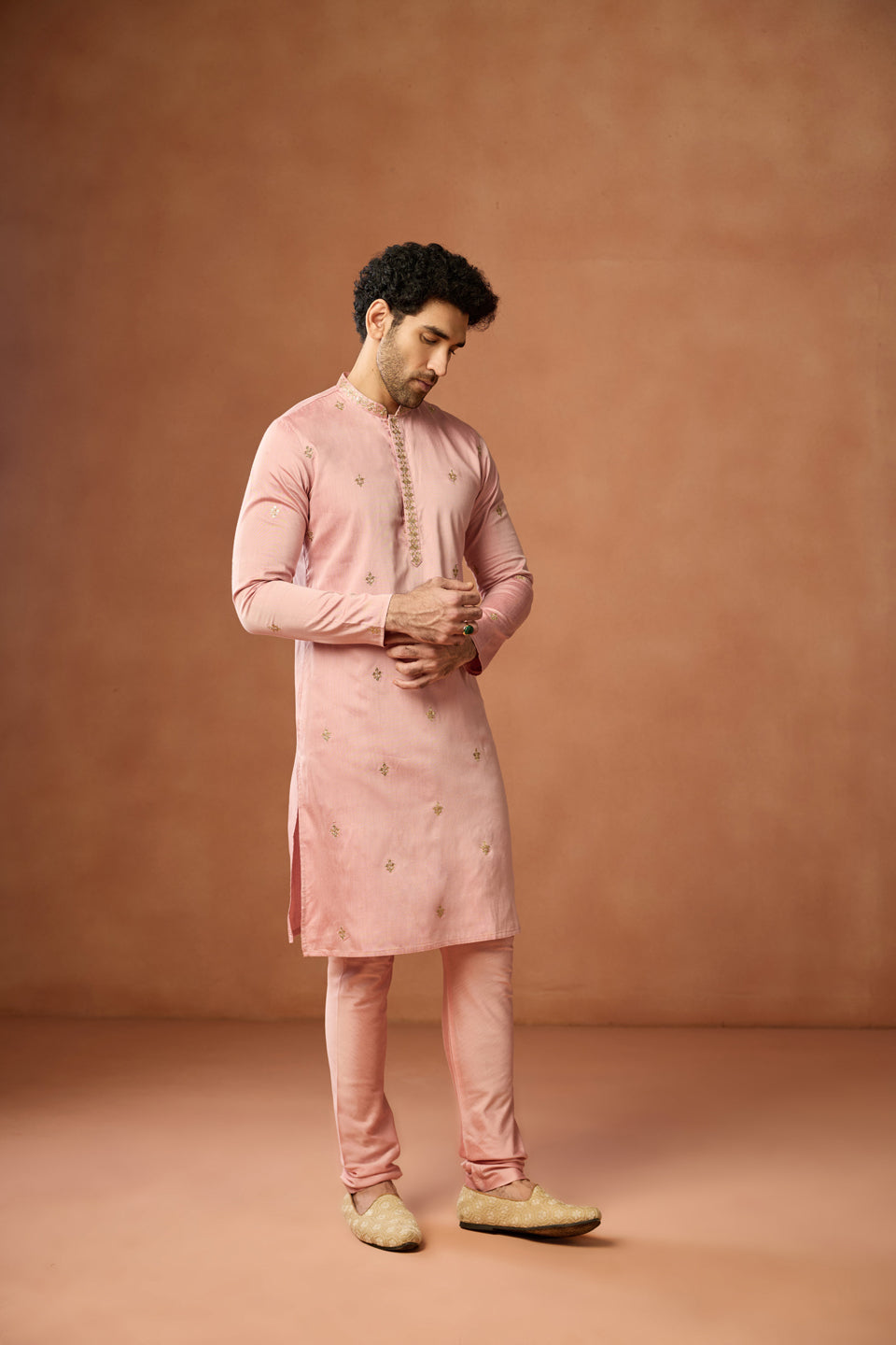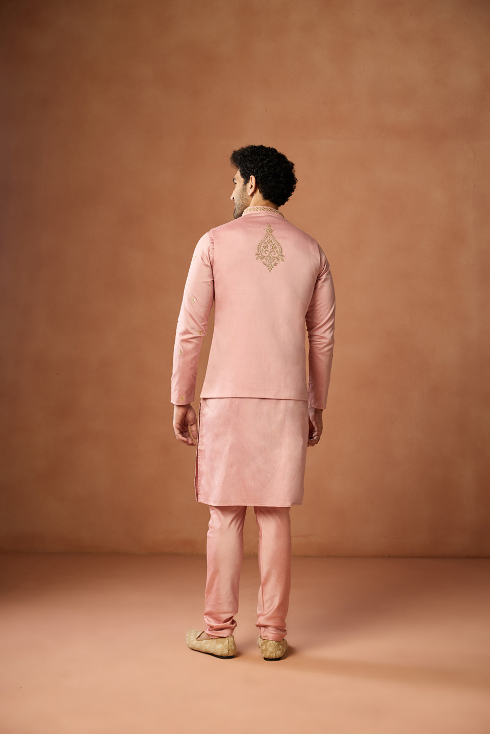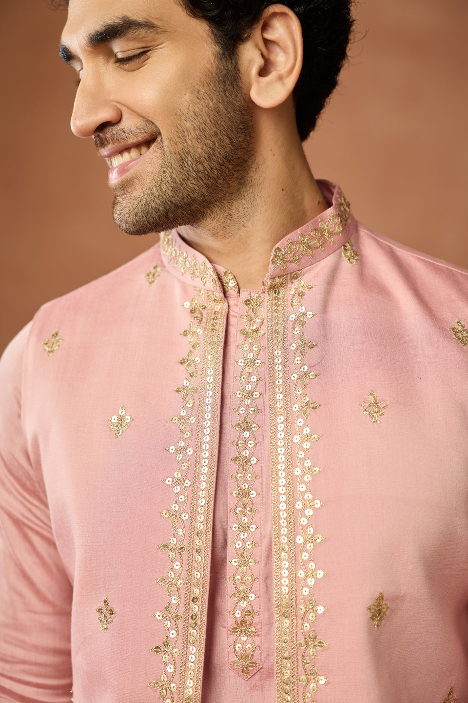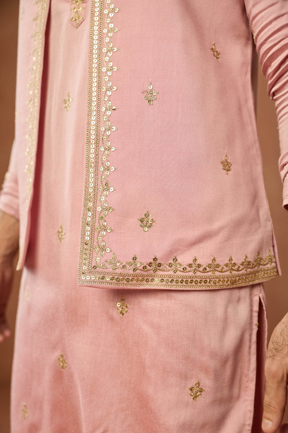 Kisah blush pink silk blend kurta with embroidered front open jacket and churidar. Perfect festive wear set for weddings, sangeet, and receptions.