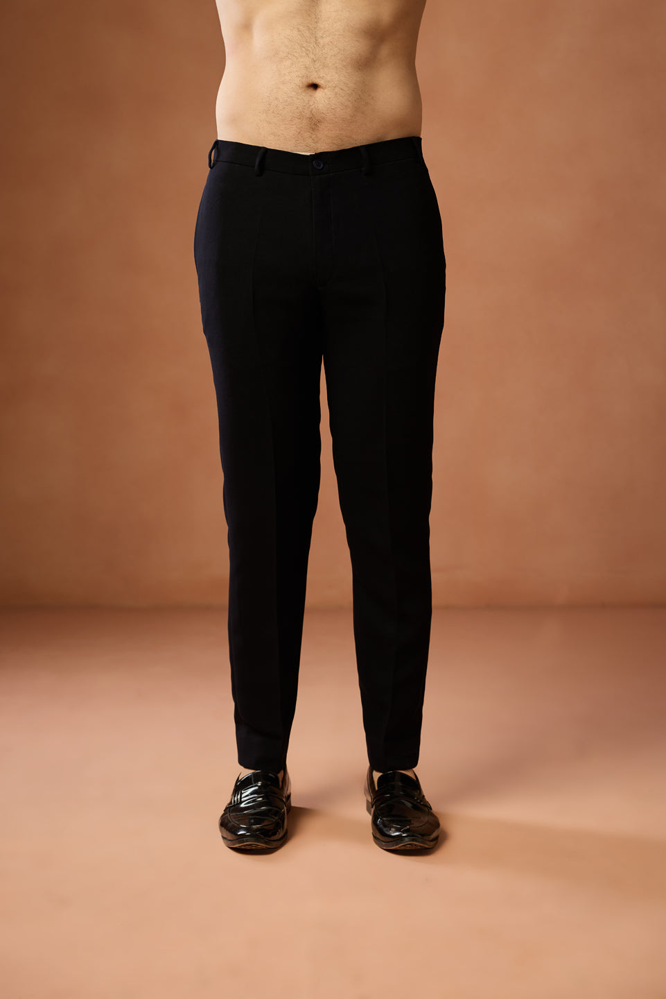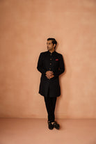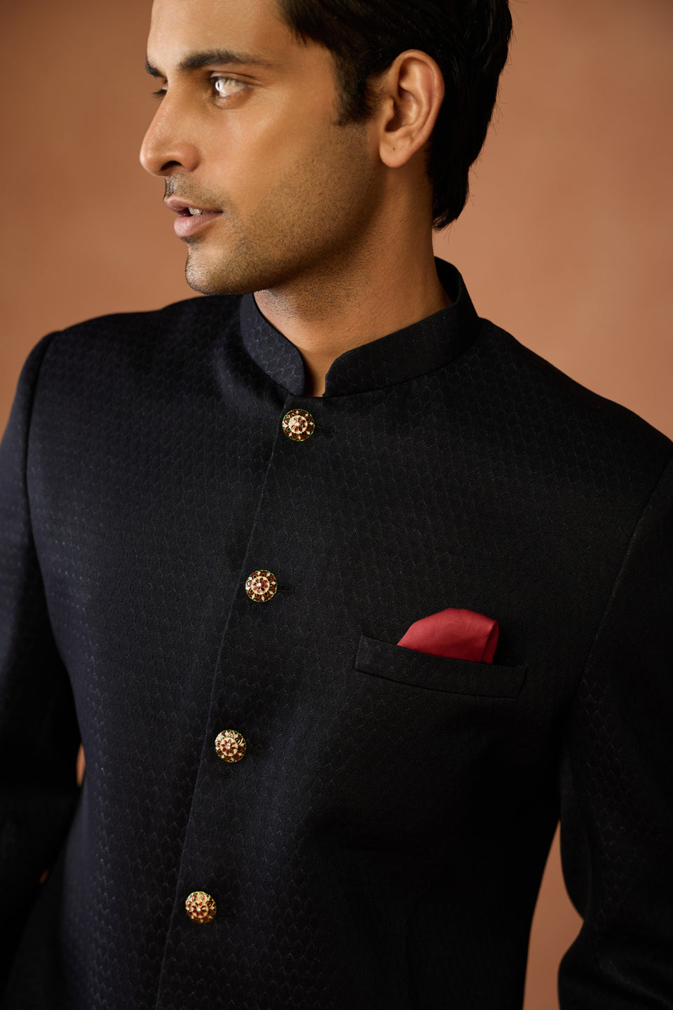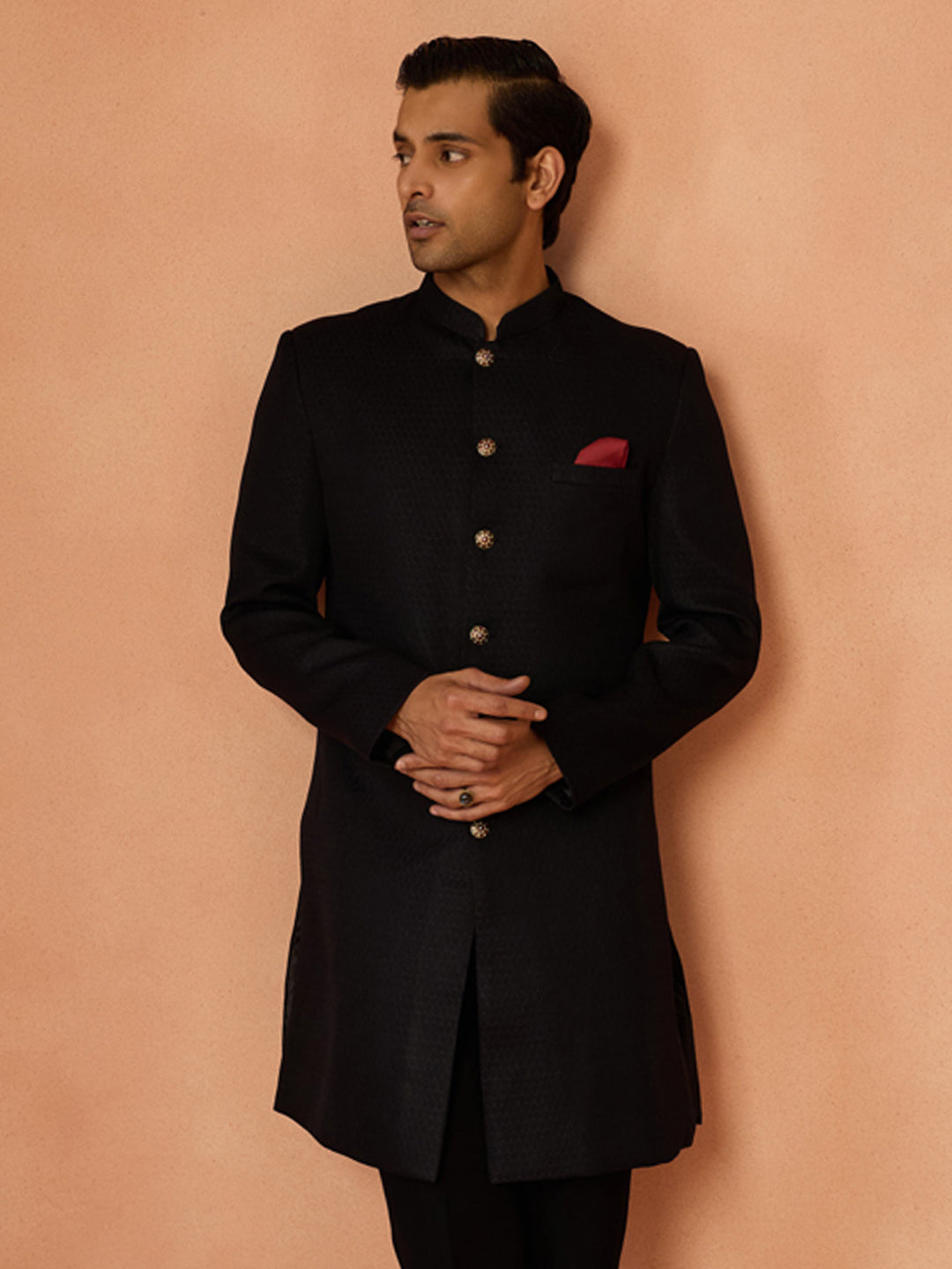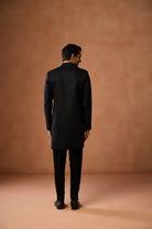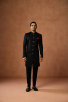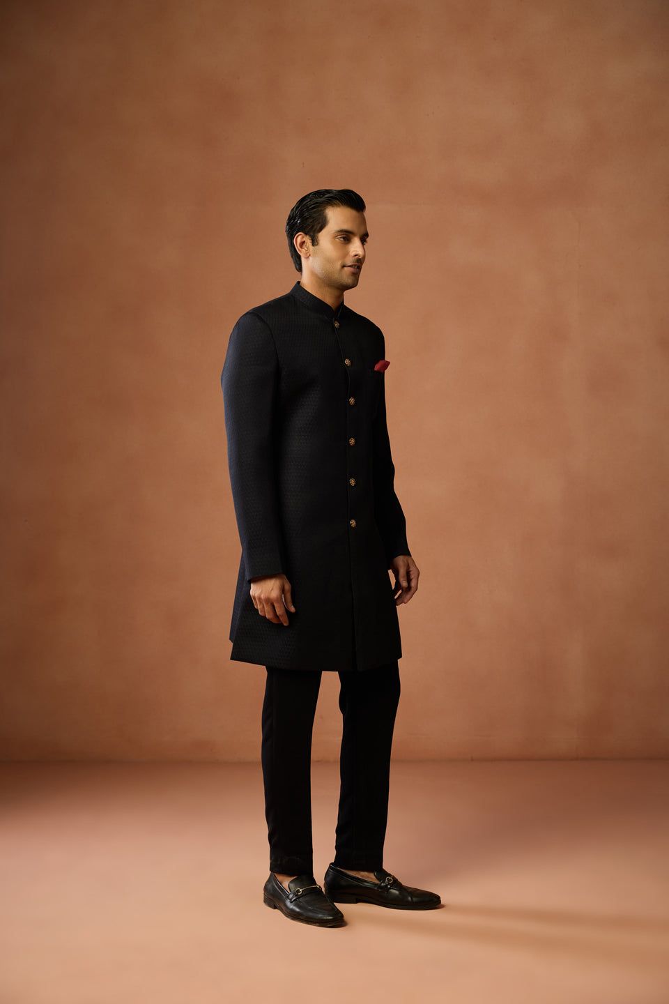 Dark Blue Silk Blend Jacquard Sherwani Trouser Set, Perfect festive ethnic wear for men, ideal festive and casual occasions.