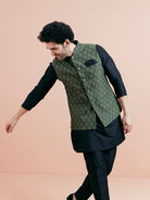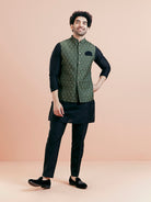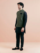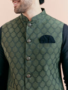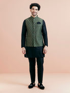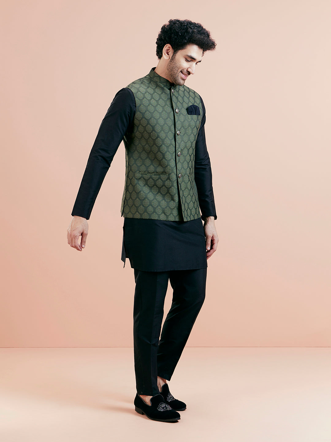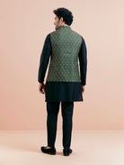 This Green Silk Blend Kurta Jacket Trouser Set features a textured Nehru Jacket (also known as Bundi Jacket), mid-length kurta, and matching trousers. Perfect for festive and elegant occasions.