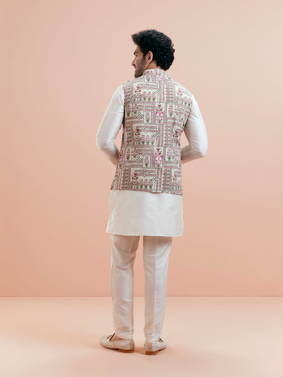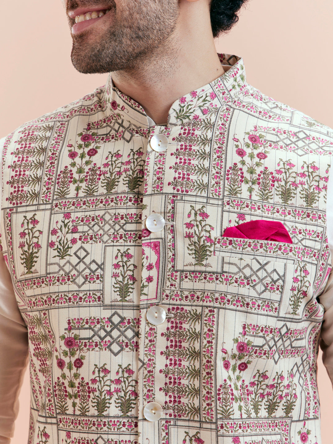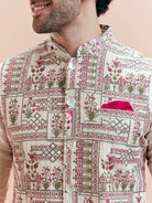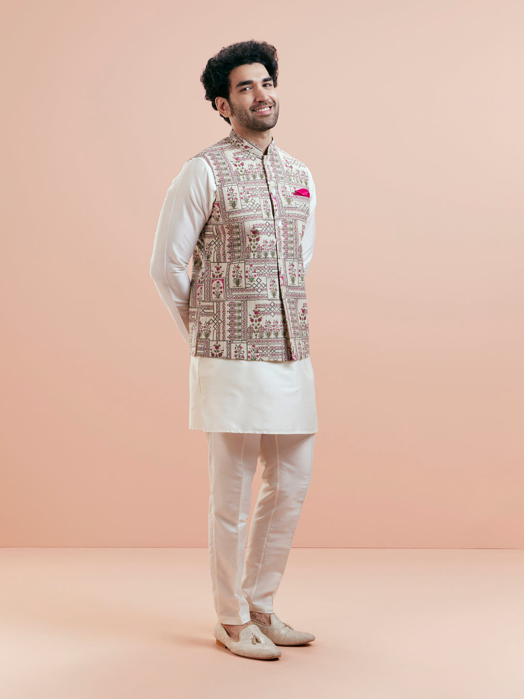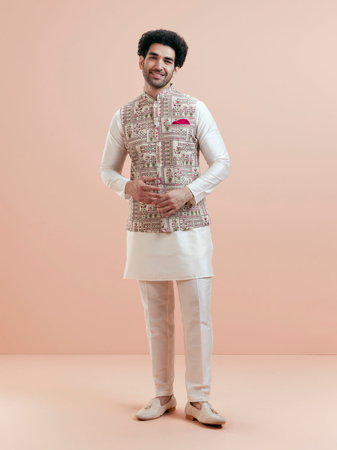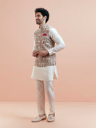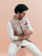 This Multicolor Cotton Blend Kurta Jacket Trouser Set features a printed Nehru Jacket (also known as Bundi Jacket), mid-length kurta, and black trouser. A bold and festive statement for Haldi or daytime events.