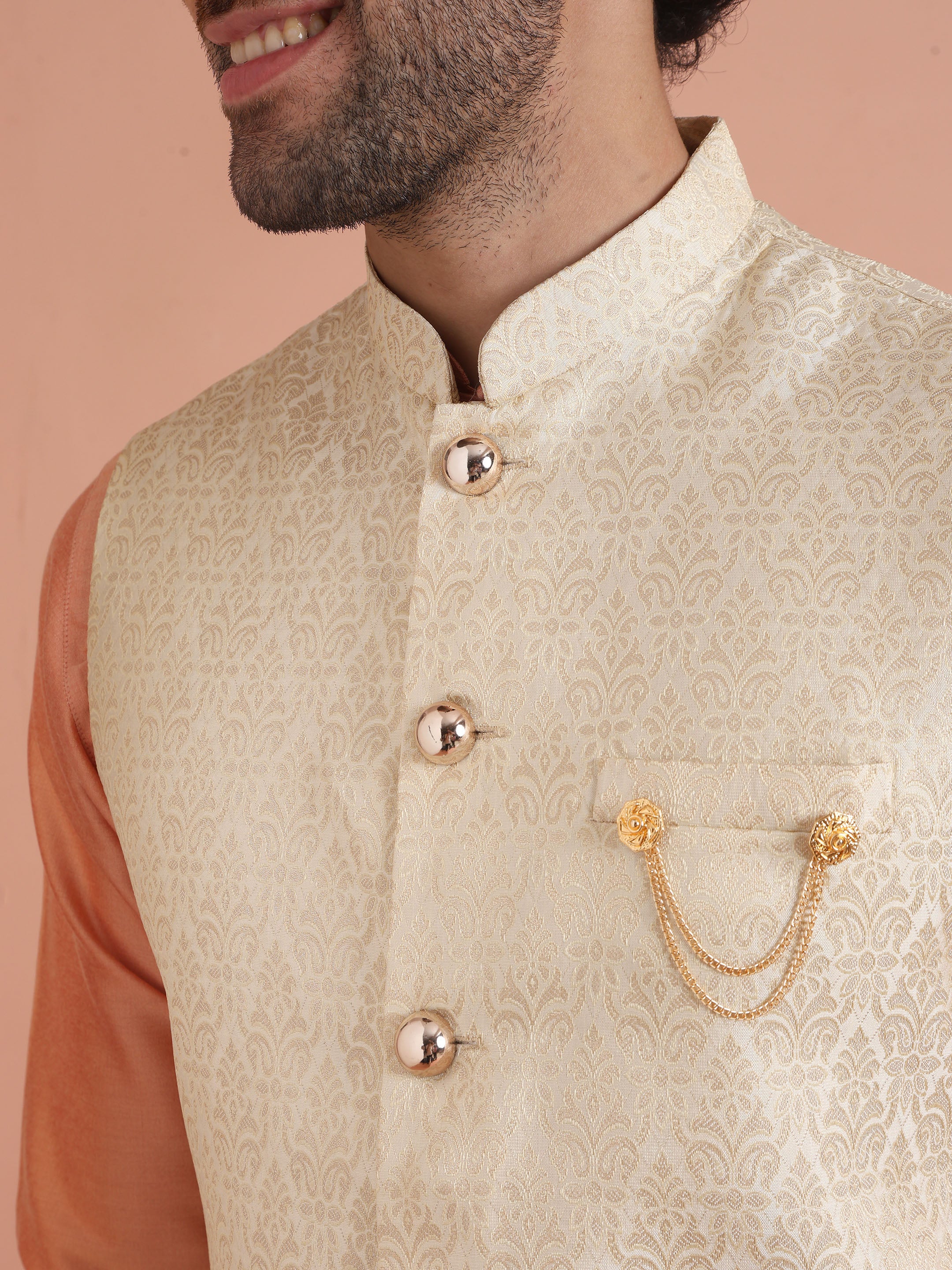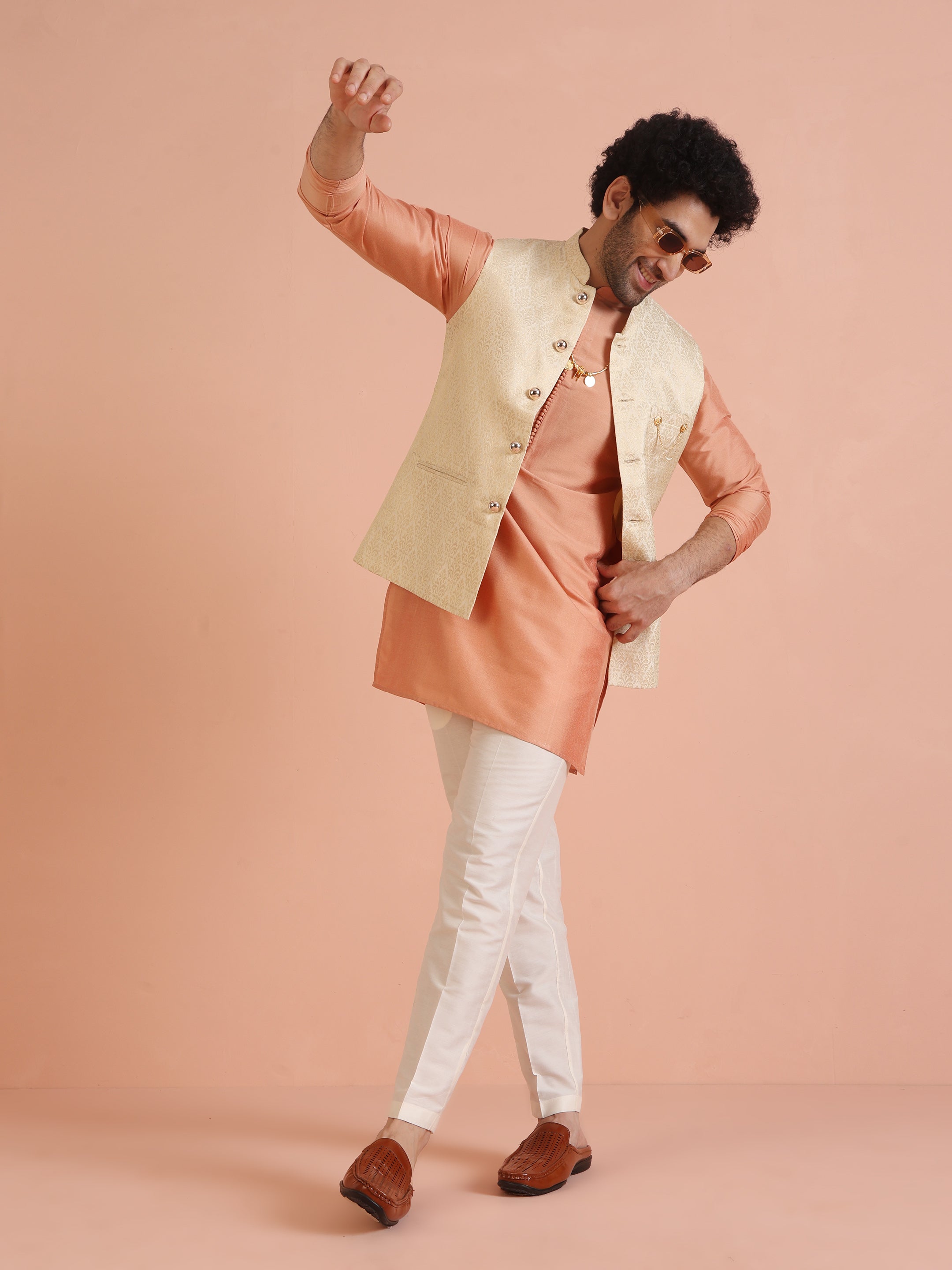 Experience classic elegance with this Kisah Men Grey Jacquard Kurta Jacket Trouser Set. The breathable Silk Blend fabric with Jacquard Patternn ensures comfort throughout the day. Ideal for festive events or casual wear.
