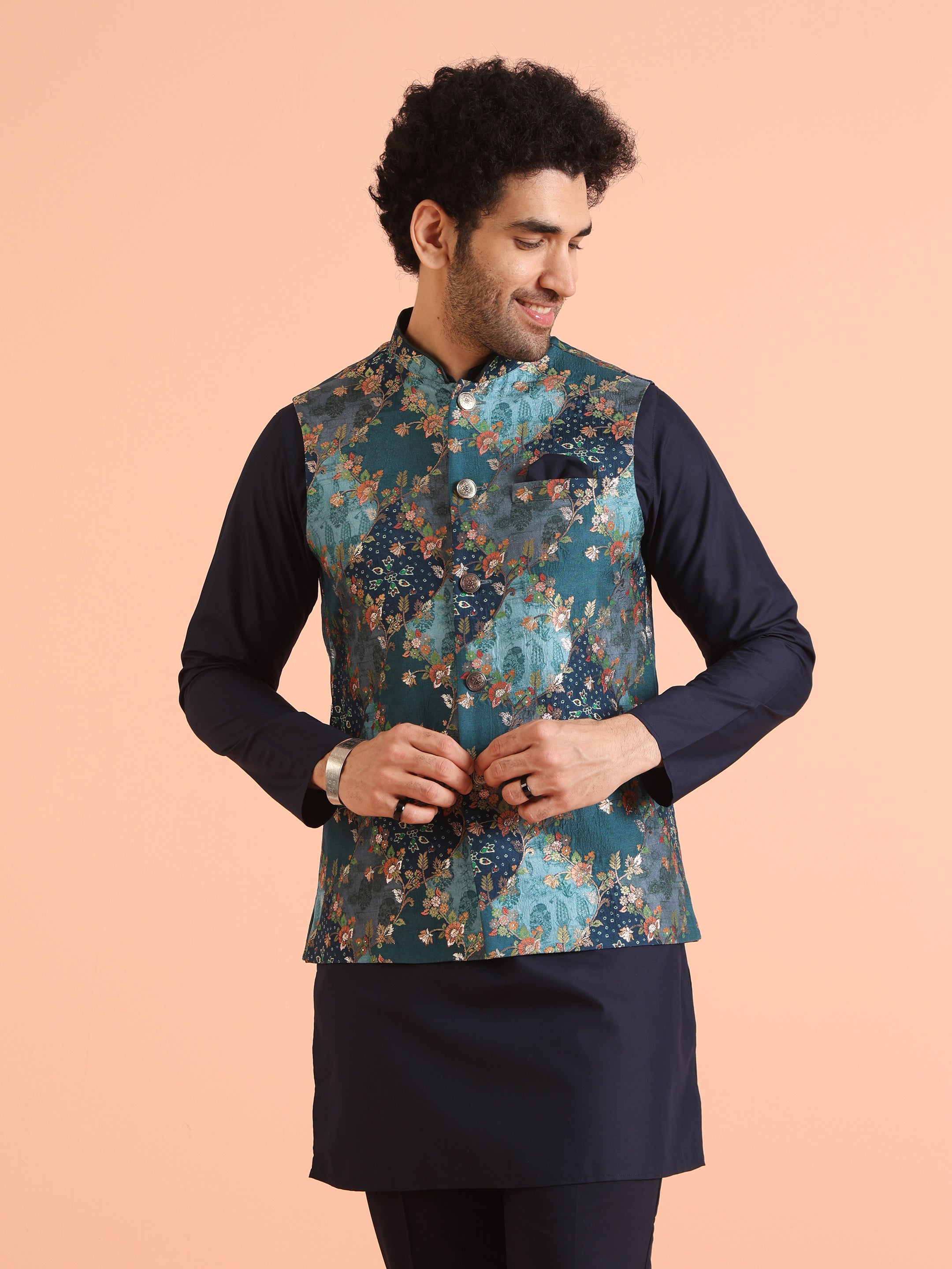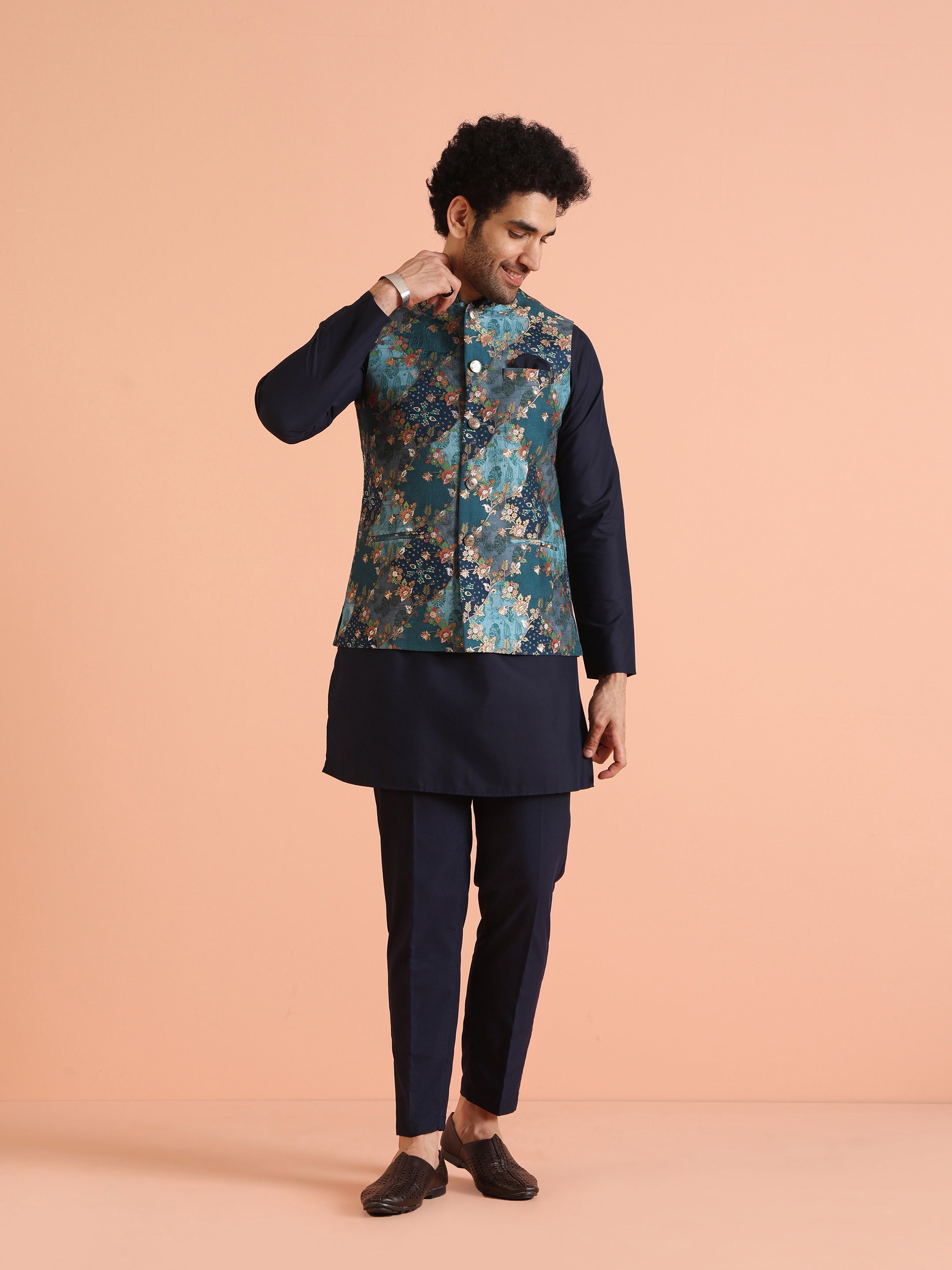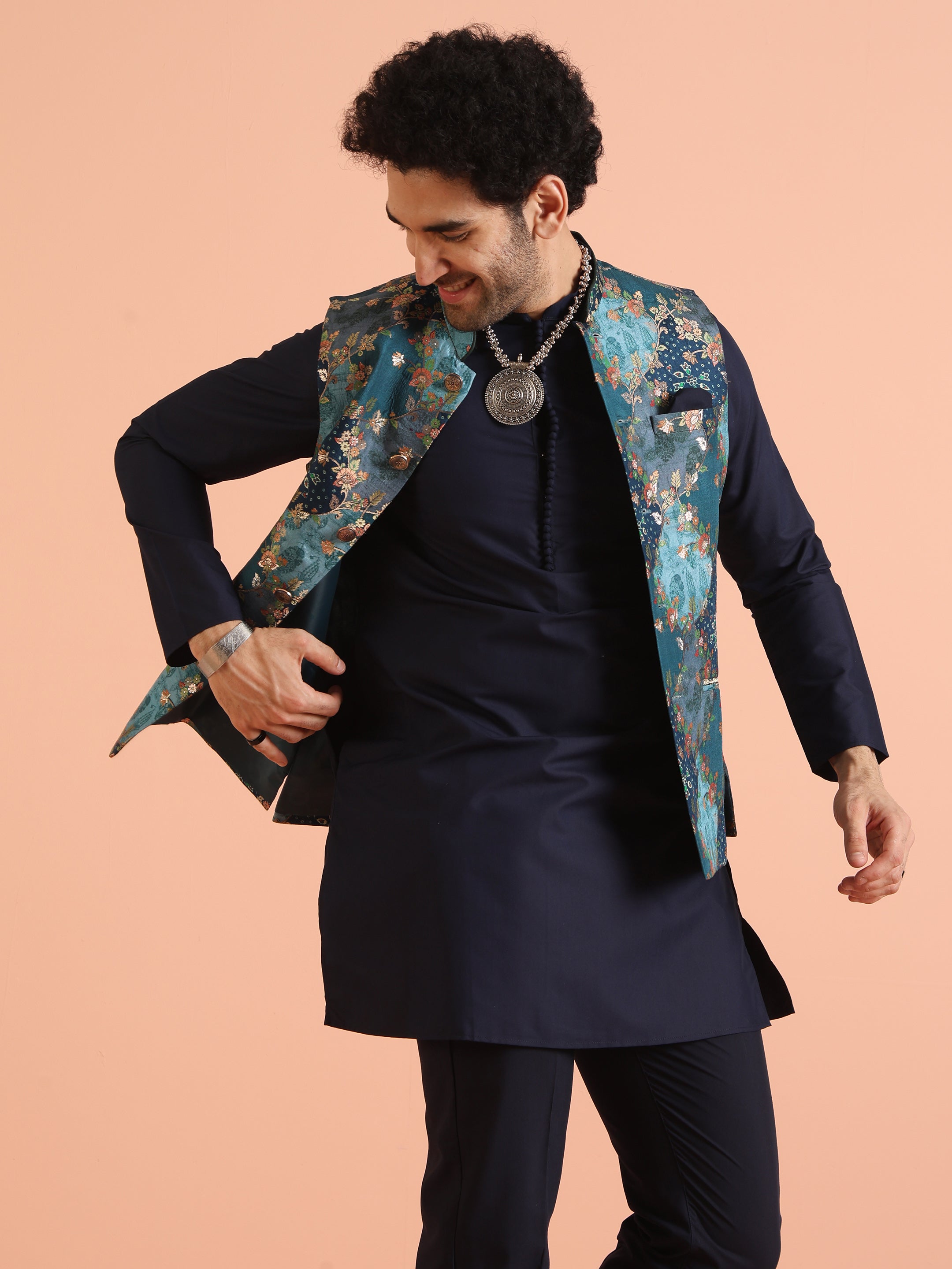 Blue Silk Woven Floral Nehru Jacket Kurta Set