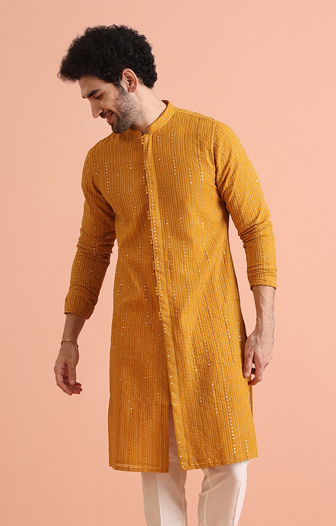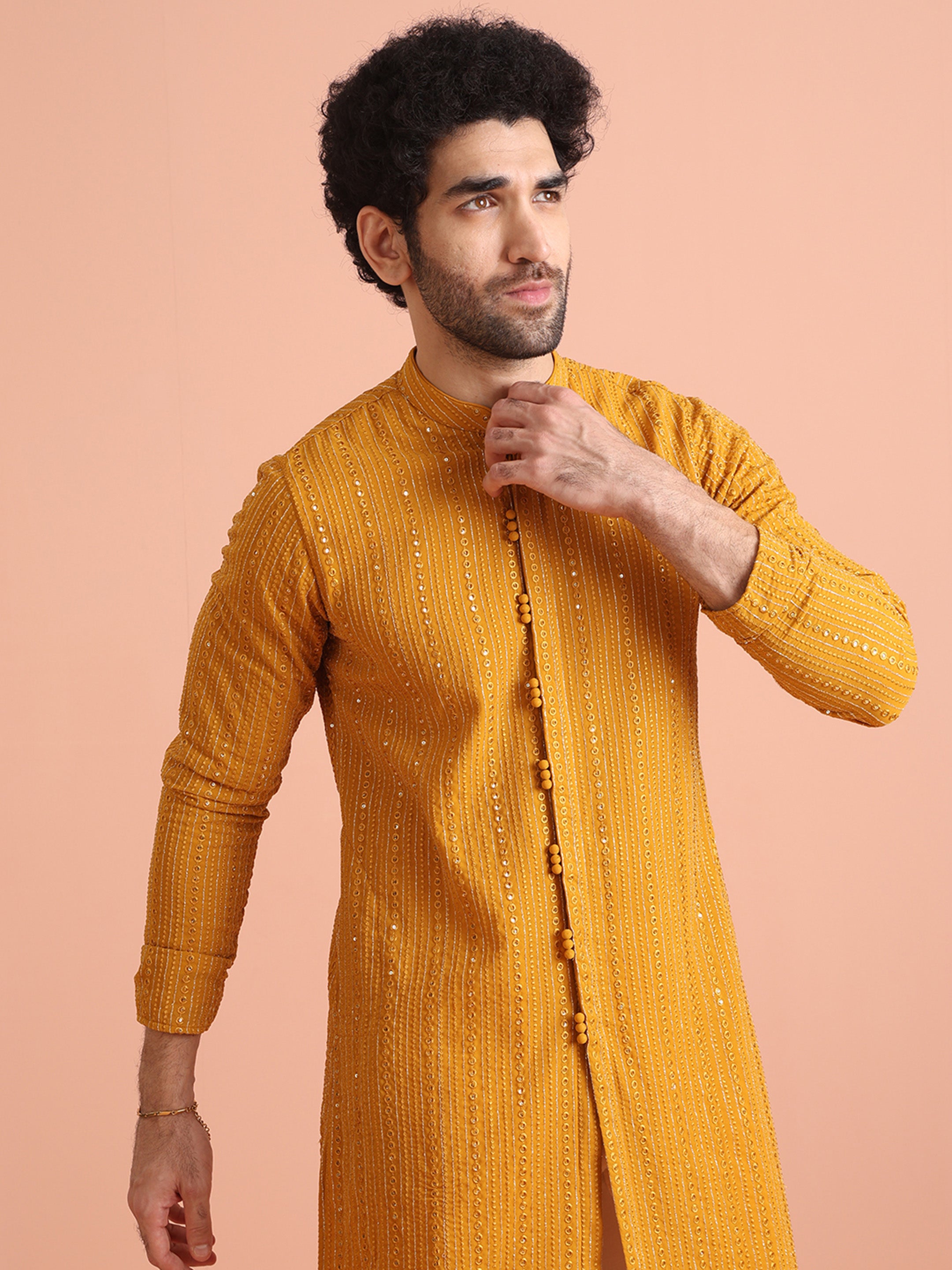 Experience timeless elegance with this Men's Mustard Yellow Georgette Kurta, designed to elevate your ethnic wardrobe. Featuring an intricate embroidered pattern, this kurta exudes sophistication and style. The lightweight and breathable georgette fabric ensures unmatched comfort, making it ideal for festive events, casual gatherings, or traditional celebrations. The regular fit offers a polished yet relaxed look, perfect for all-day wear. A versatile wardrobe essential for men seeking classic ethnic wear with a modern twist. Dry-clean only care keeps it pristine and ready for your next special occasion. Pair it with churidars or trousers to complete your effortlessly stylish look.