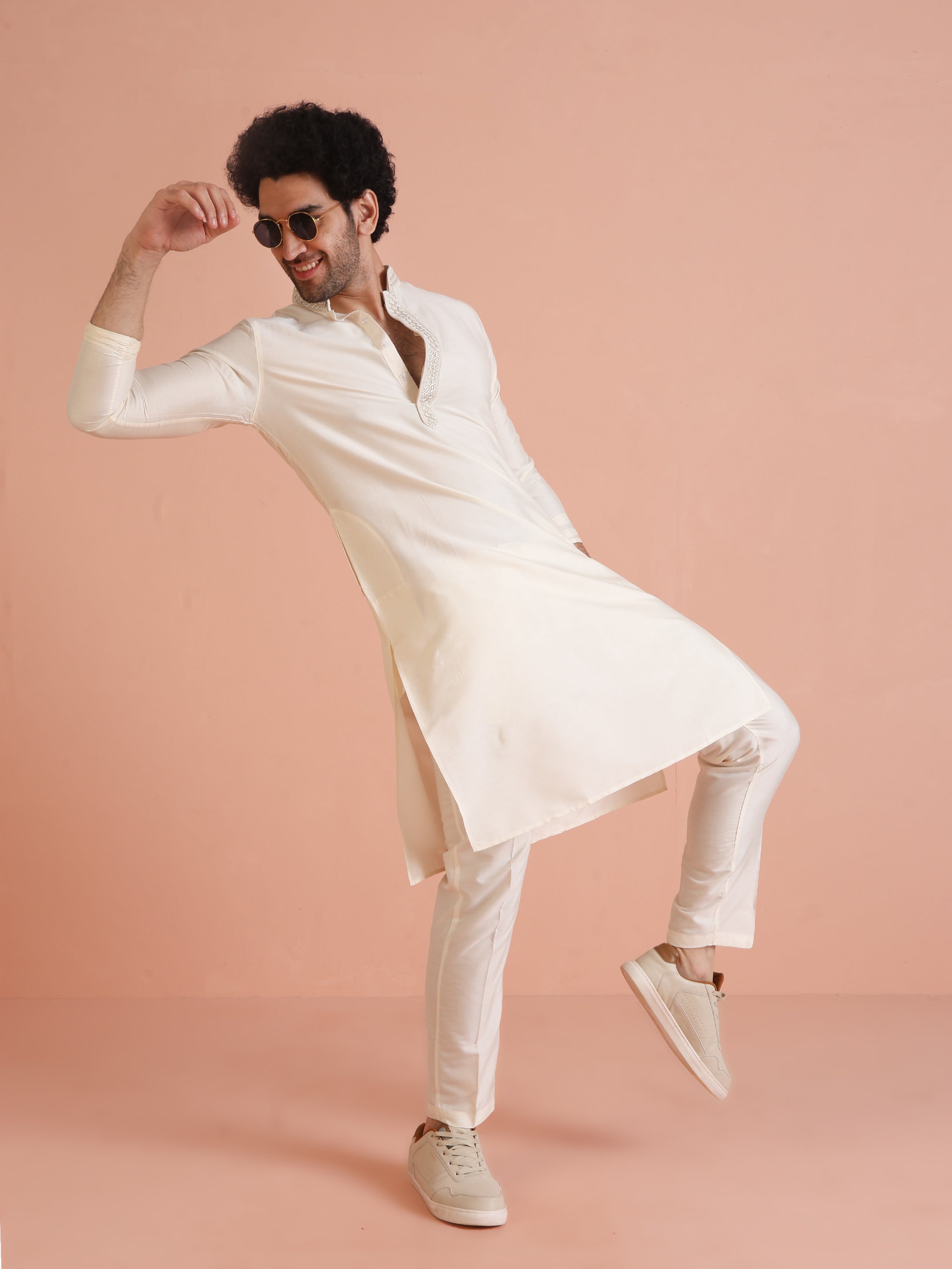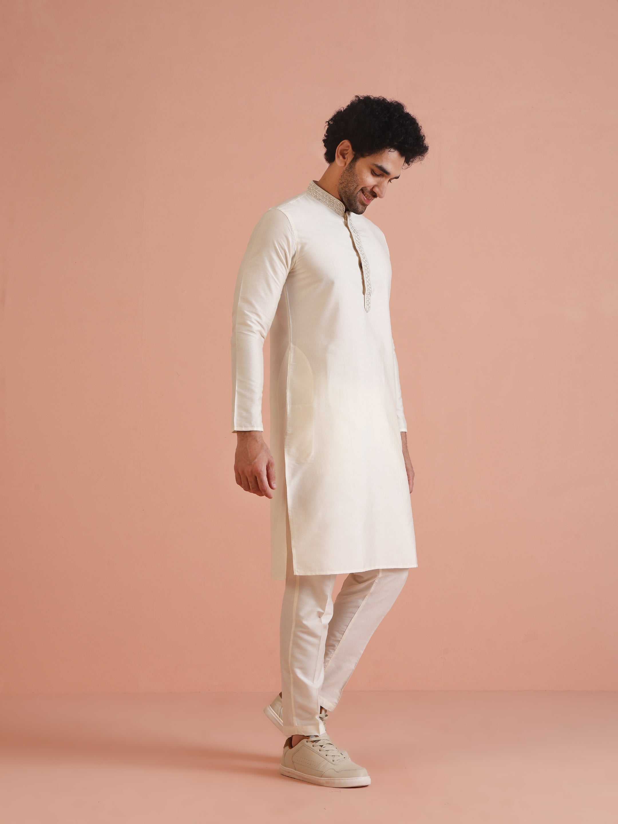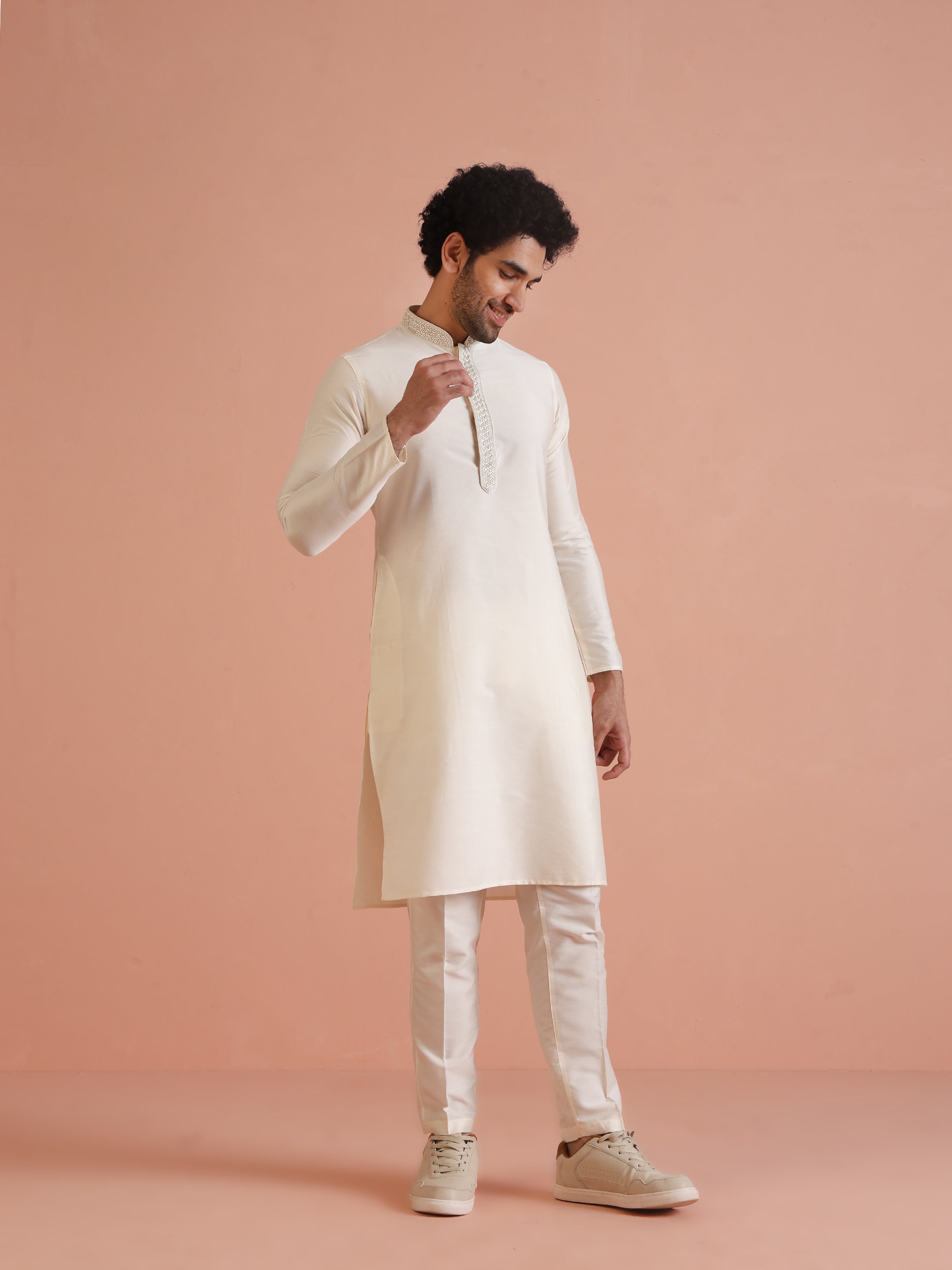 Experience classic elegance with this Kisah Men Off White Solid Dyed Kurta Trouser Set. The breathable fabric ensures comfort throughout the day. Ideal for festive events or casual wear.