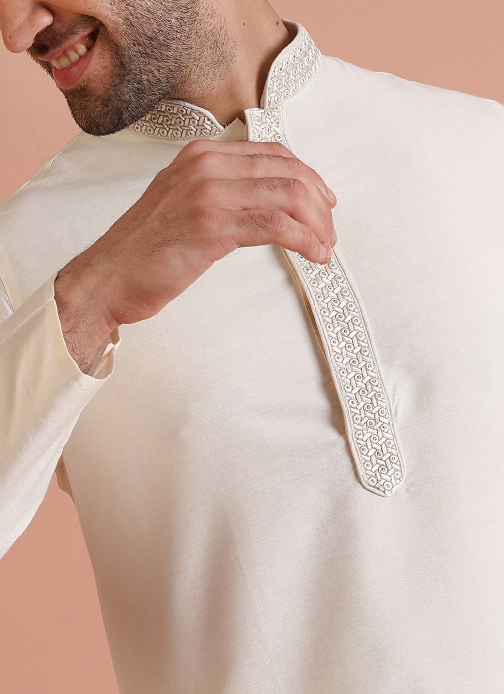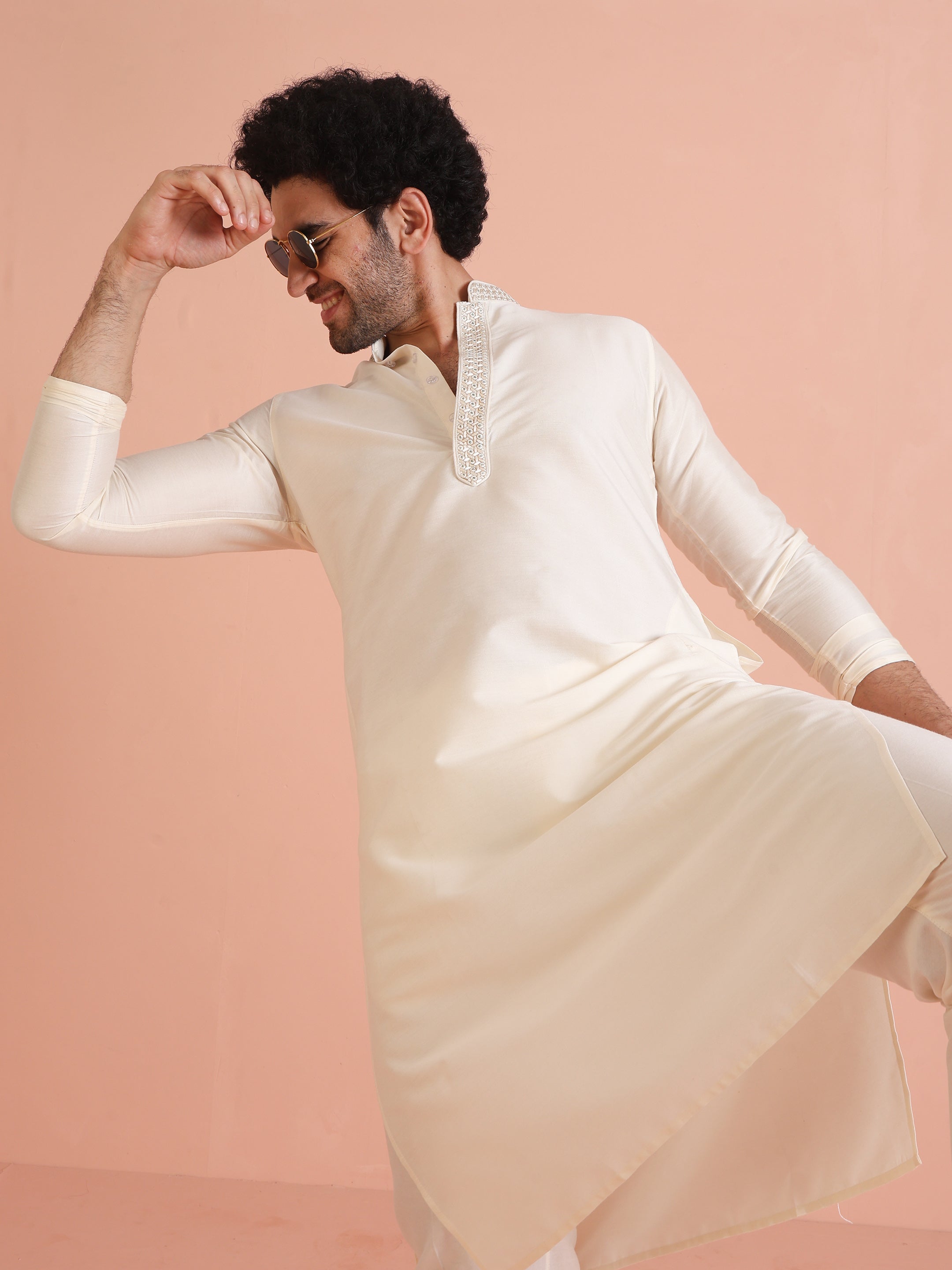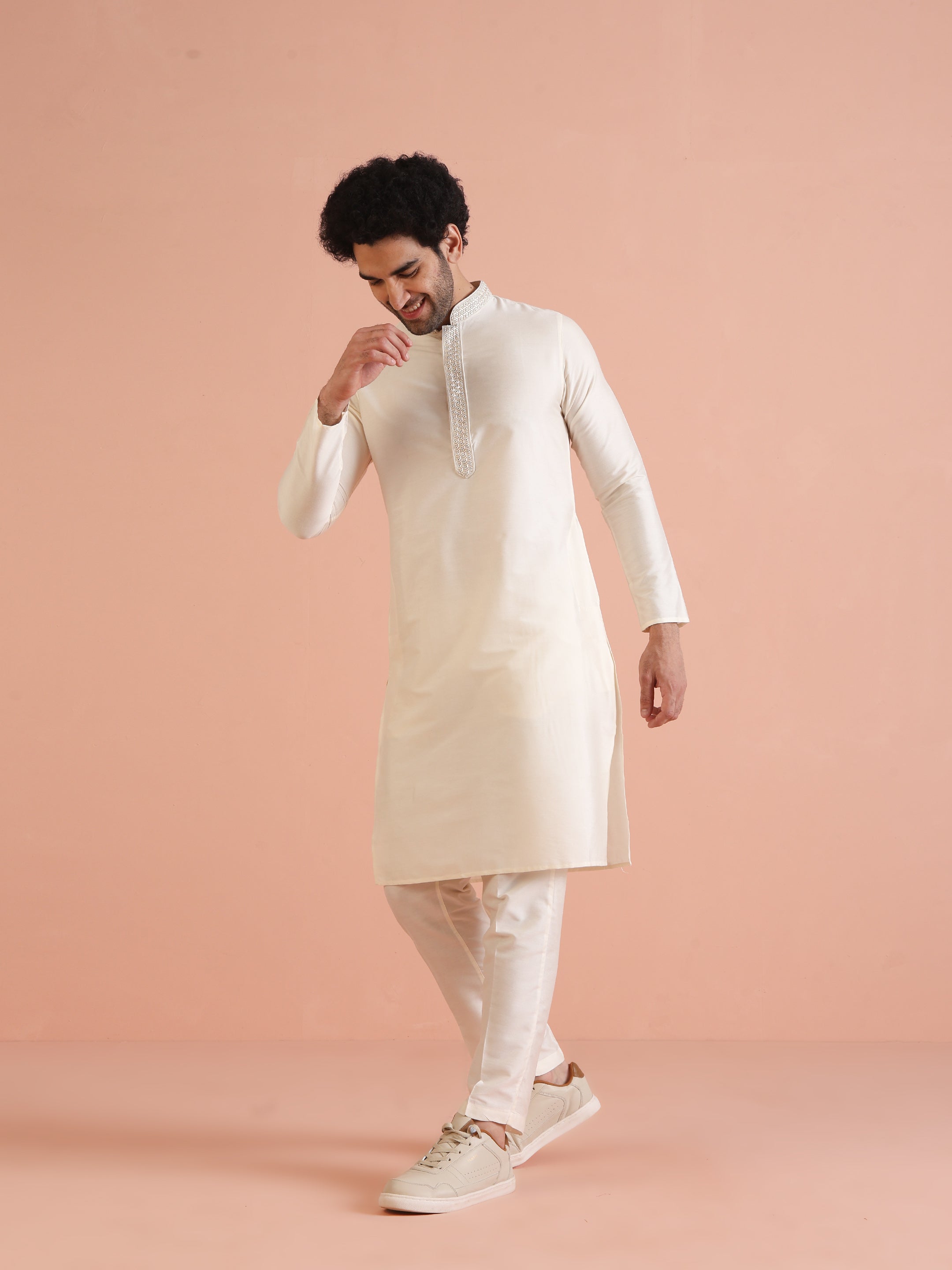 Experience classic elegance with this Kisah Men Off White Solid Dyed Kurta Trouser Set. The breathable fabric ensures comfort throughout the day. Ideal for festive events or casual wear.