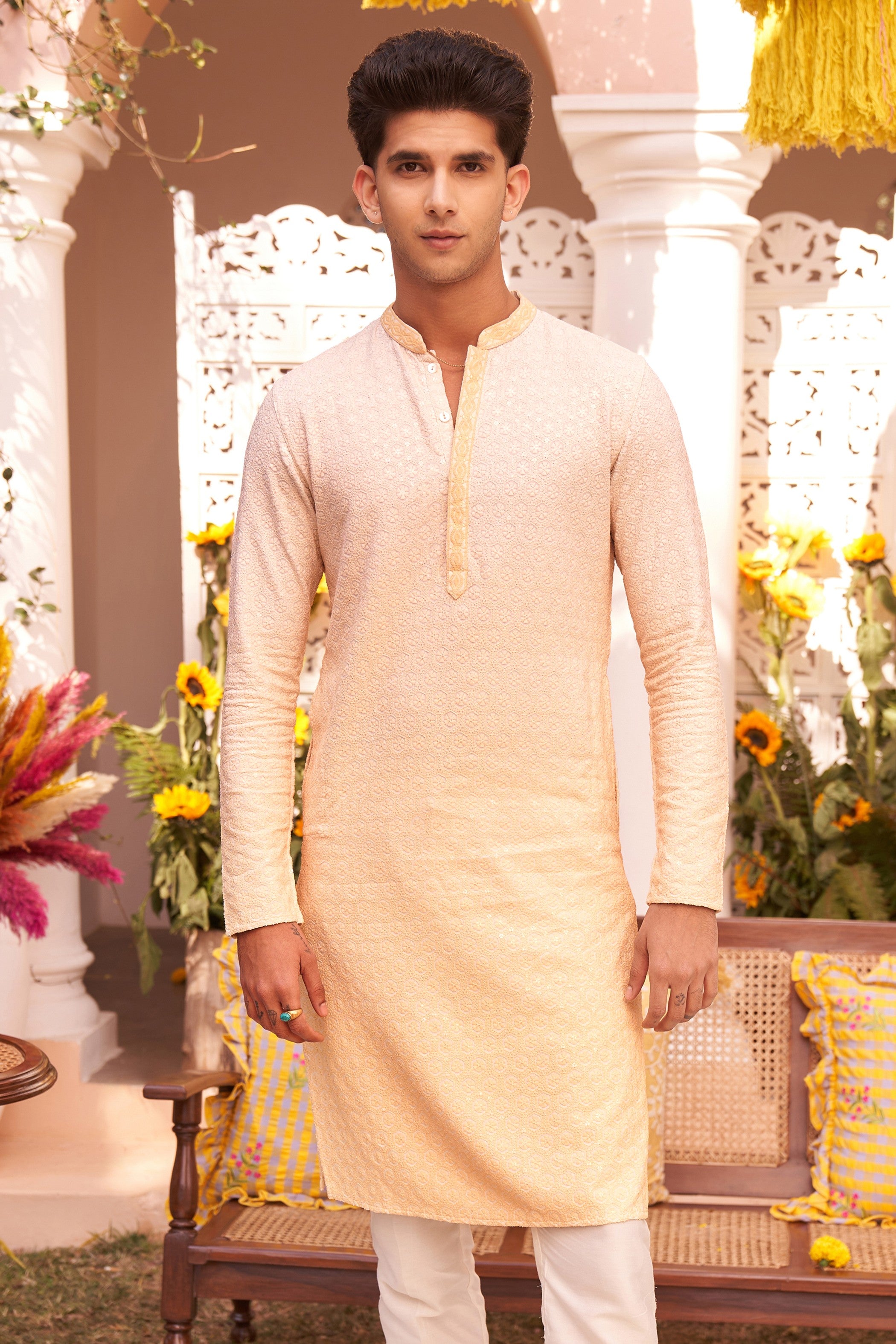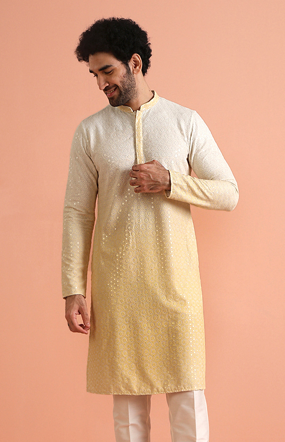 Experience classic elegance with this Men's Yellow Color Cotton Blend Kurta. The Embellished Pattern adds a refined touch, while the breathable fabric ensures comfort throughout the day. Ideal for festive events or casual wear, this Kurta is a wardrobe essential.