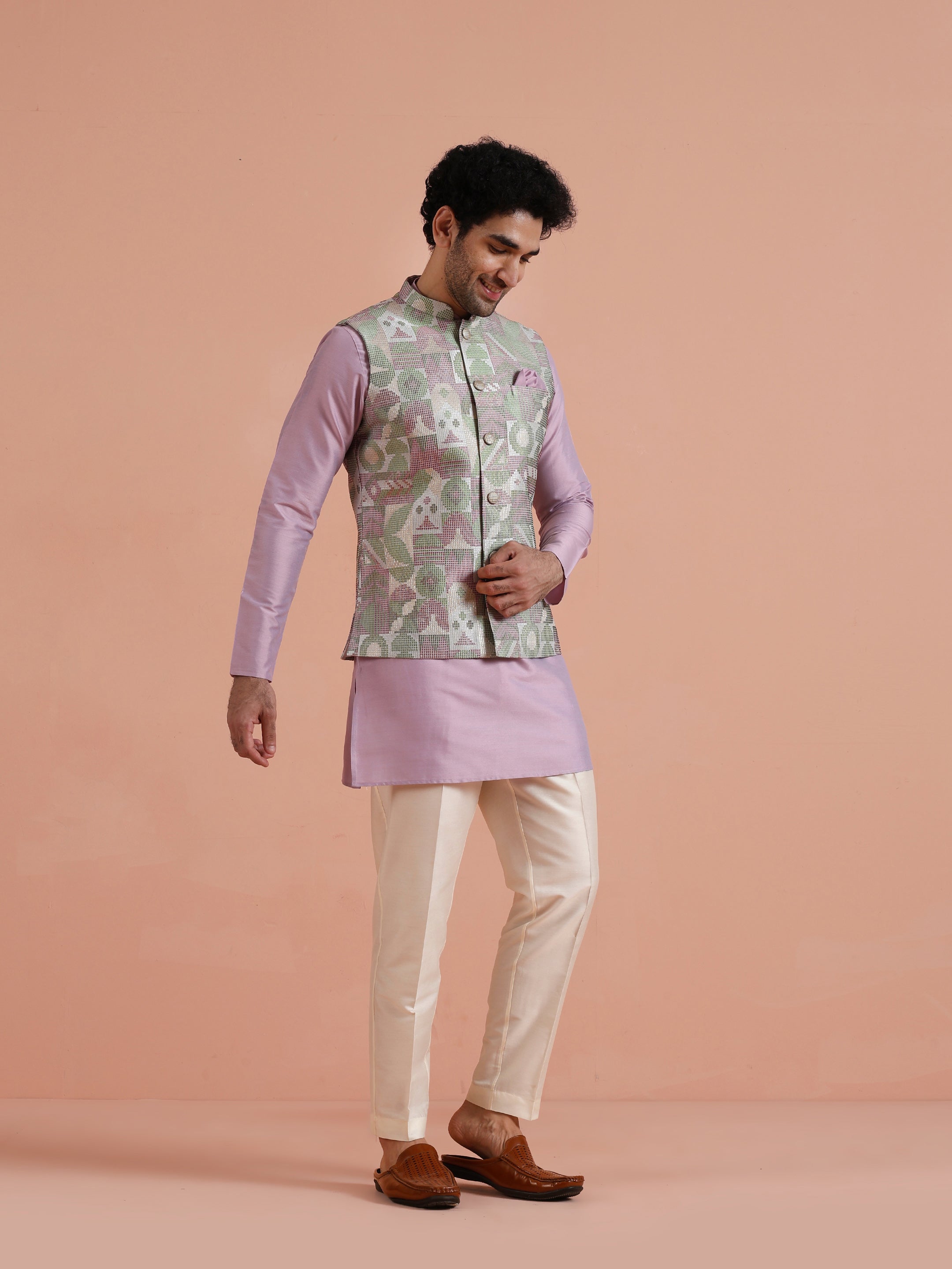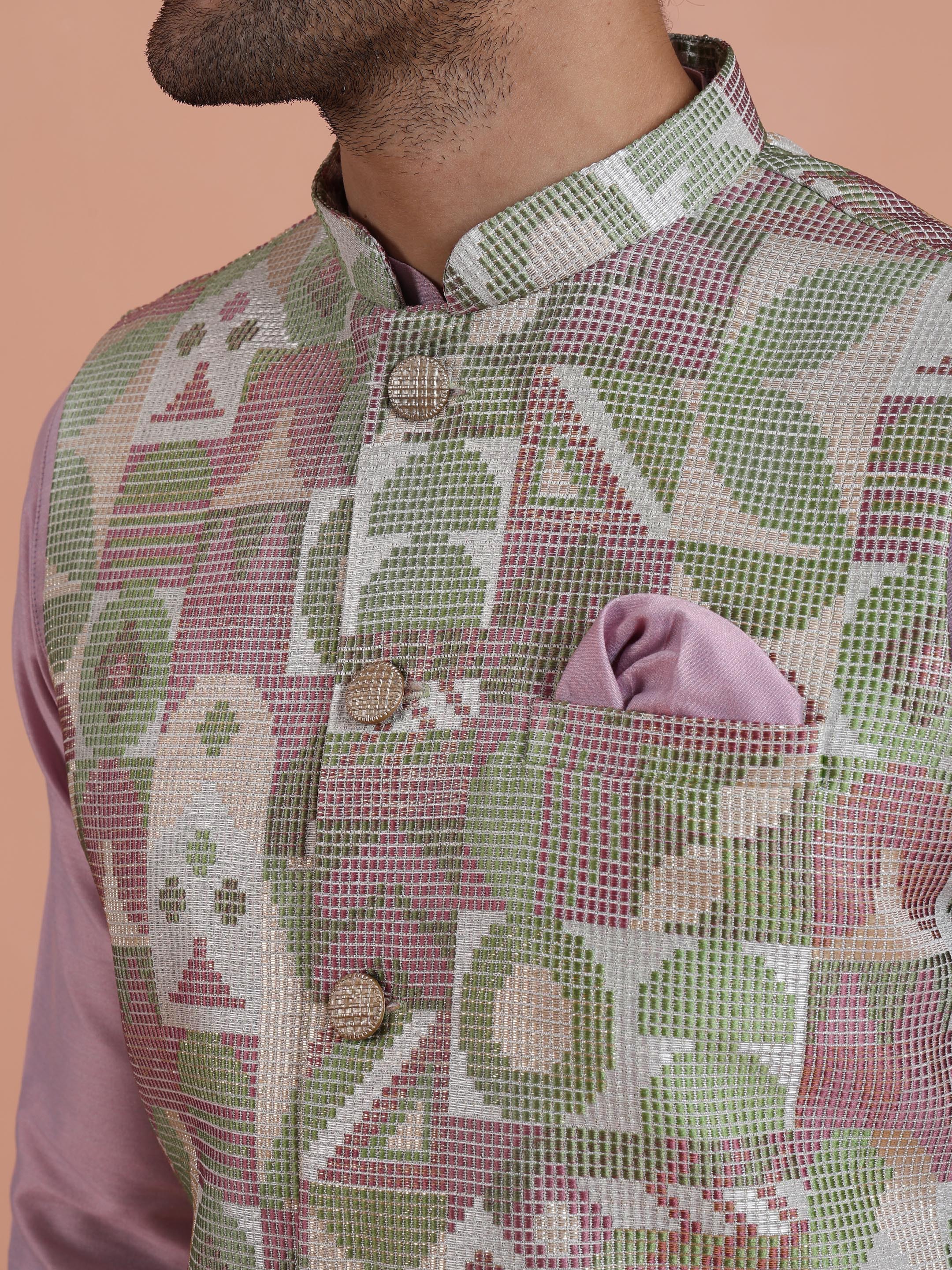 Lavender silk blend kurta set with pastel printed Nehru jacket and cream trouser stylish festive and wedding wear for men, perfect for all celebrations.