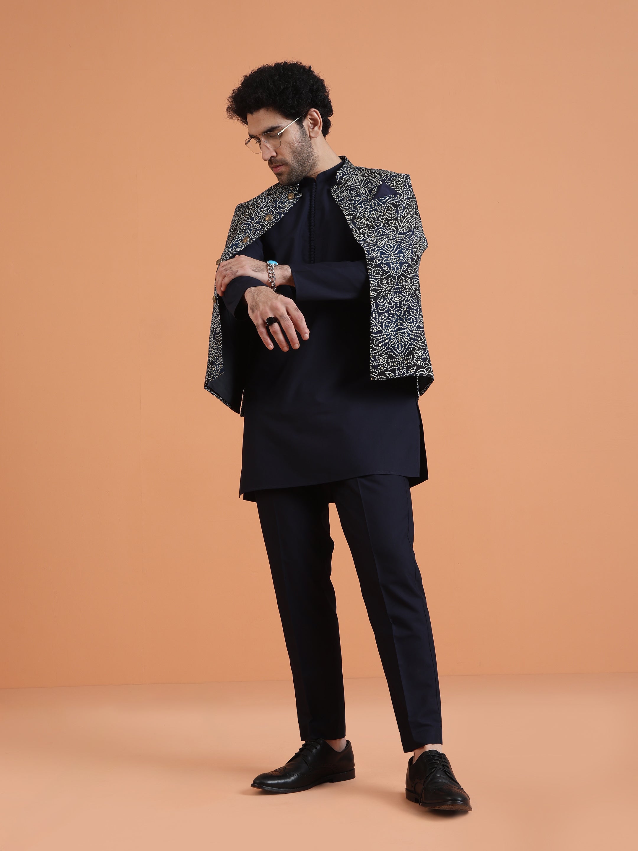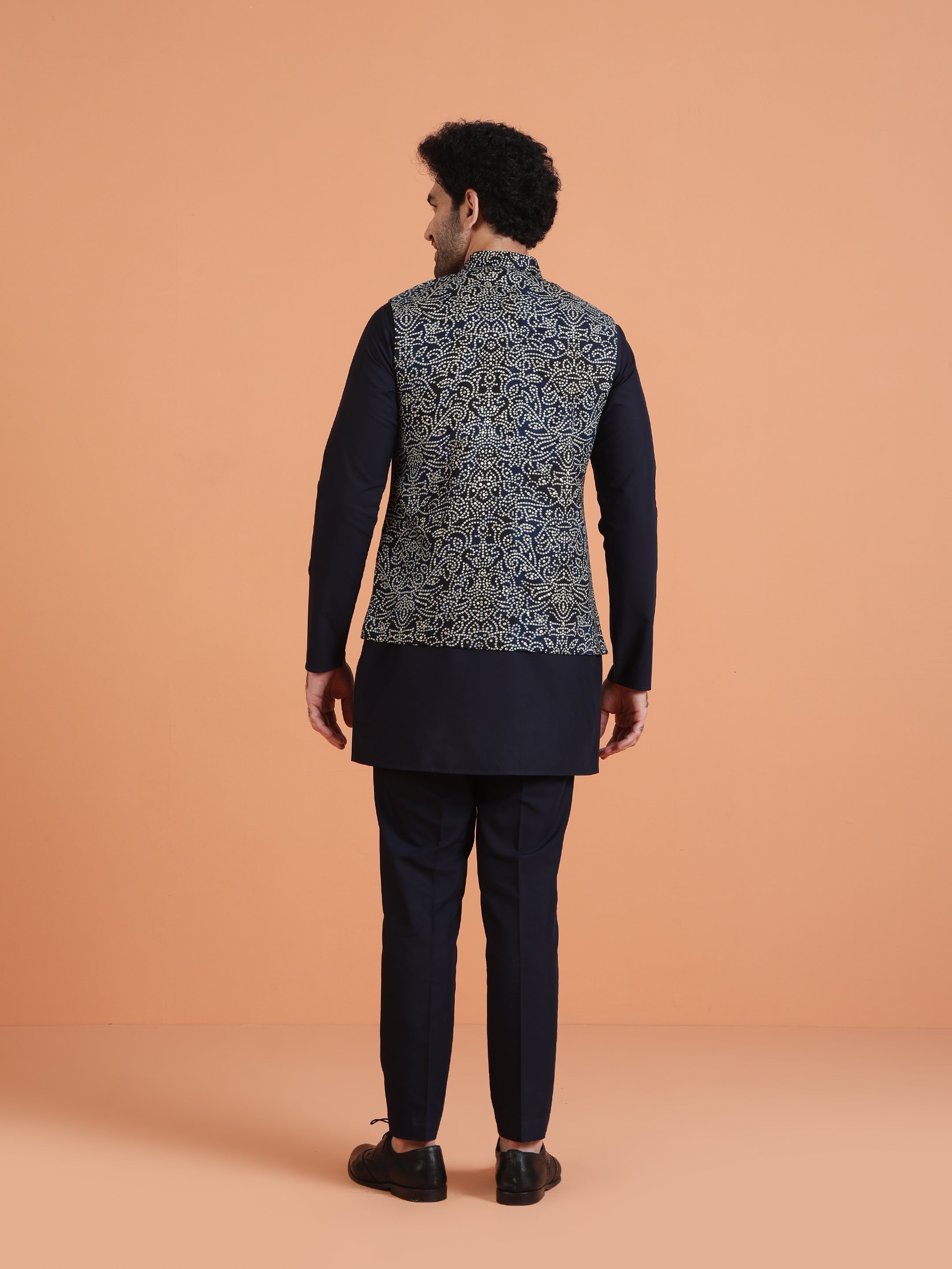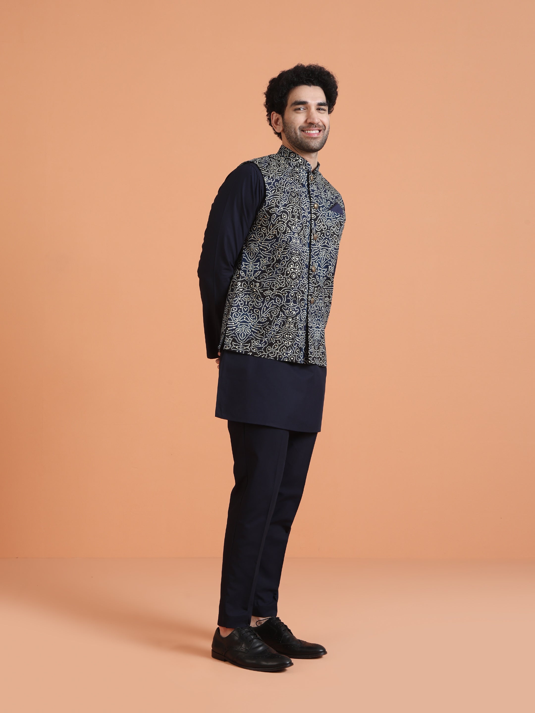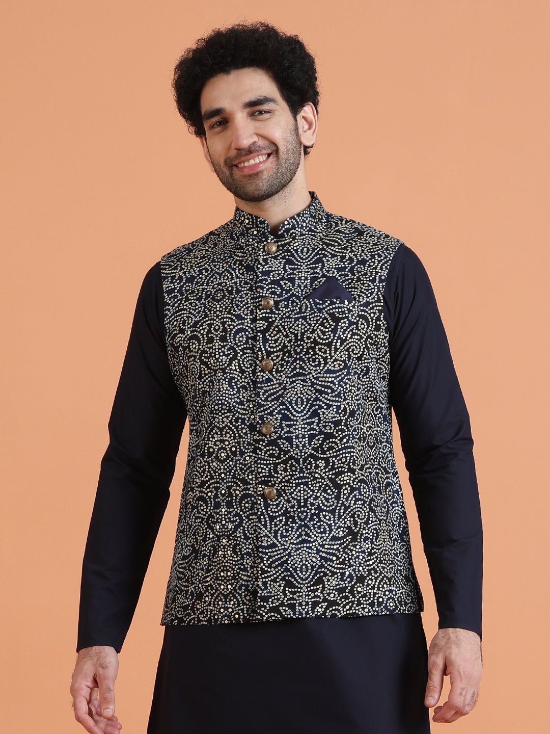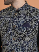 Kisah navy blue embroidered printed Nehru jacket in silk blend. Pair with kurta pyjama or trousers for weddings, sangeet, festive and reception looks.