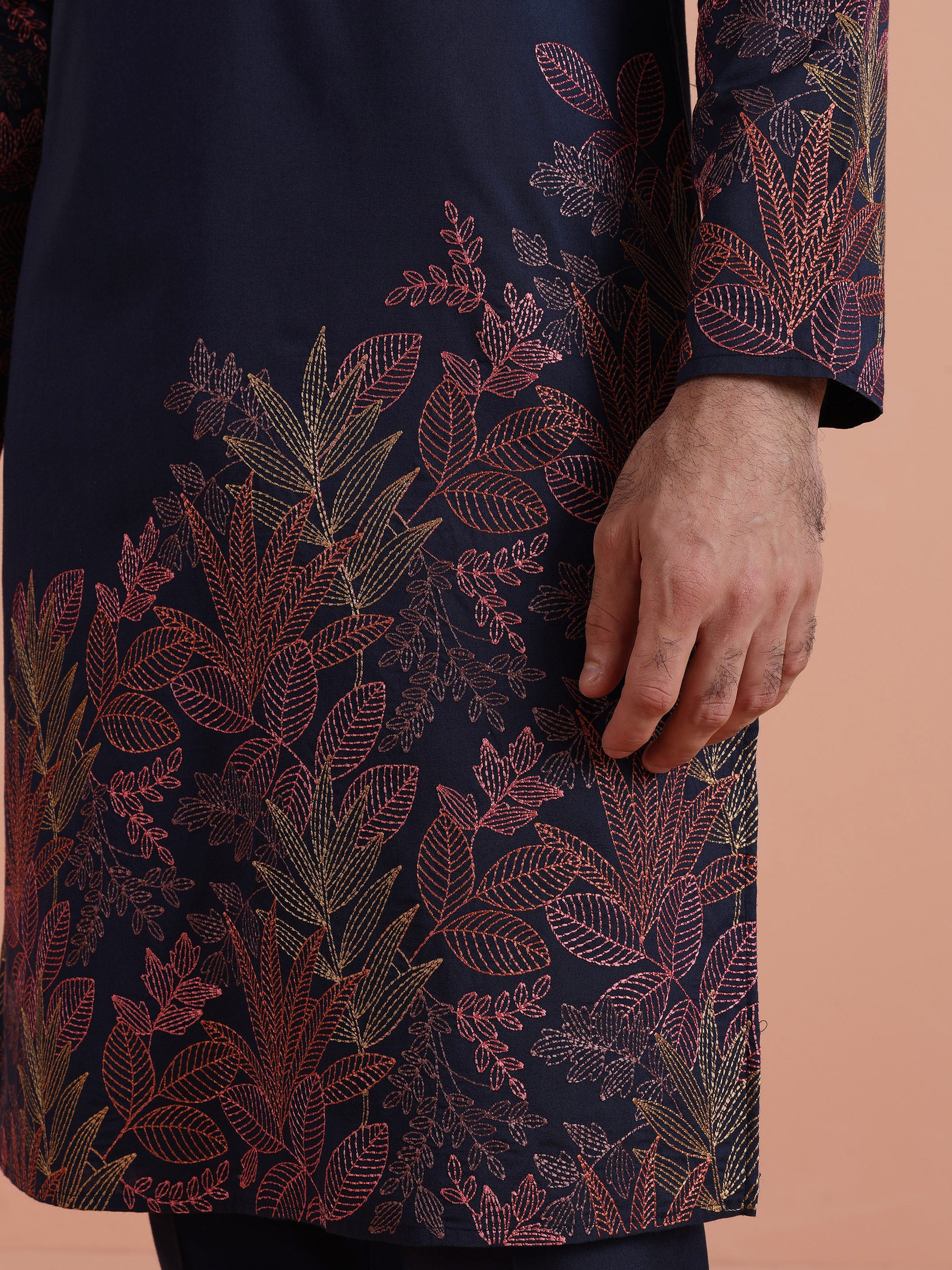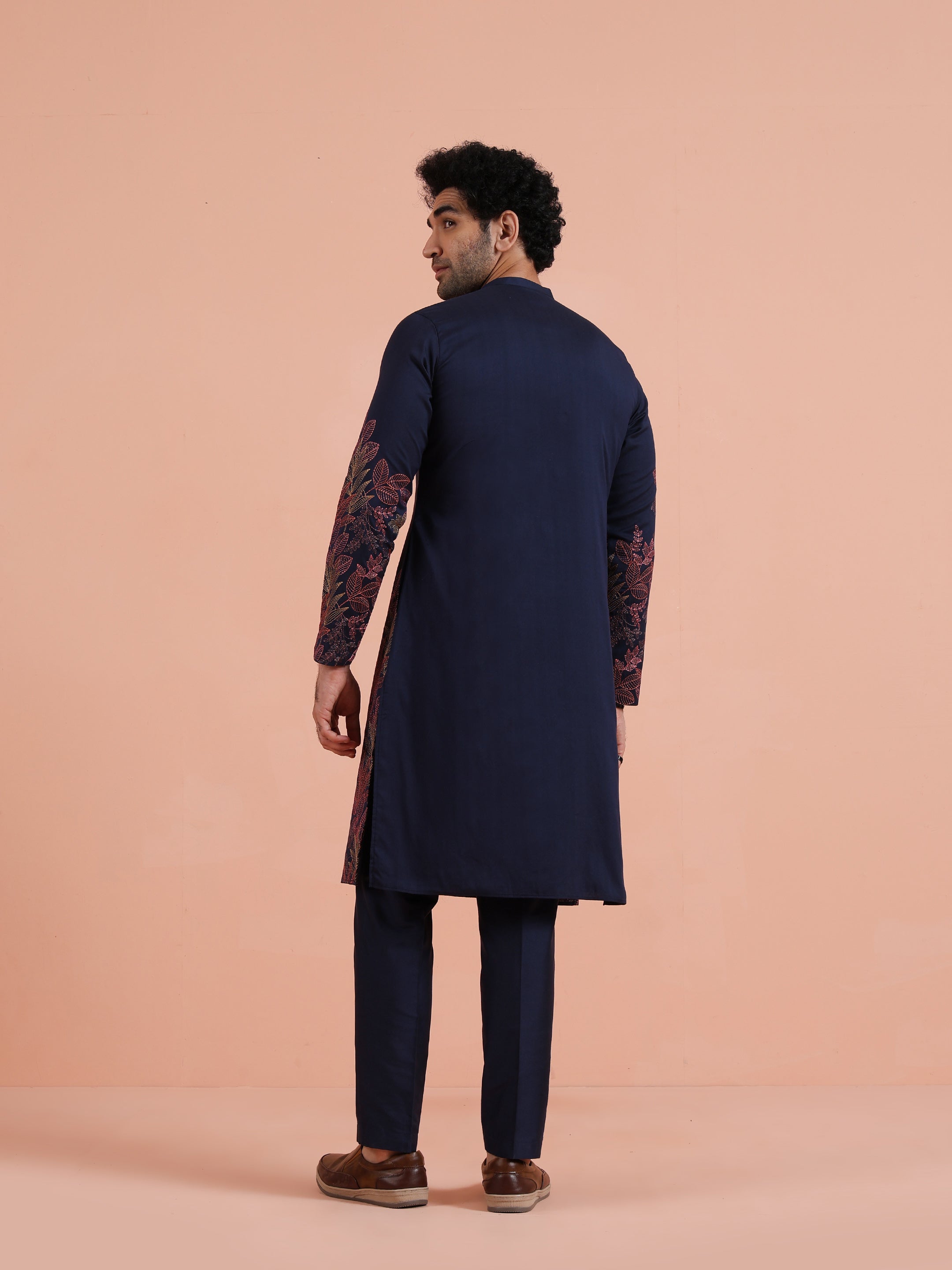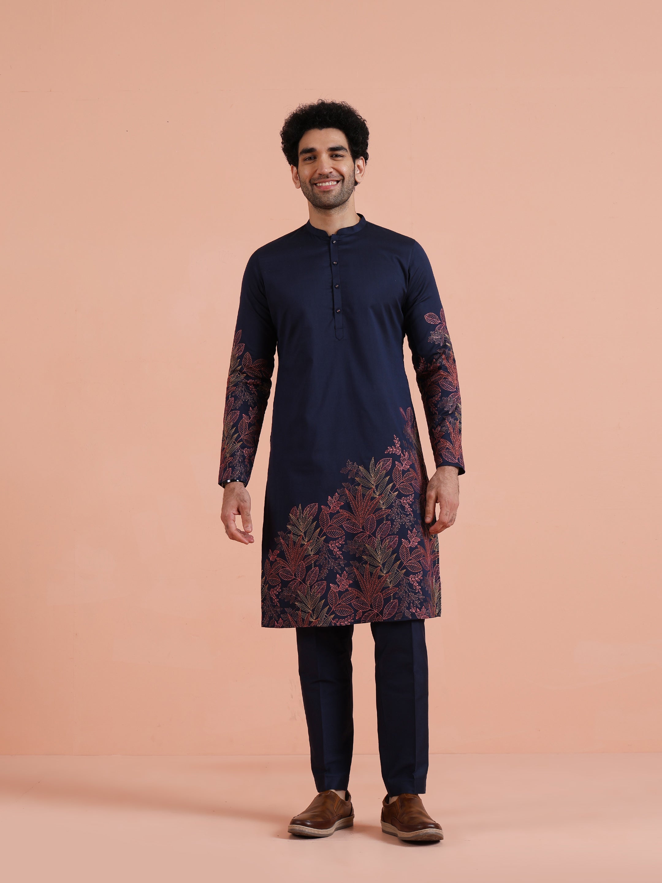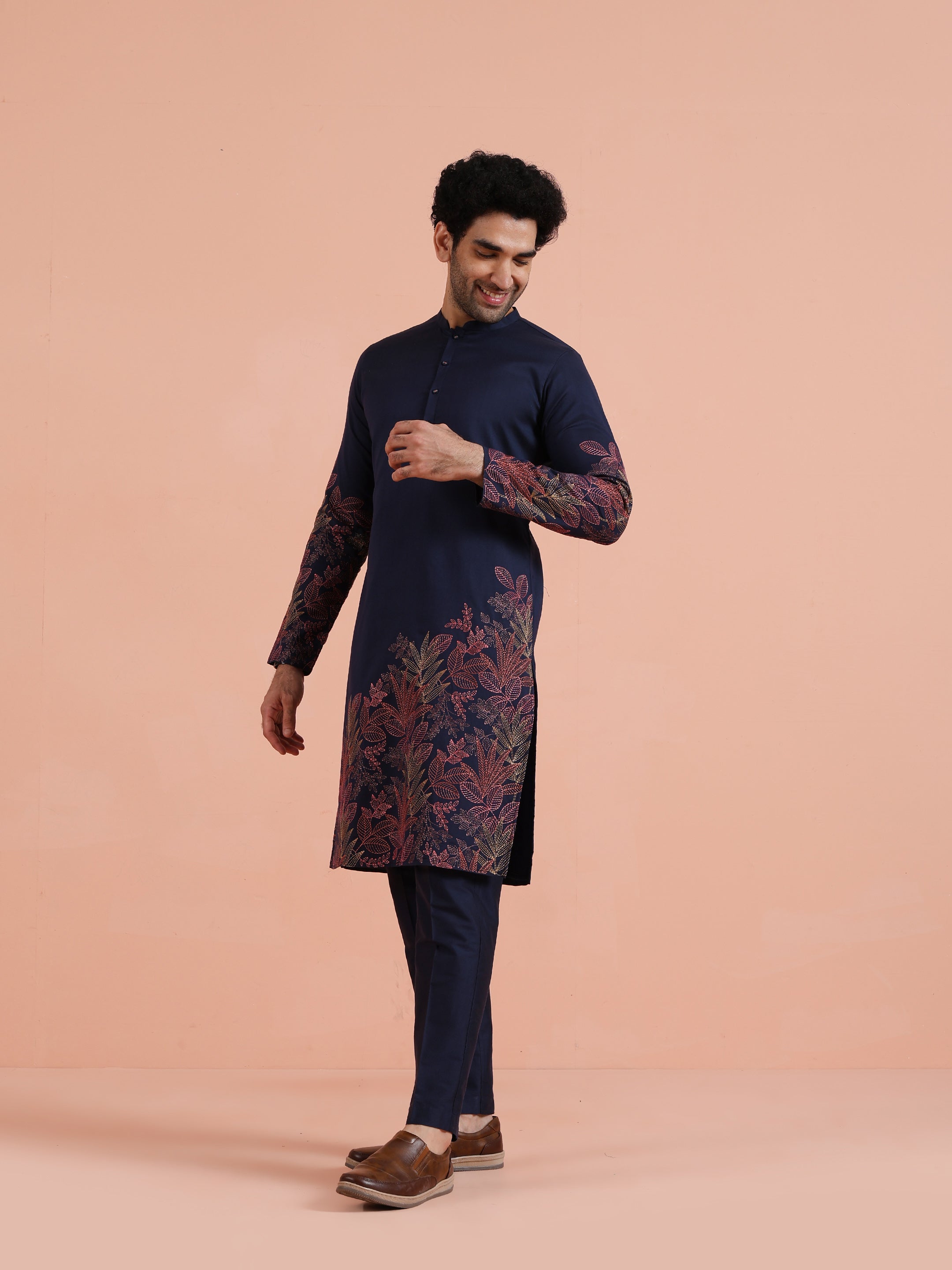 Kisah Menss Navy Embroidered Kurta elegant floral embroidery on hem and sleeves. Perfect festive kurta for weddings, receptions, and evening gatherings.