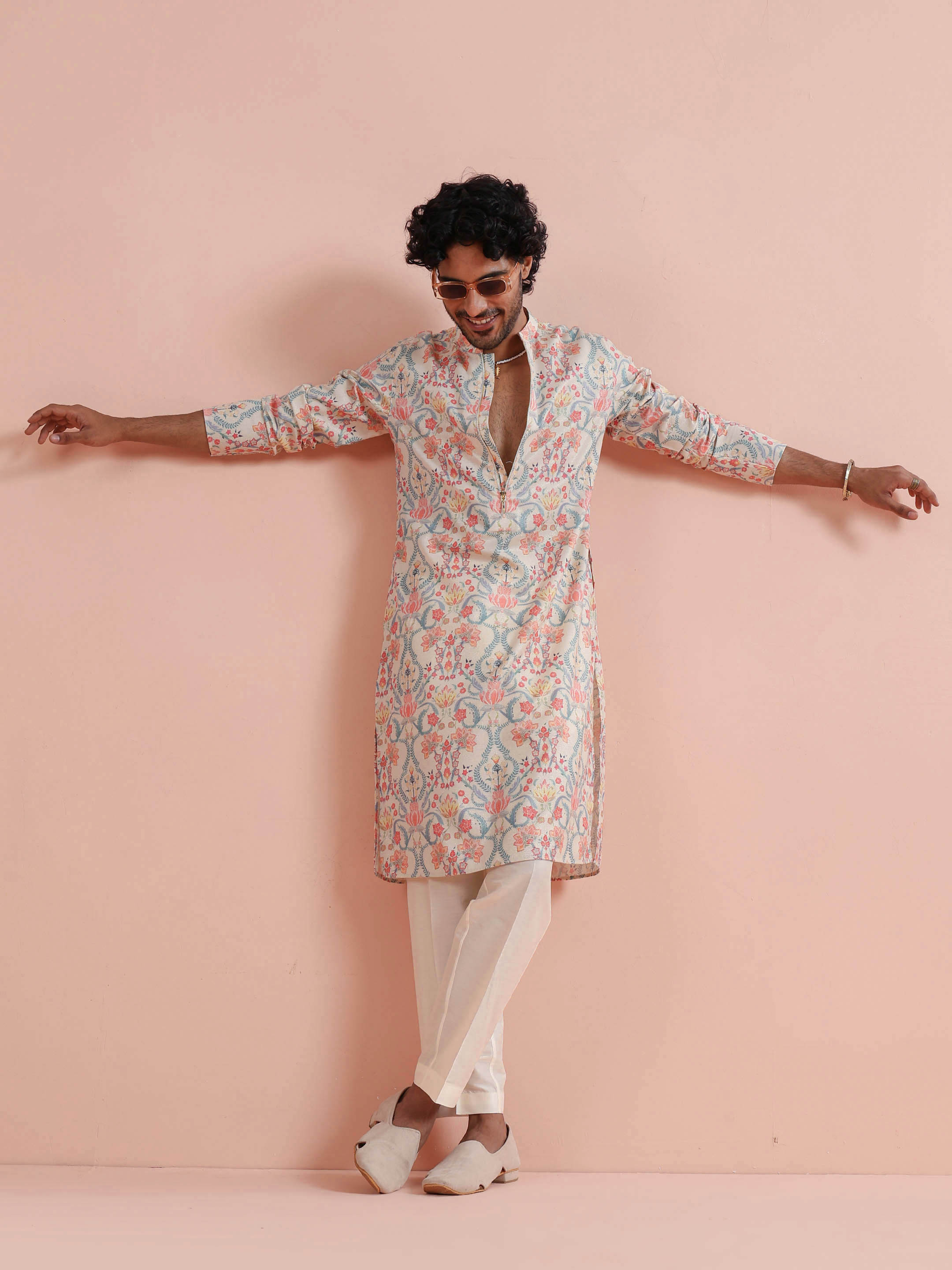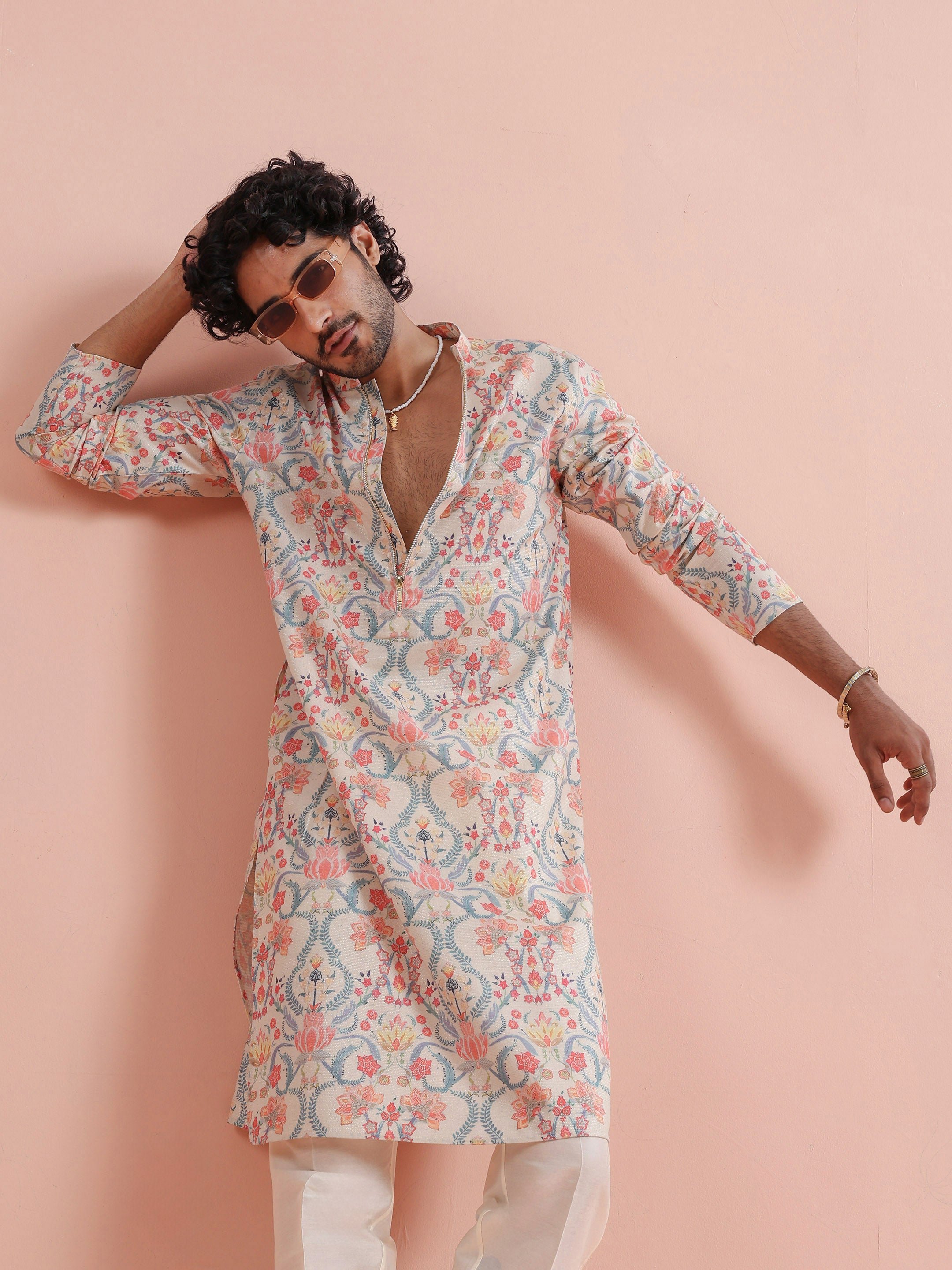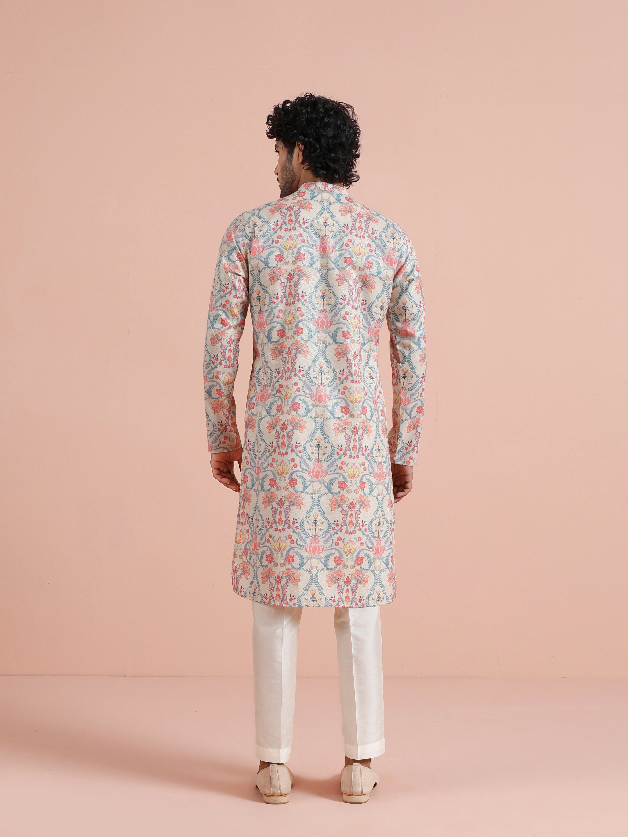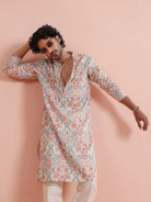Kisah Menss Pastel Floral Printed Kurta elegant pastel florals with a modern open neckline. Perfect for daytime weddings, festive brunches, and summer celebrations.