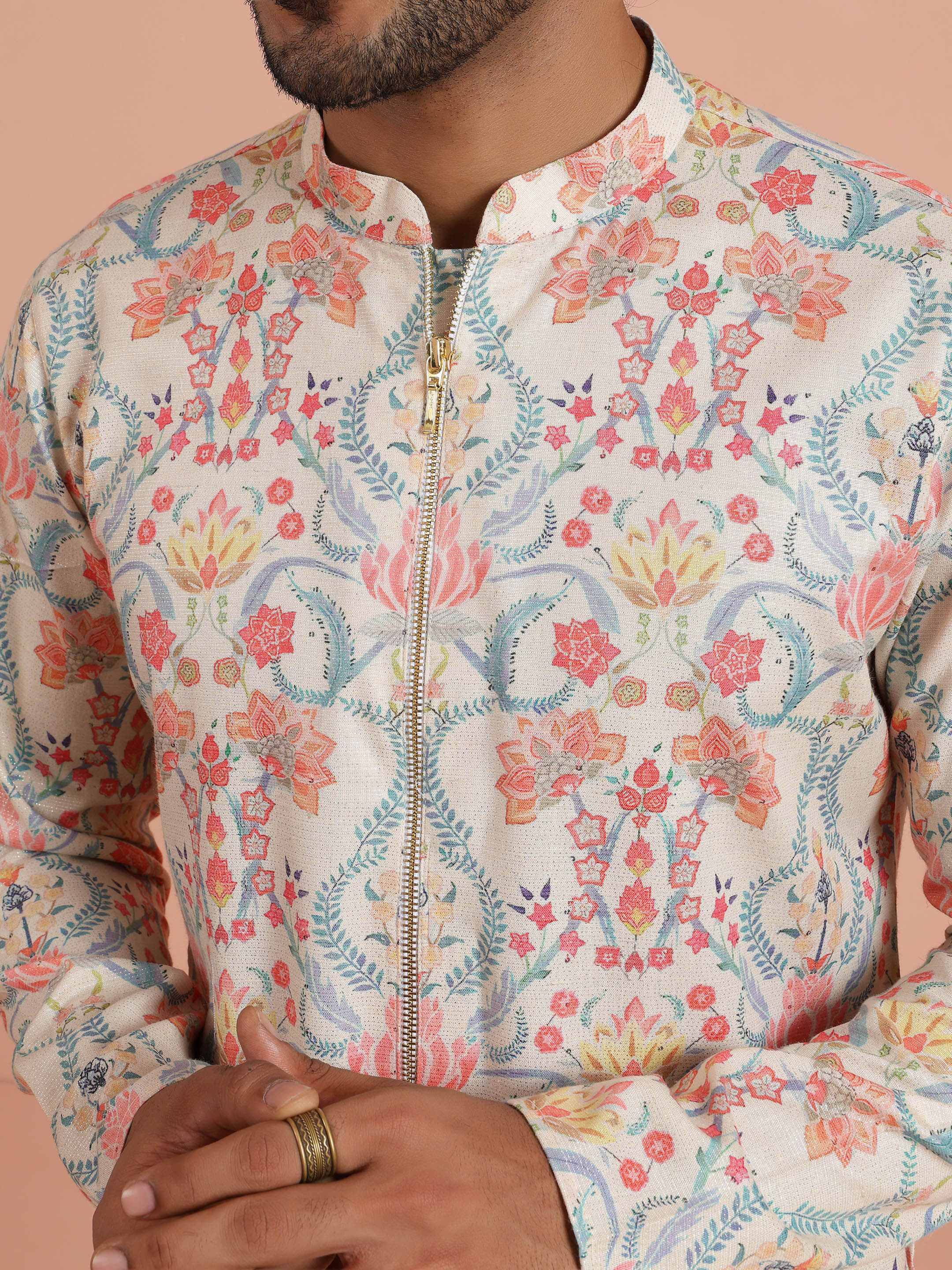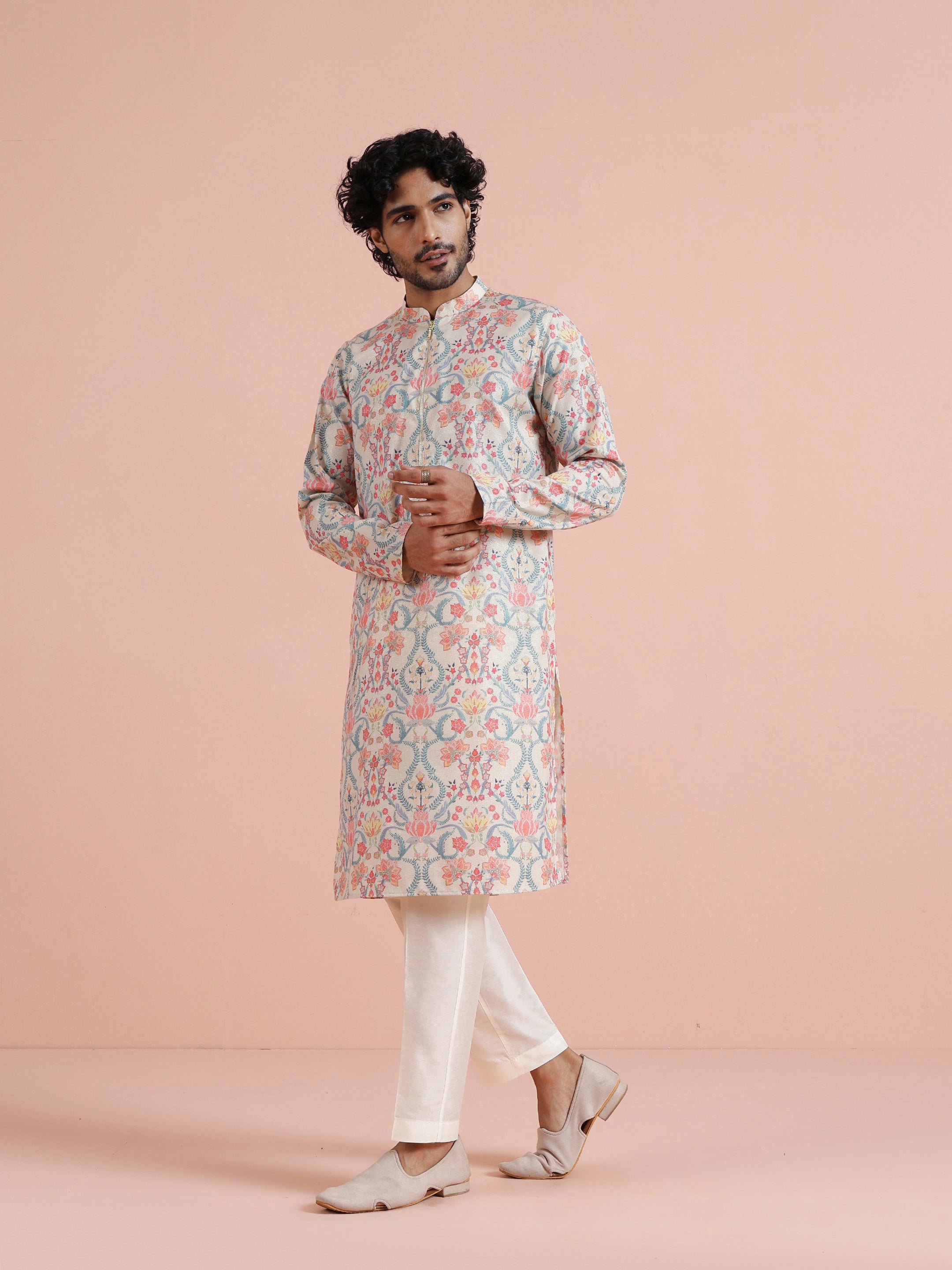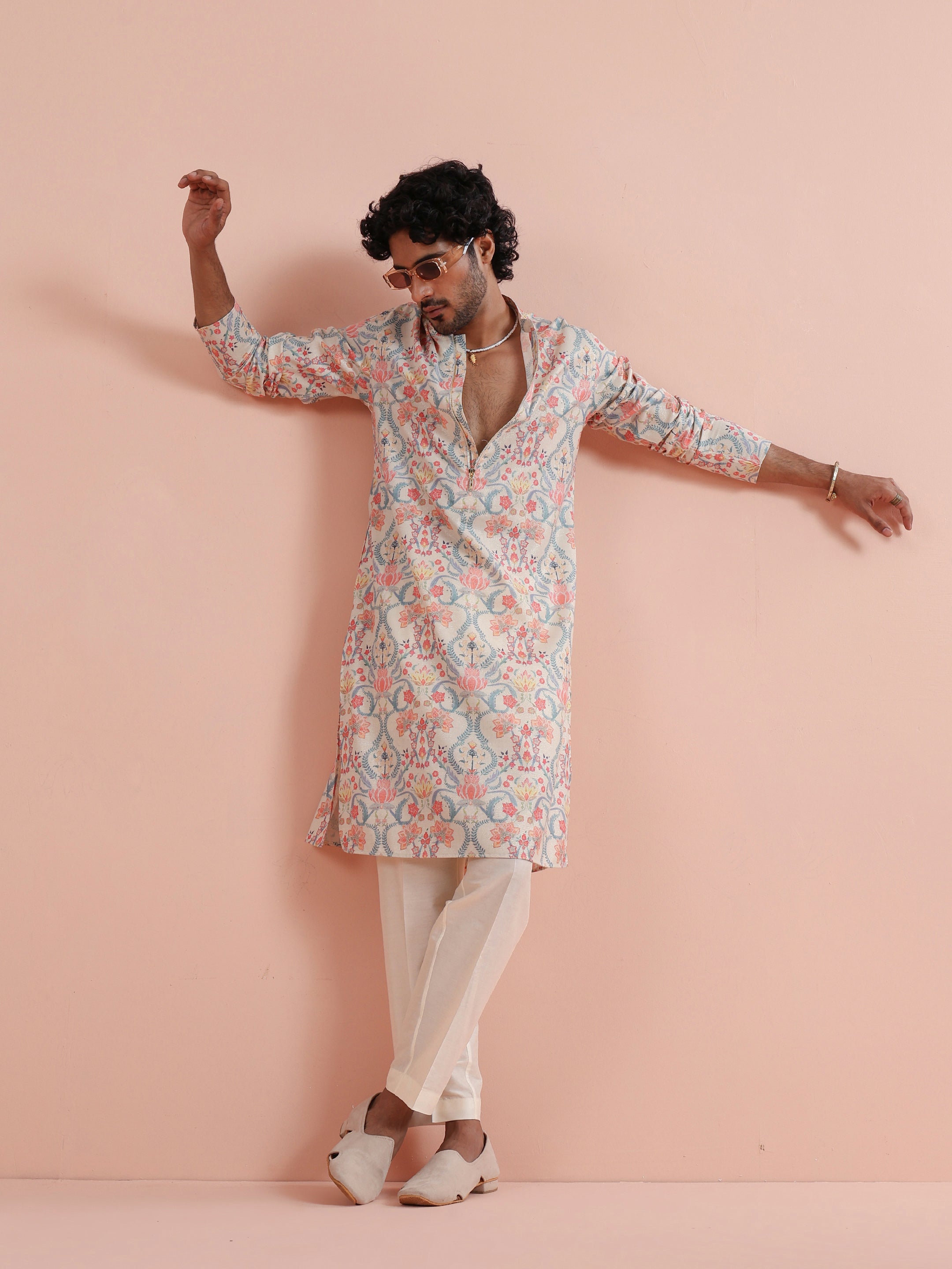 Kisah Menss Pastel Floral Printed Kurta elegant pastel florals with a modern open neckline. Perfect for daytime weddings, festive brunches, and summer celebrations.