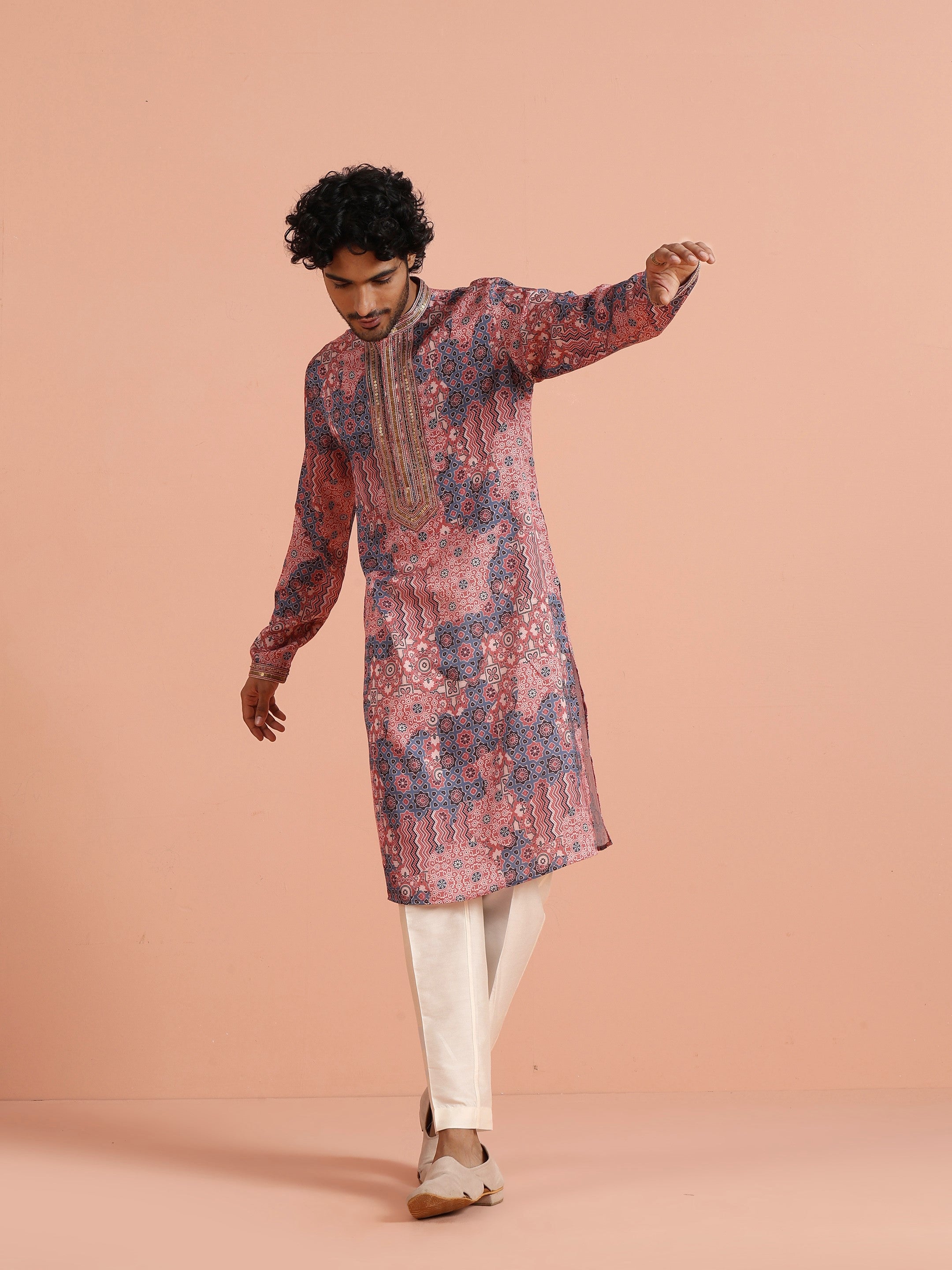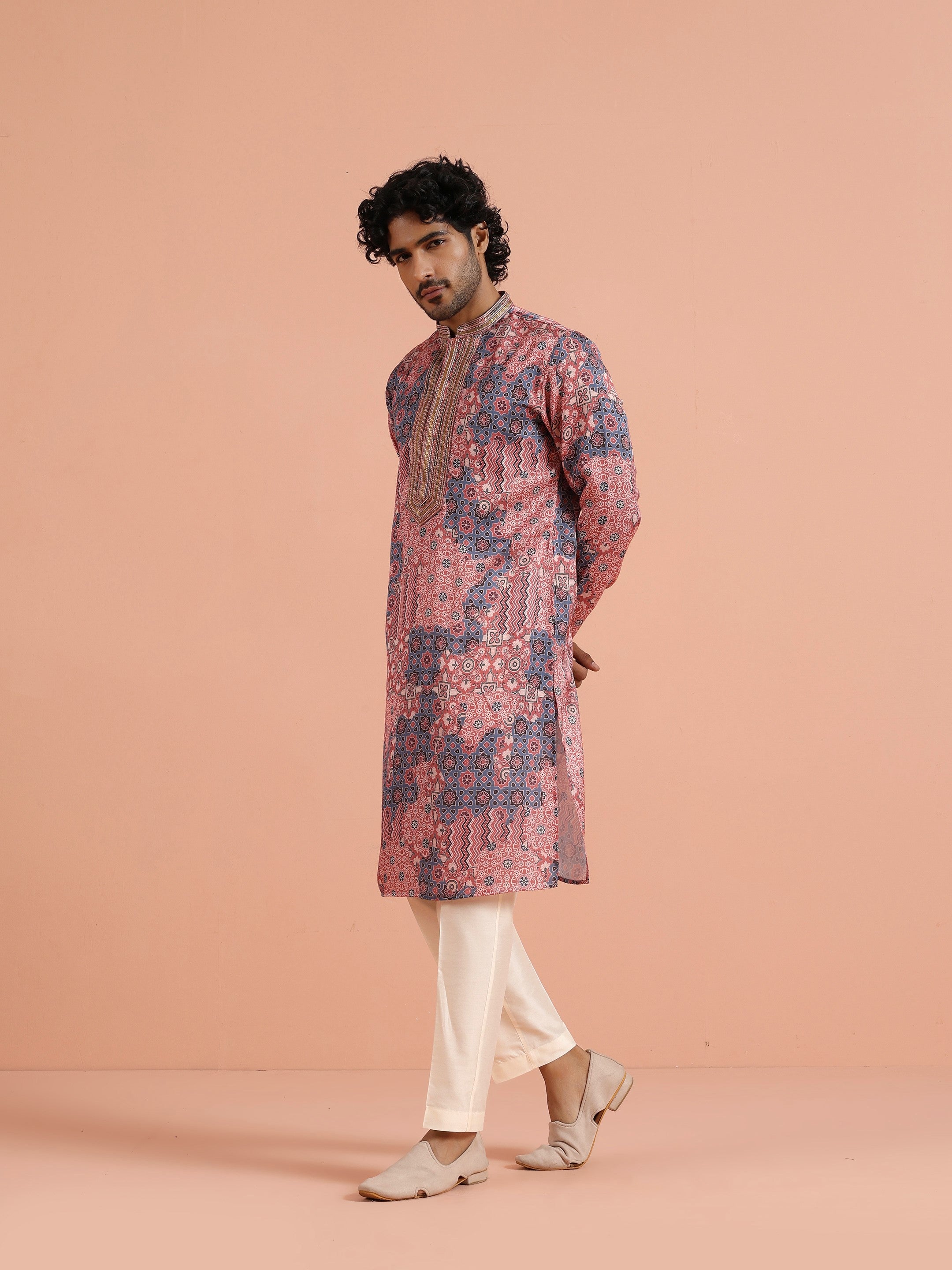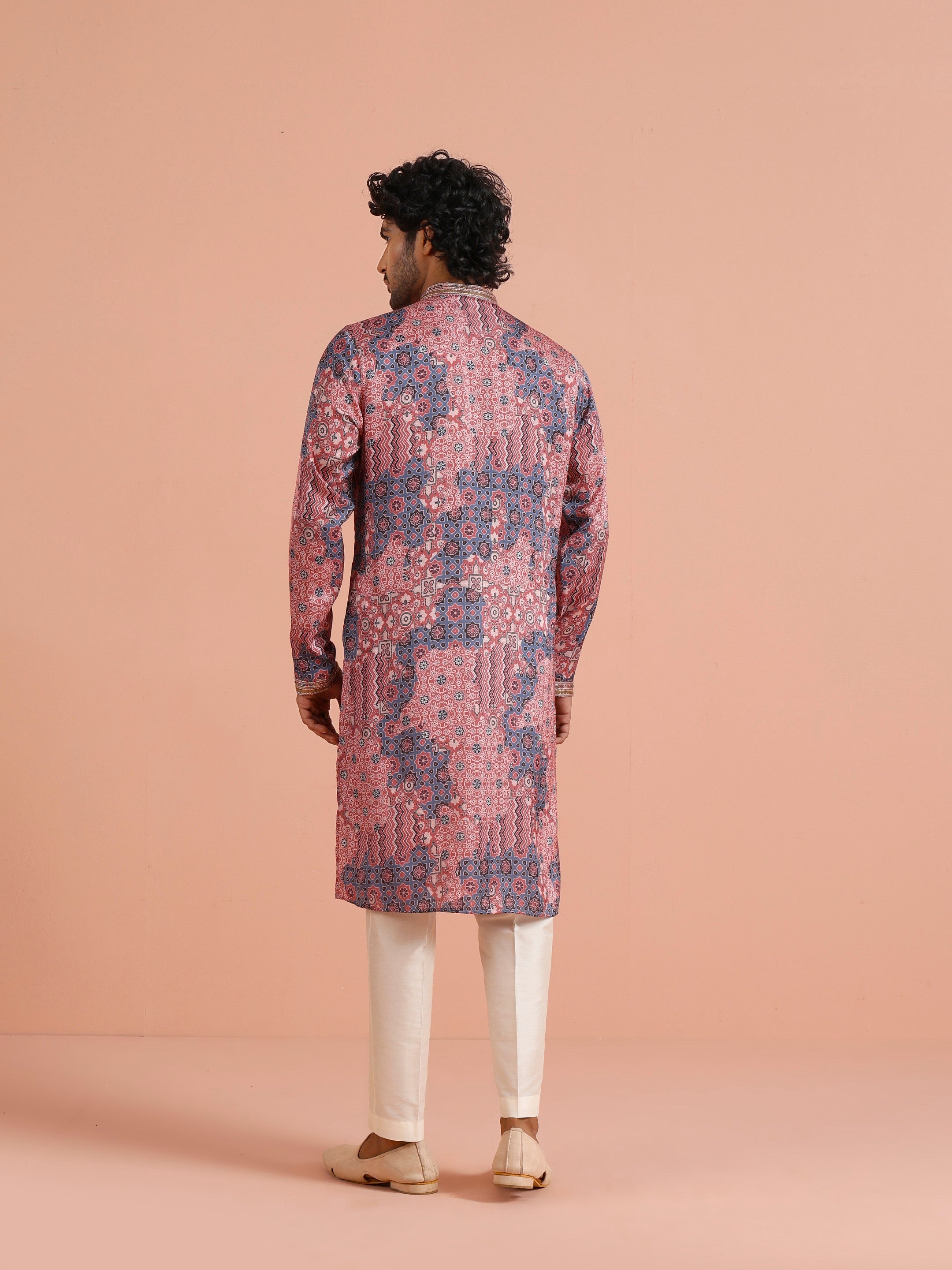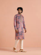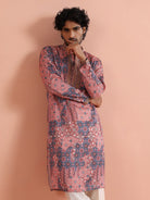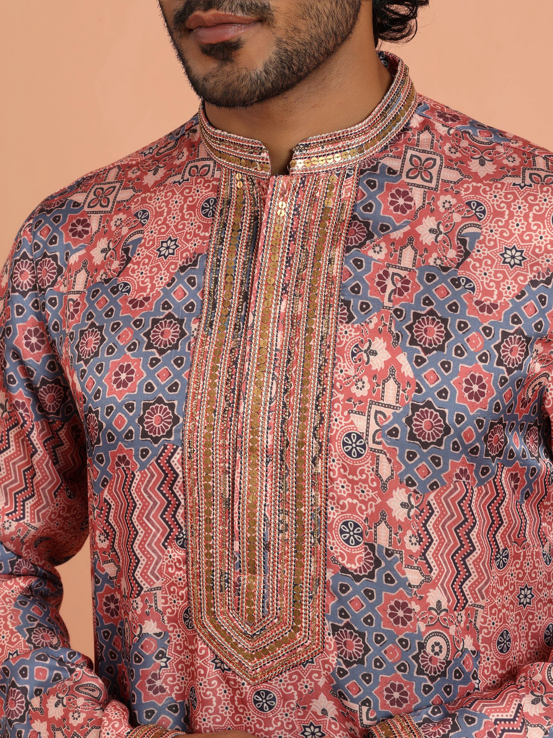 Kisah Menss Peach Printed Kurta vibrant geometric ethnic design with modern flair. Perfect for weddings, festive celebrations, or casual parties.