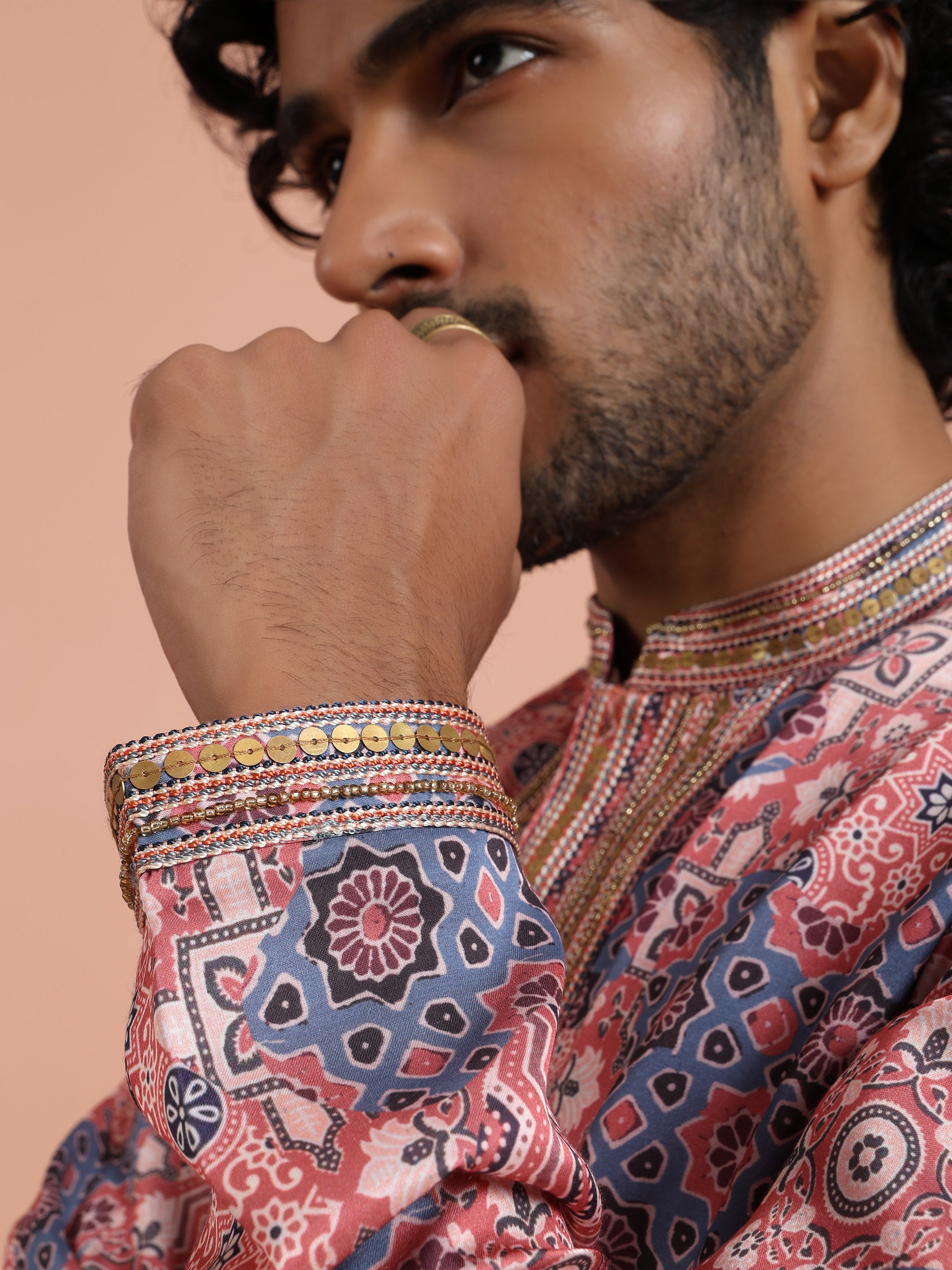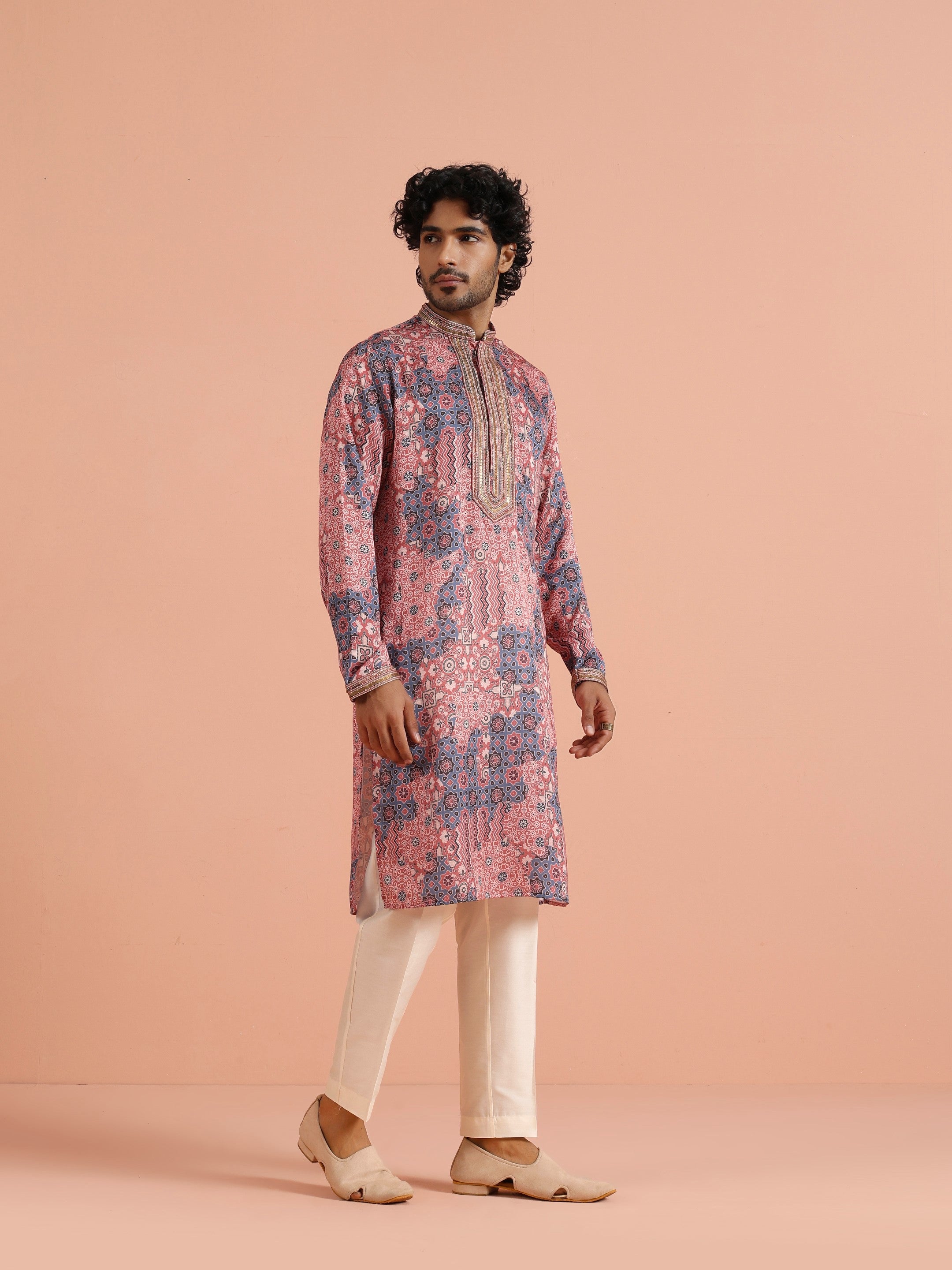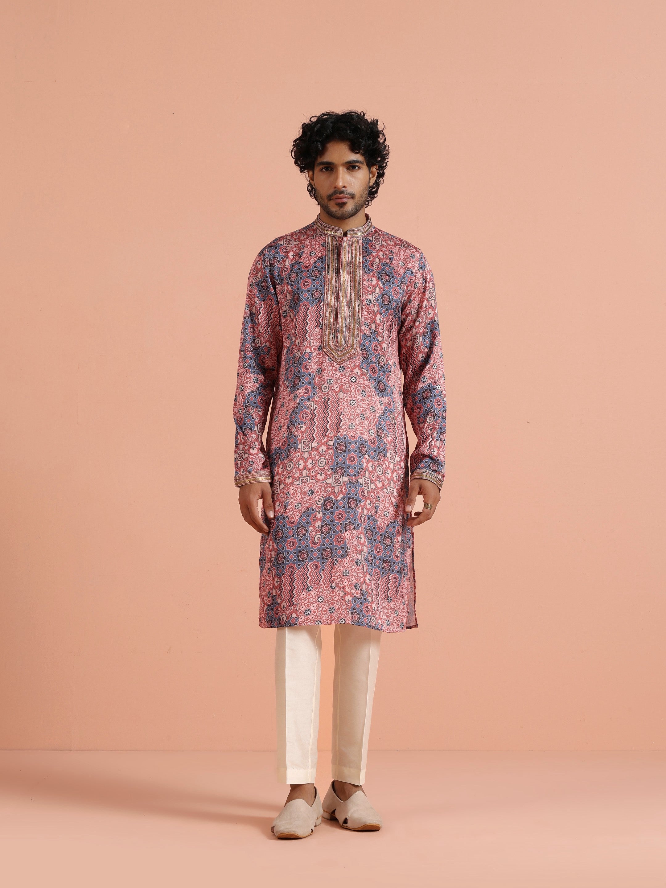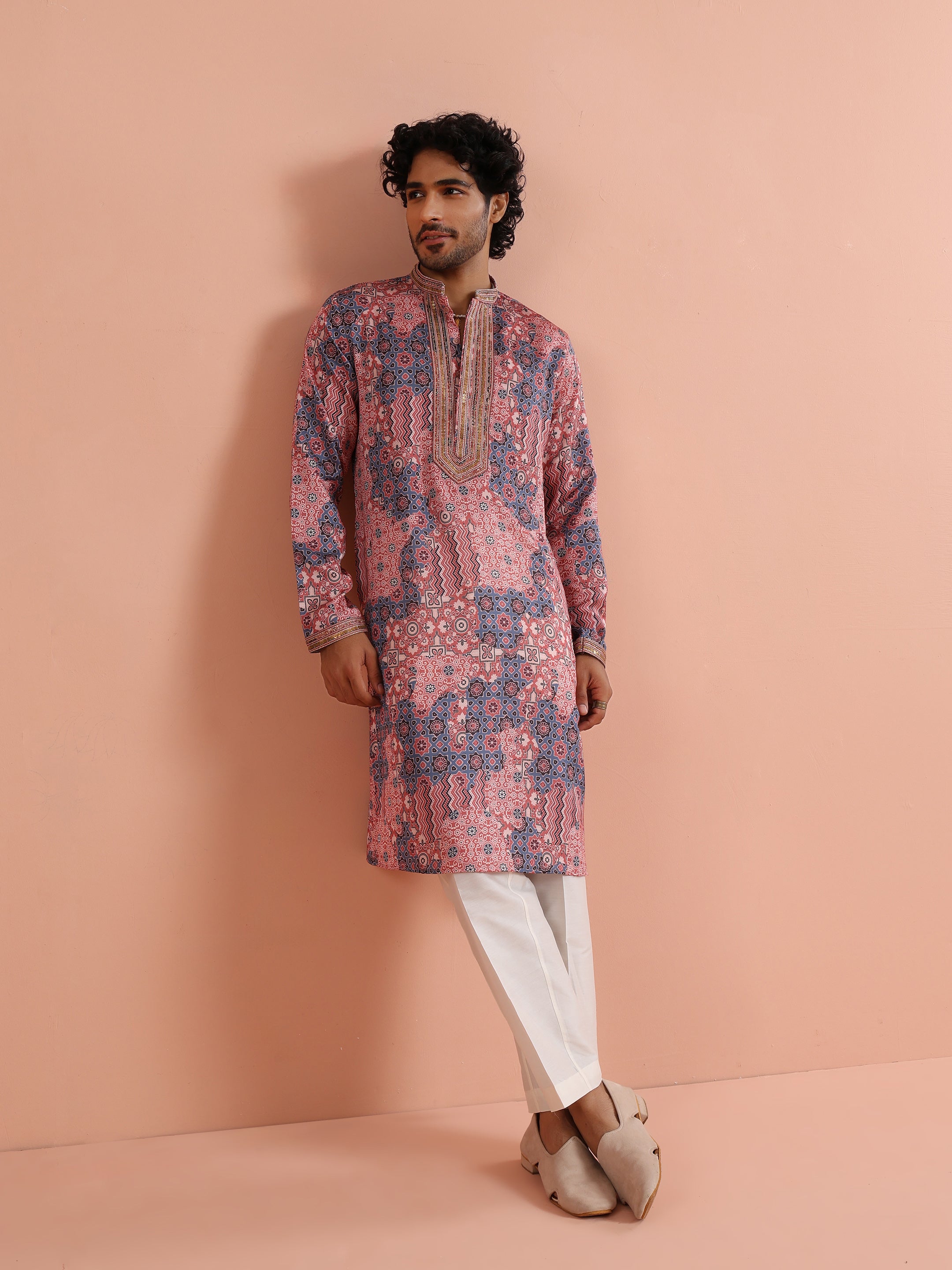 Kisah Menss Peach Printed Kurta vibrant geometric ethnic design with modern flair. Perfect for weddings, festive celebrations, or casual parties.
