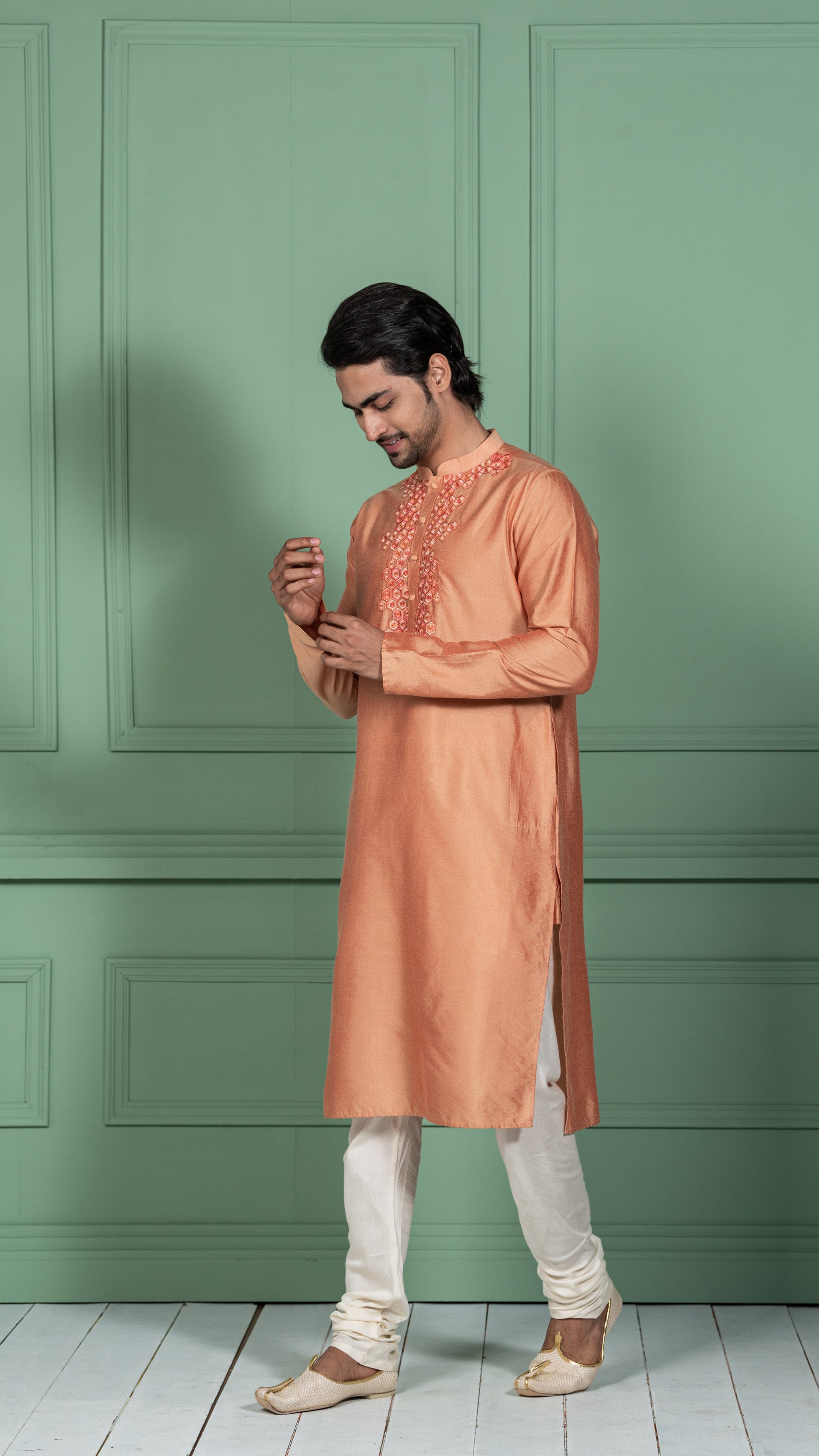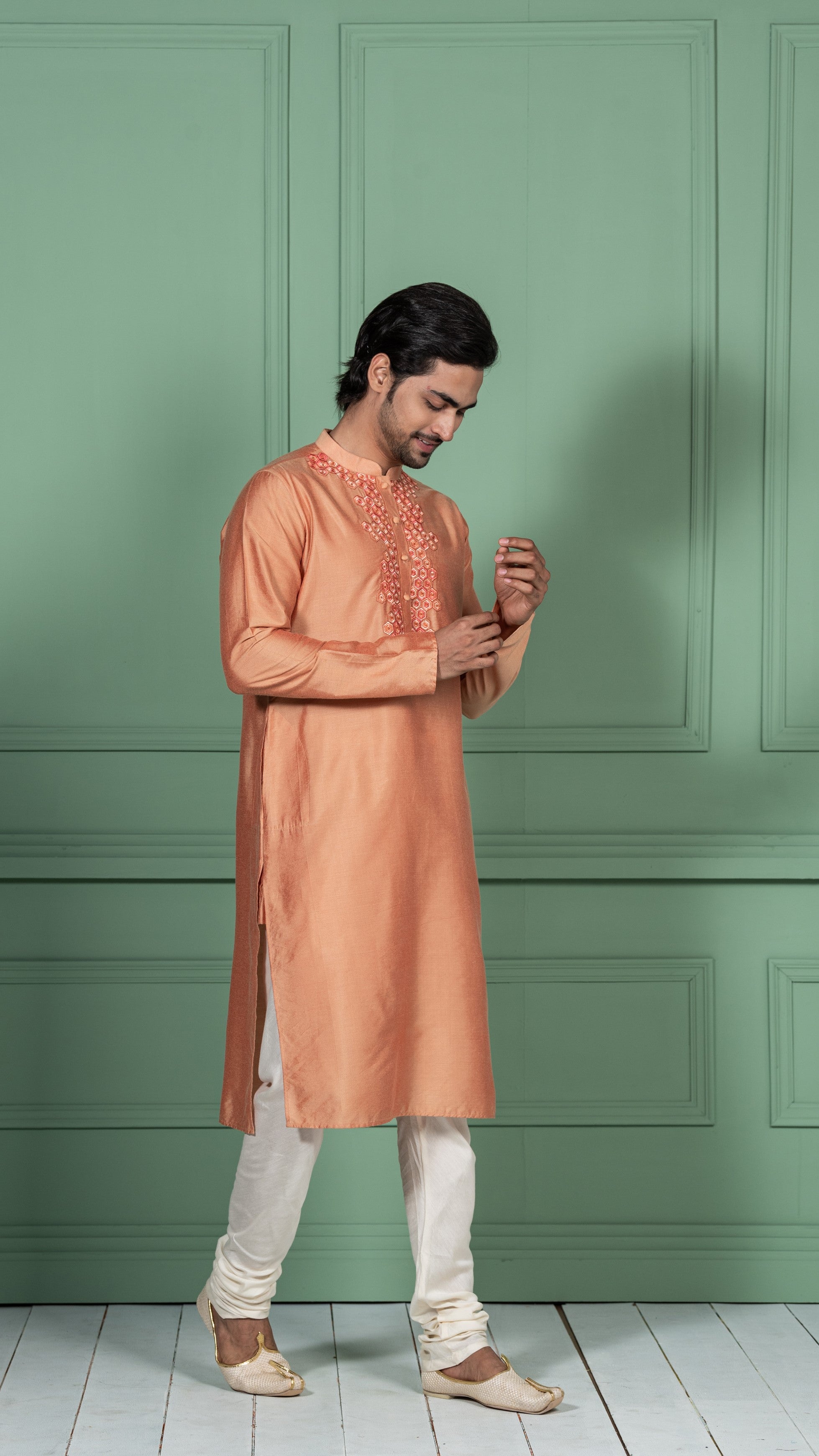 This stylish set is a blend of both elegance and fashion. The mandarin collar, style, look charming and complements your personality. This kurta set makes it a perfect wear when you are attending an occasion or going to festivals.
