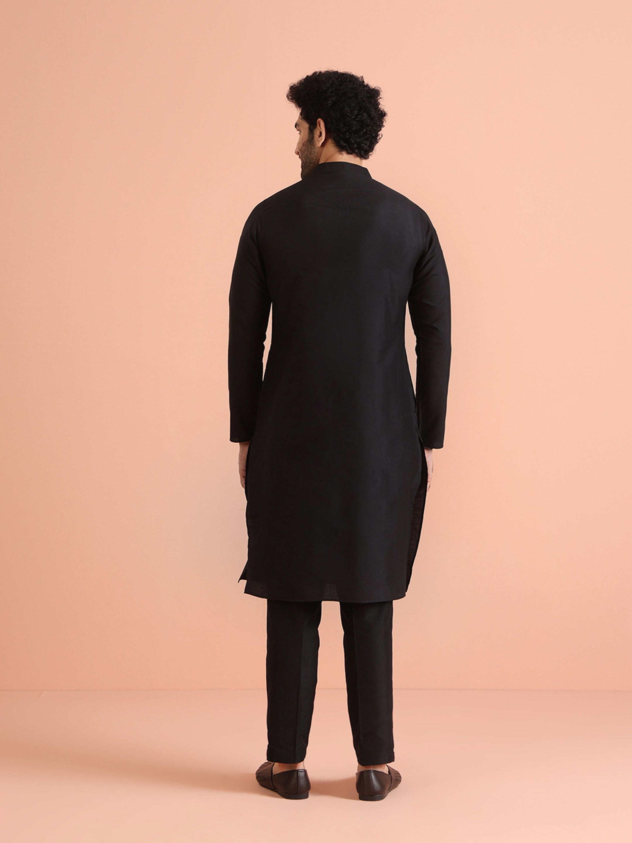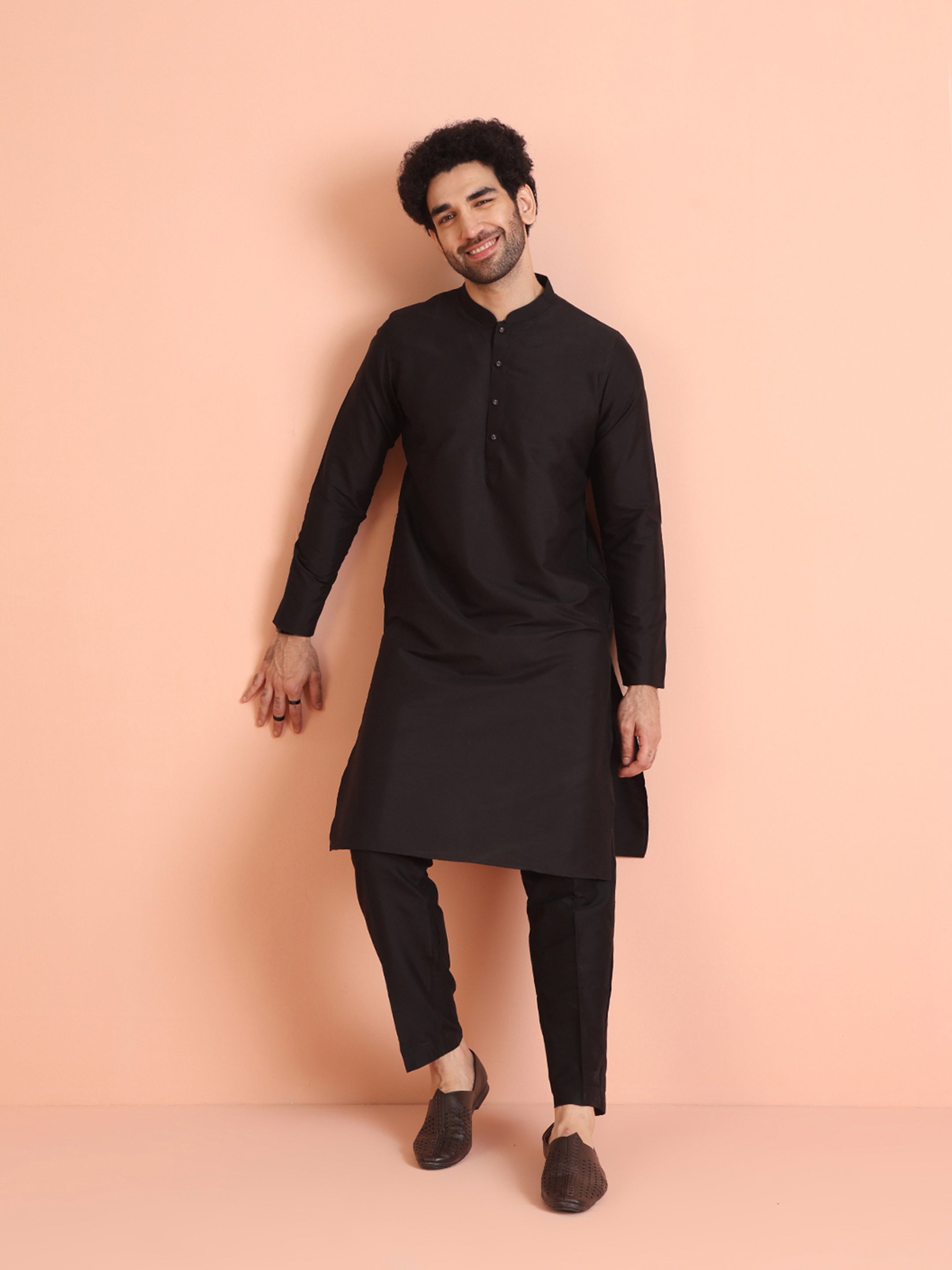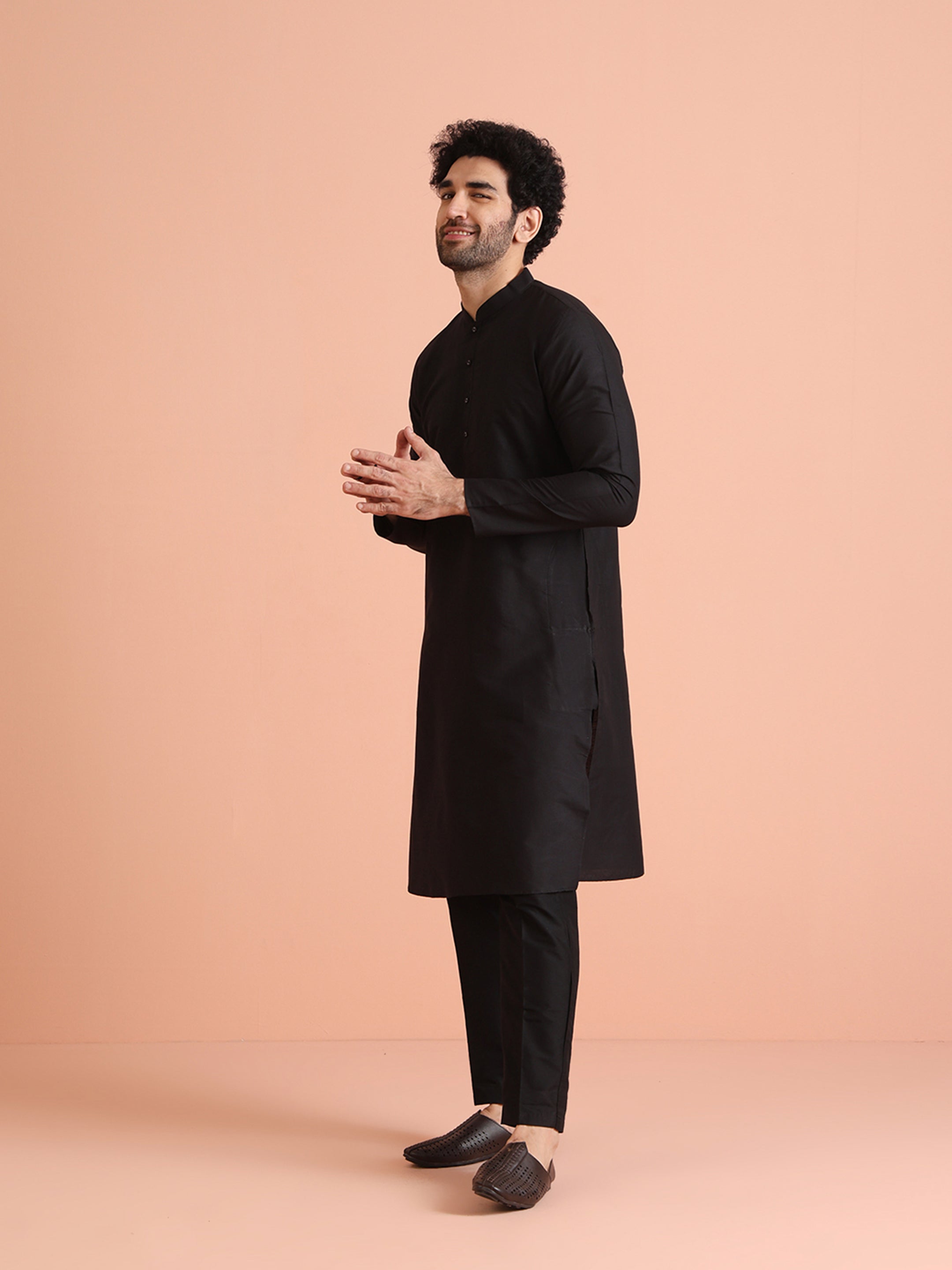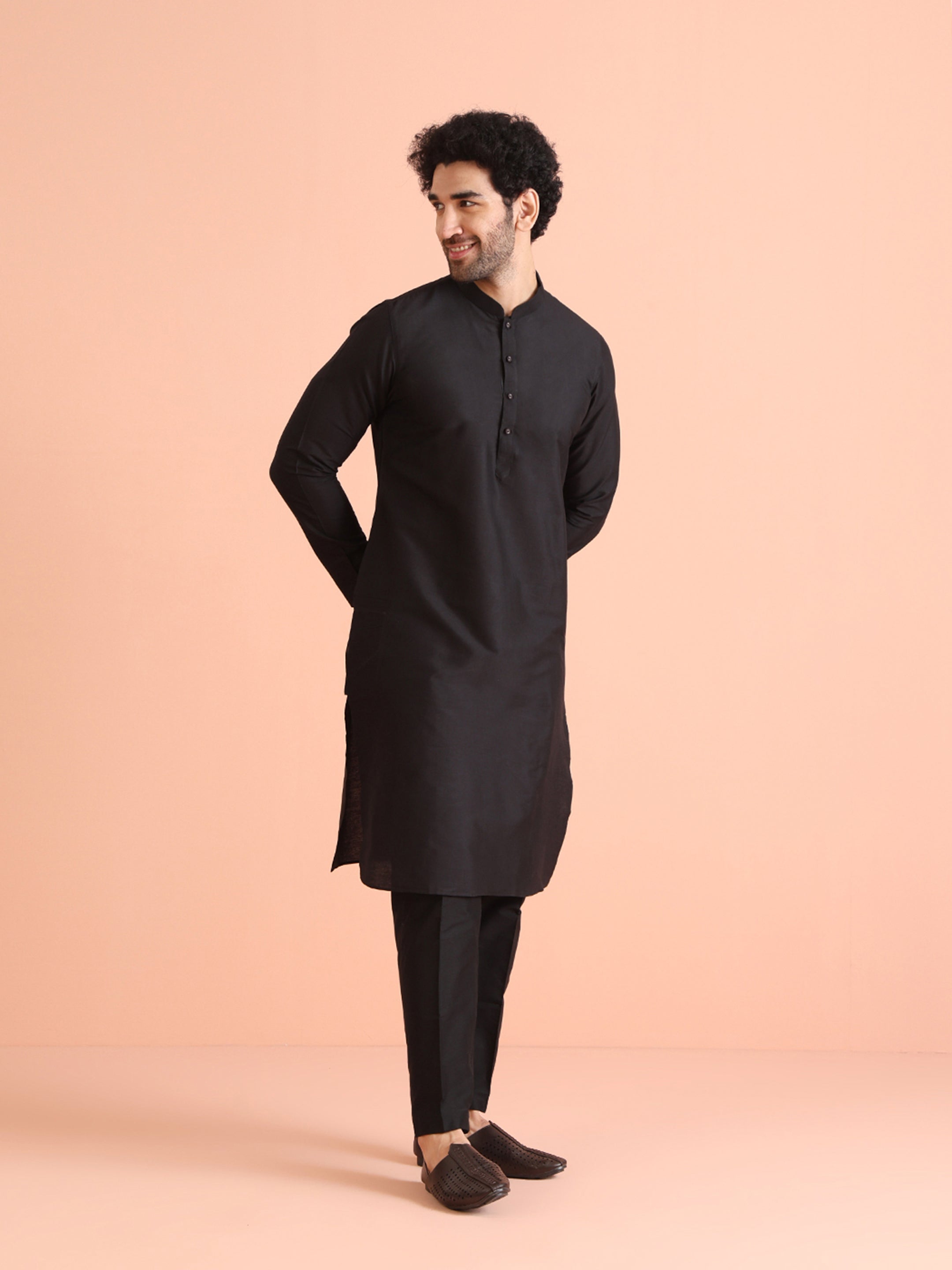 Experience classic elegance with this Men Black Solid Kurta. The Solid Pattern adds a refined touch, while the breathable Cotton Blend fabric ensures comfort throughout the day. Ideal for festive events or casual wear, this Kurta is a wardrobe essential.