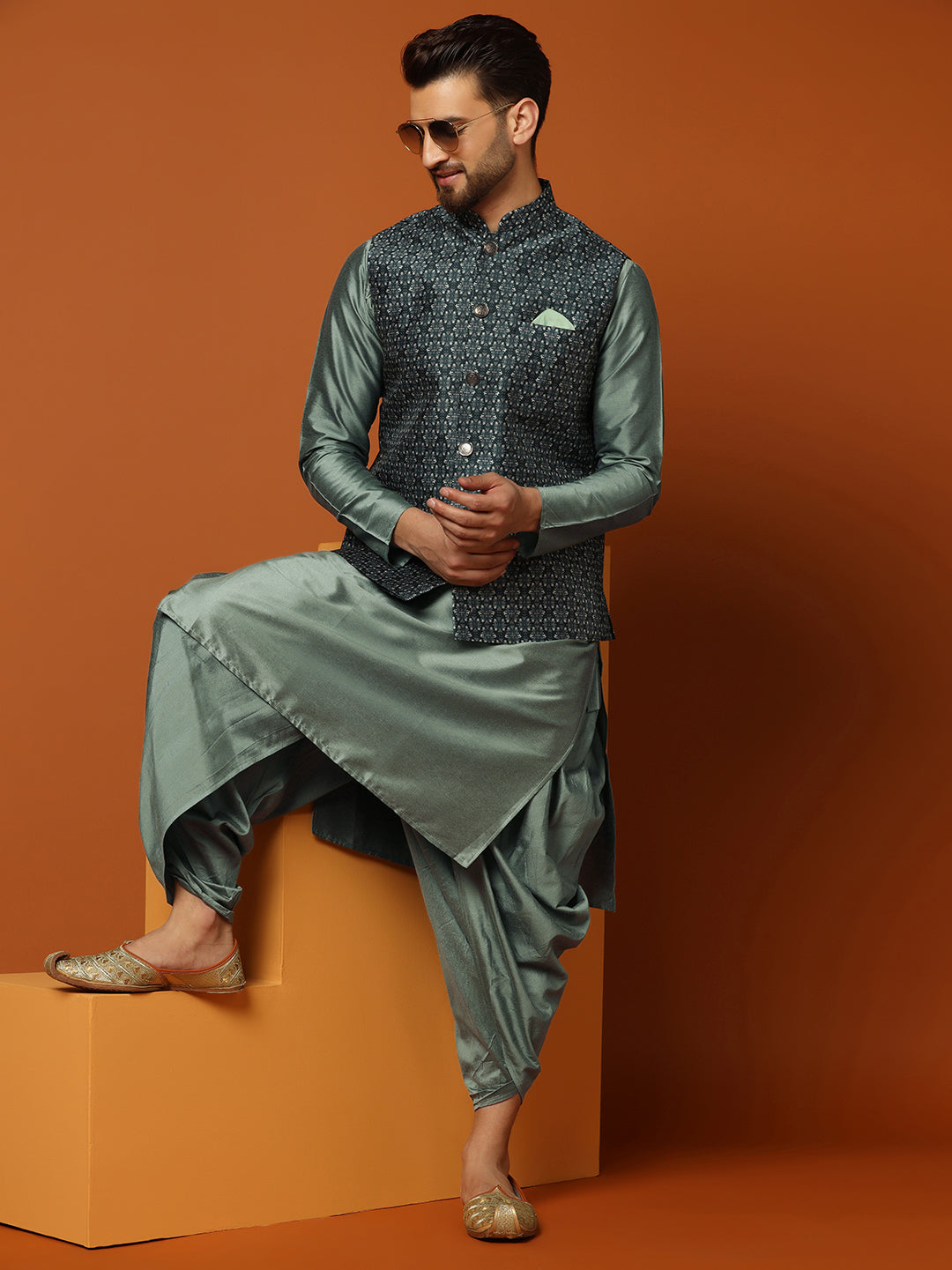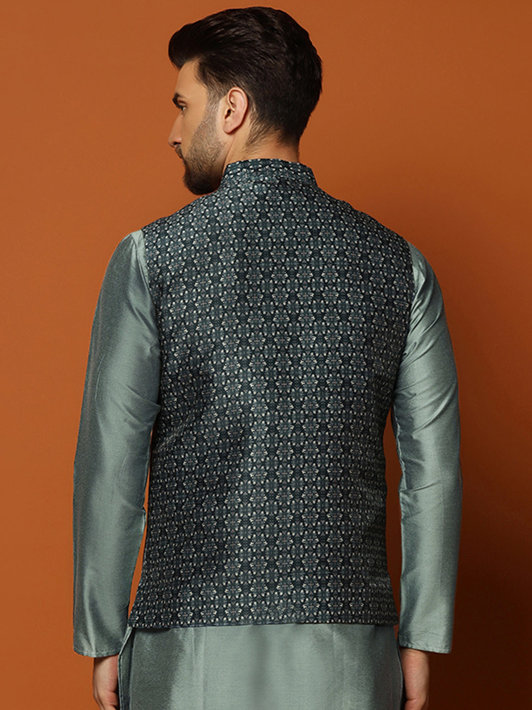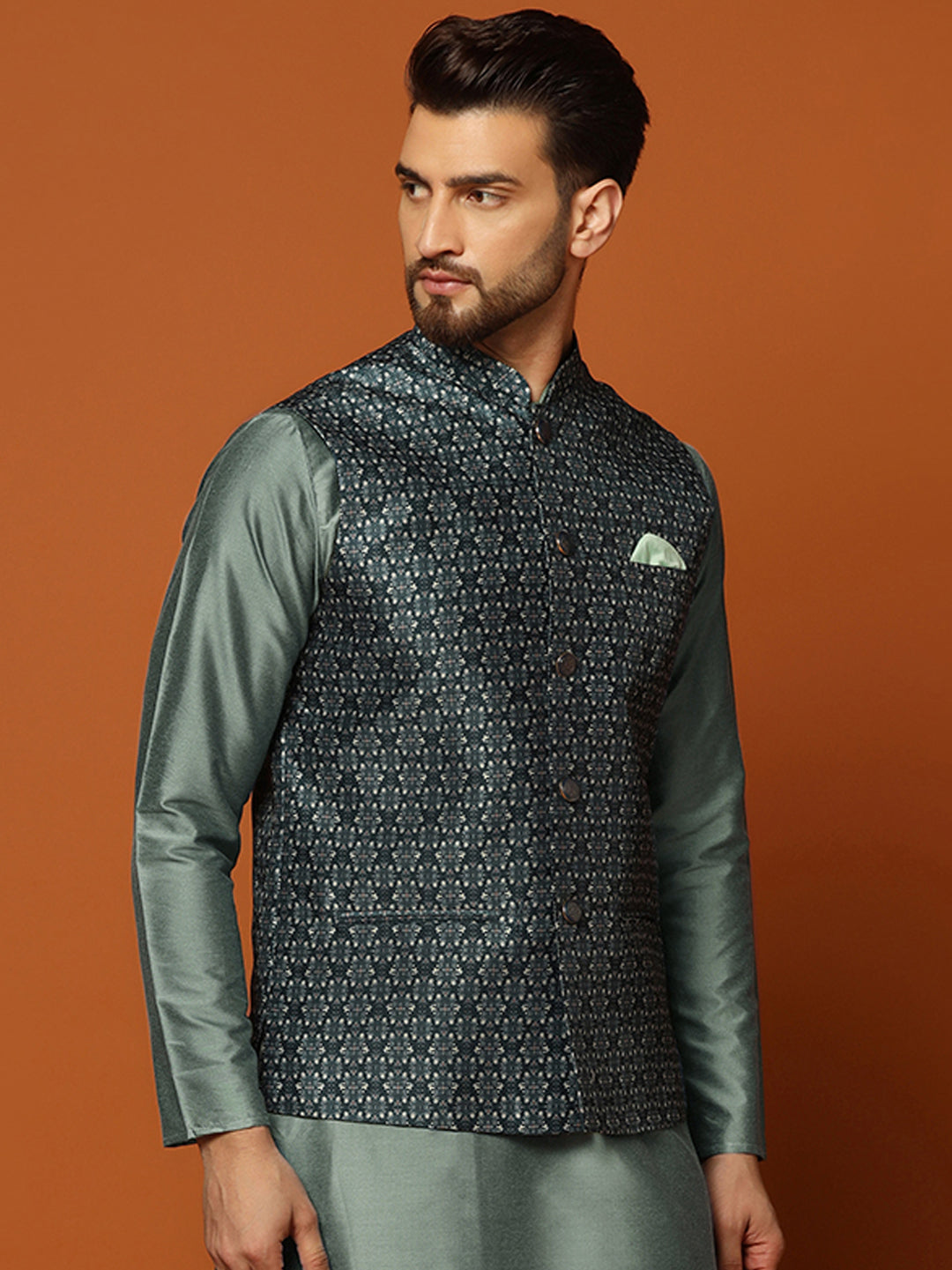 This Nehru Jacket is just perfect for festivals, or any kind off occasions. Its mandarin collar, style gives a charming look, this classic Woven design design is made from Cotton Blend fabric and comes in Teal colours. Perfect for any occasion.