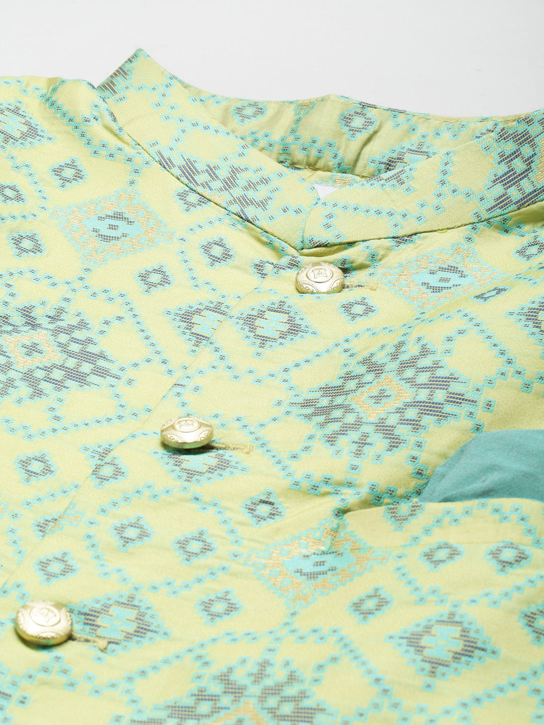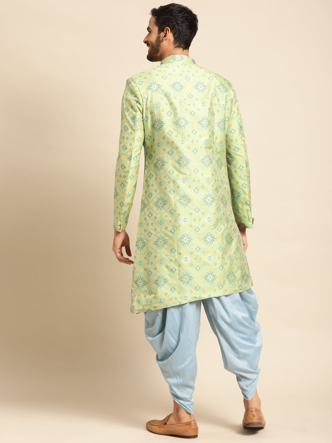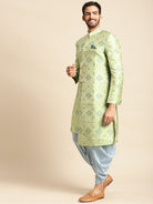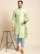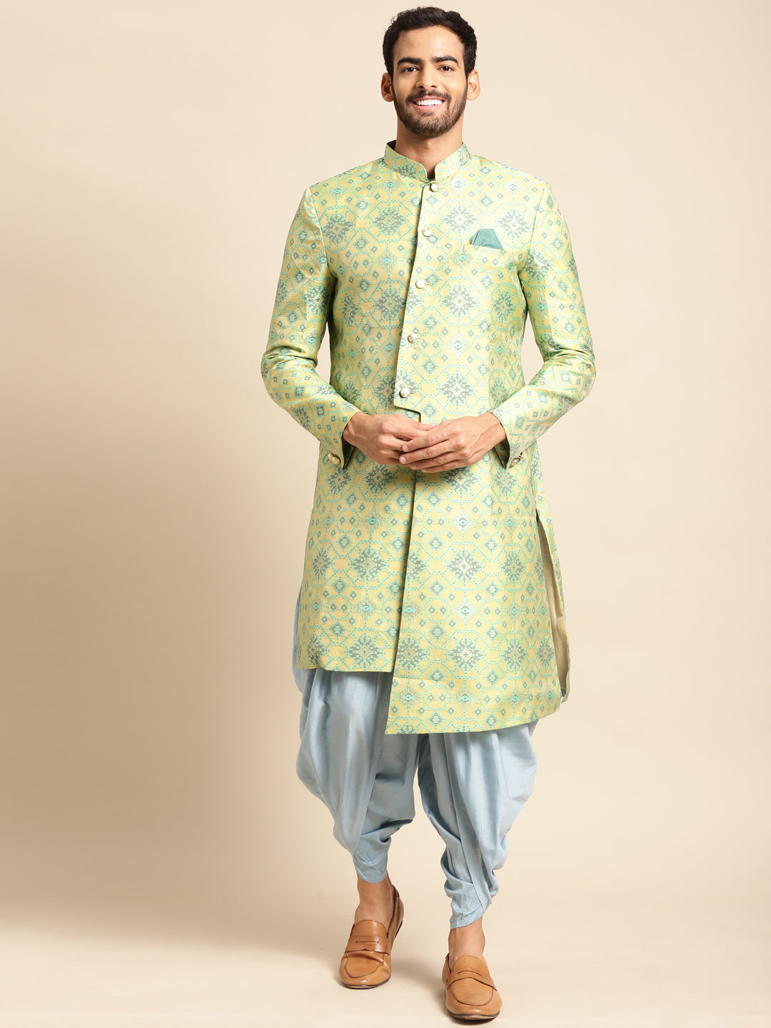 This Indowestern set is an elegant mandarin collar style that is perfect for occasional wear. With a full sleeve design and comfortable fabric, it will make you look stylish. Add some bling to your outfit and you can take things up a notch with some mochari to complete the look.