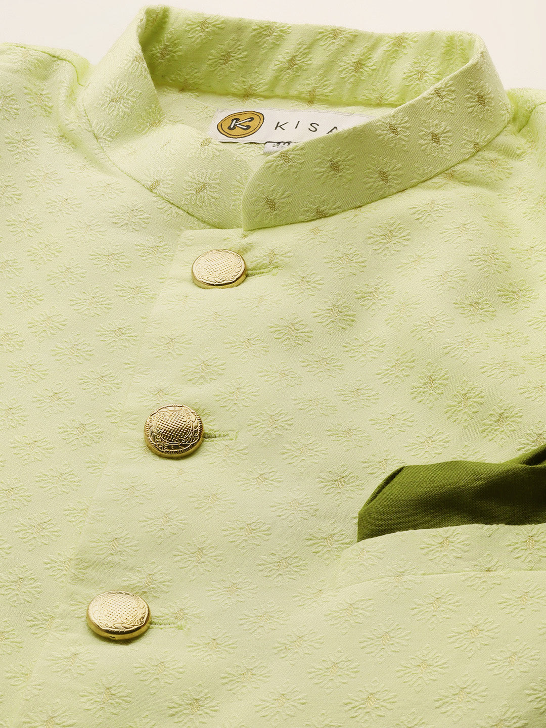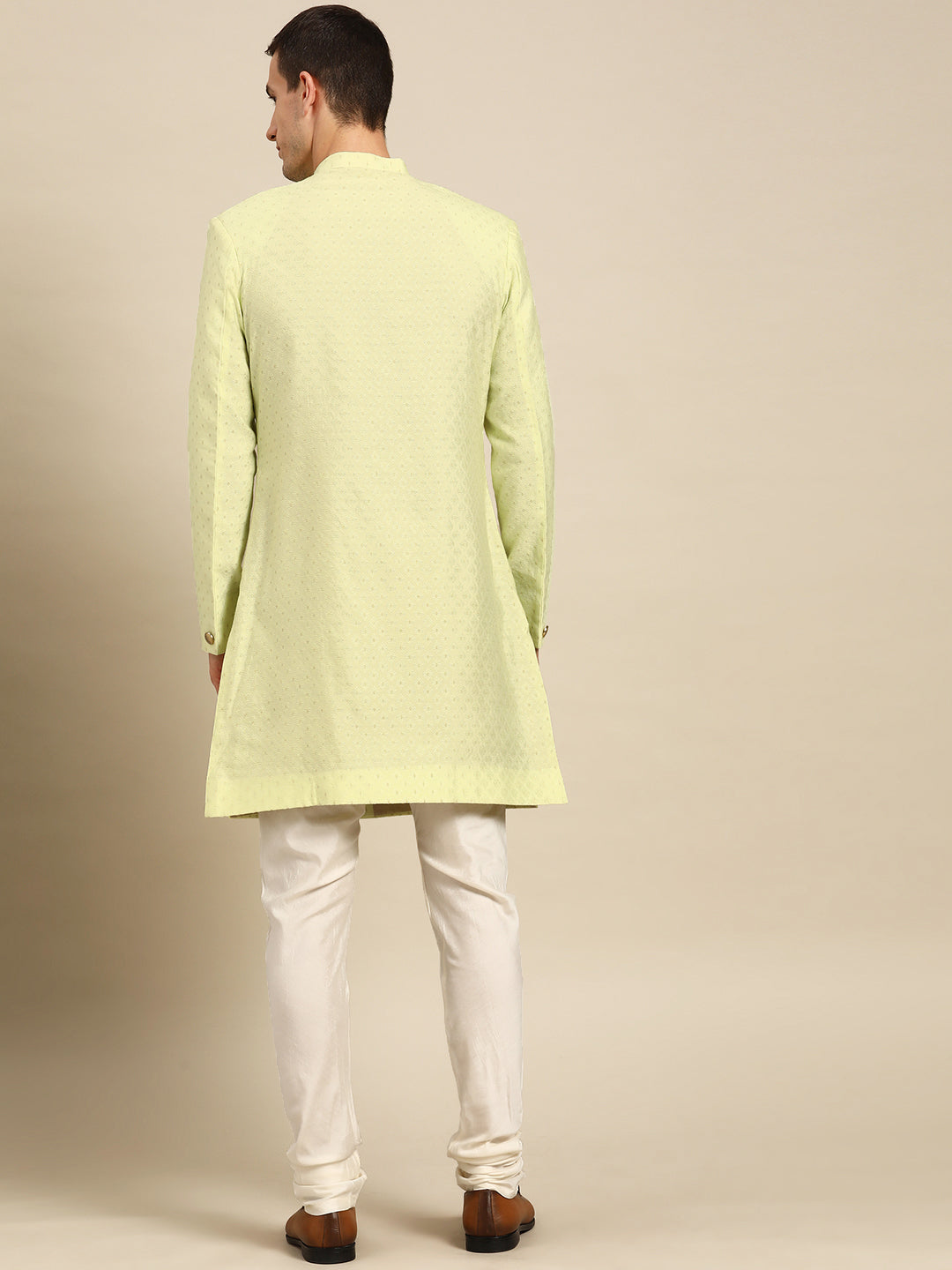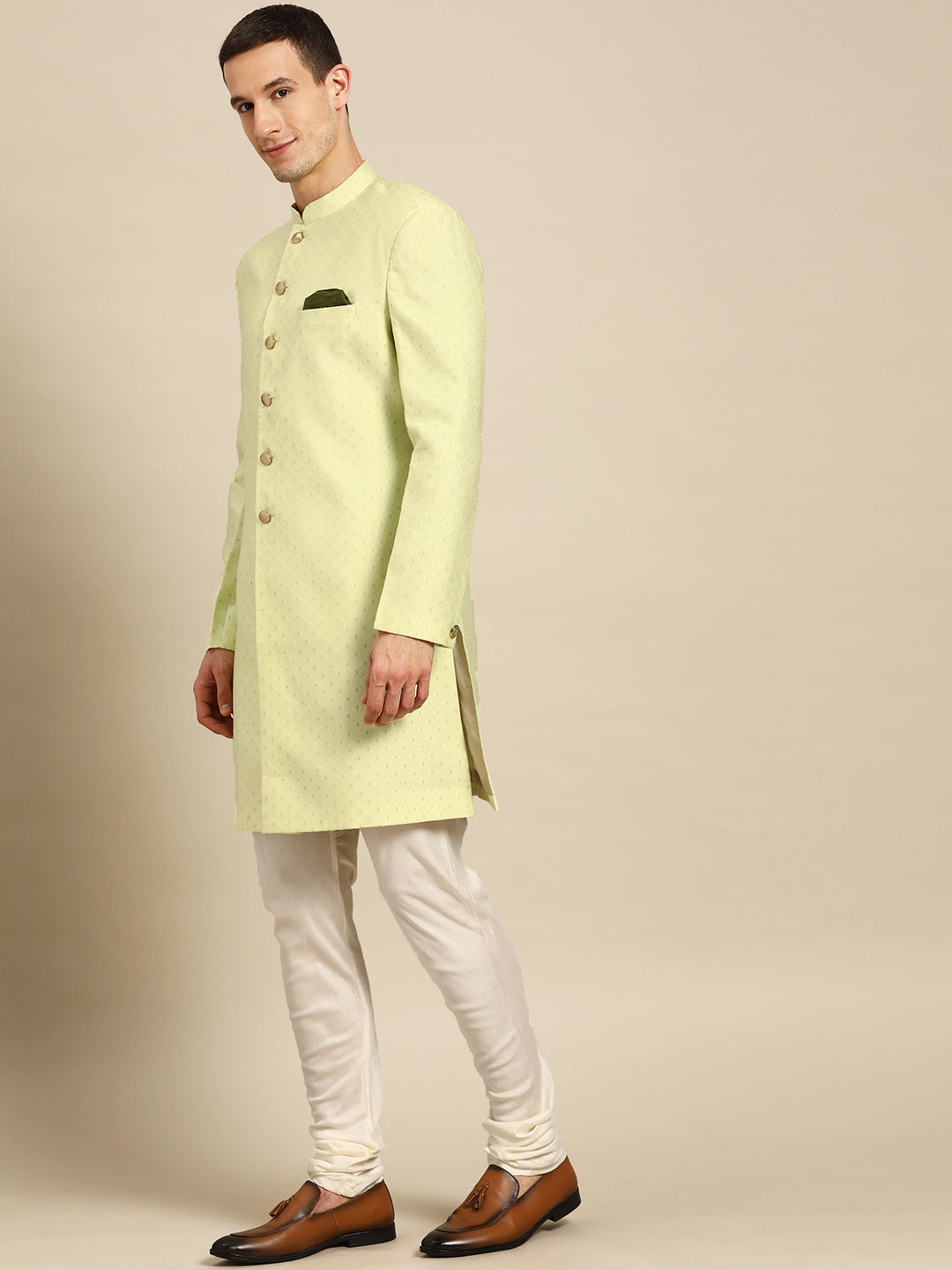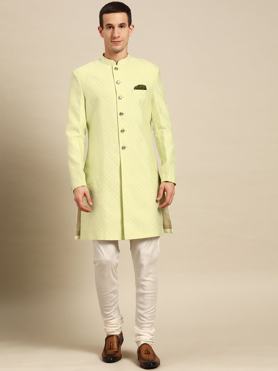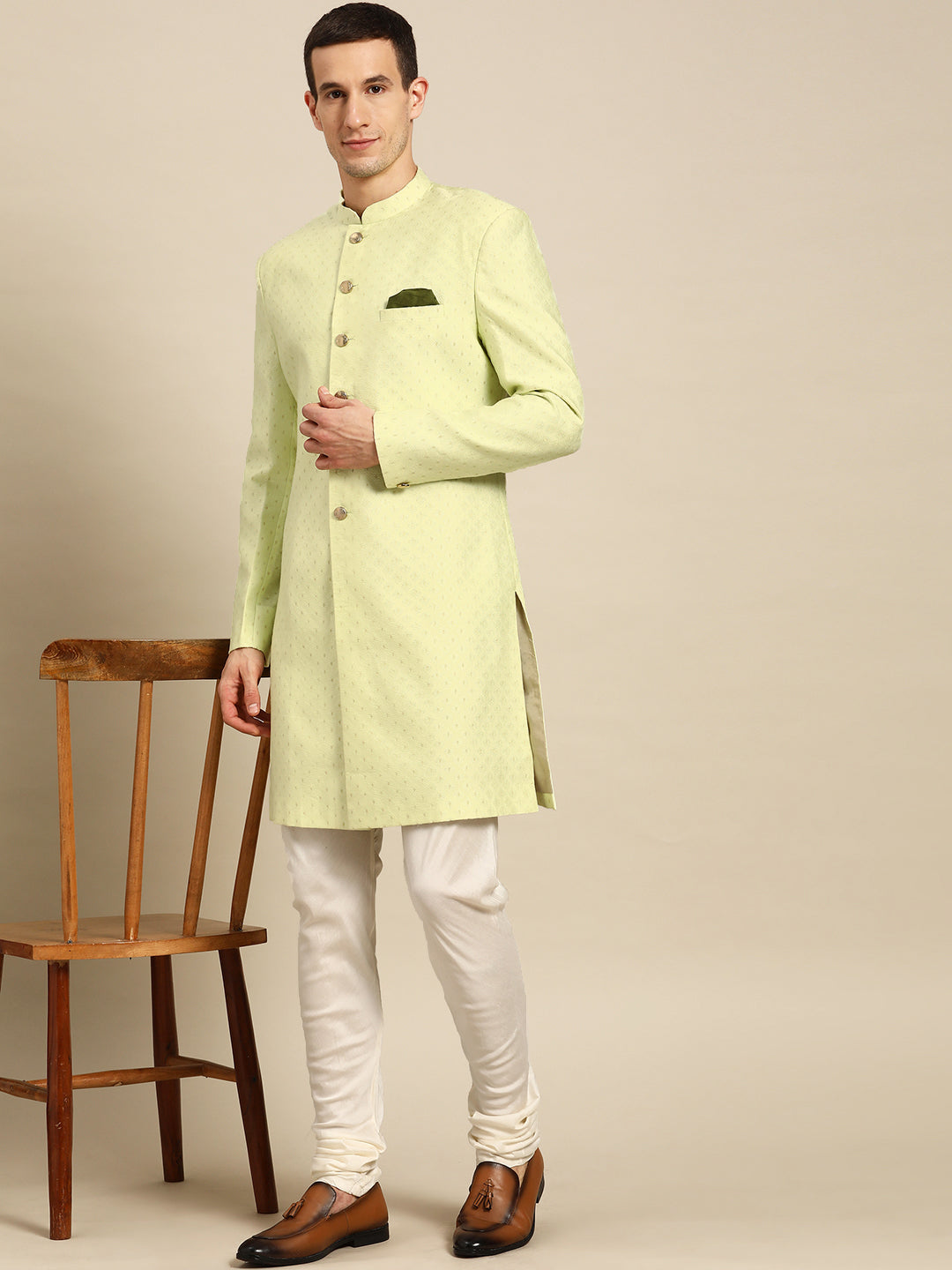 This Indowestern set is an elegant mandarin collar style that is perfect for occasional wear. With a full sleeve design and comfortable fabric, it will make you look stylish. Add some bling to your outfit and you can take things up a notch with some mochari to complete the look.