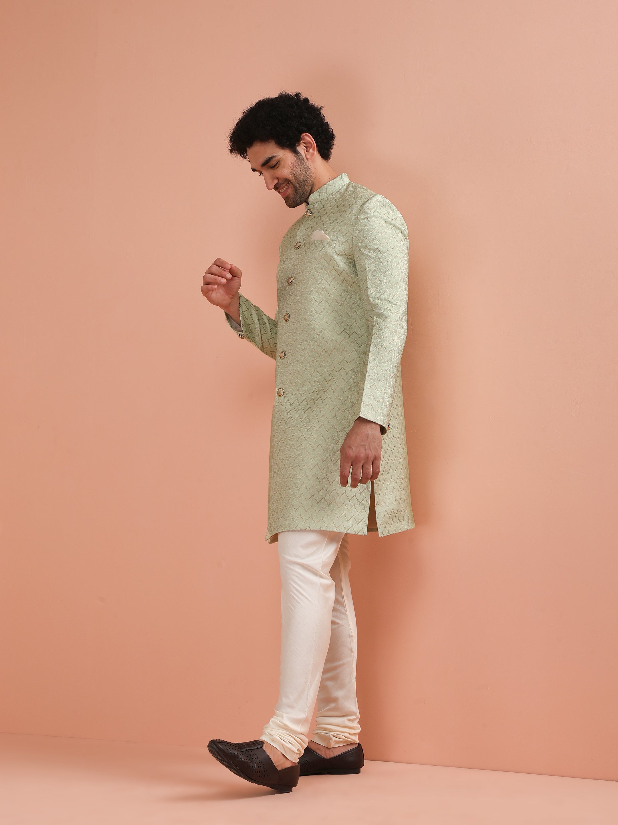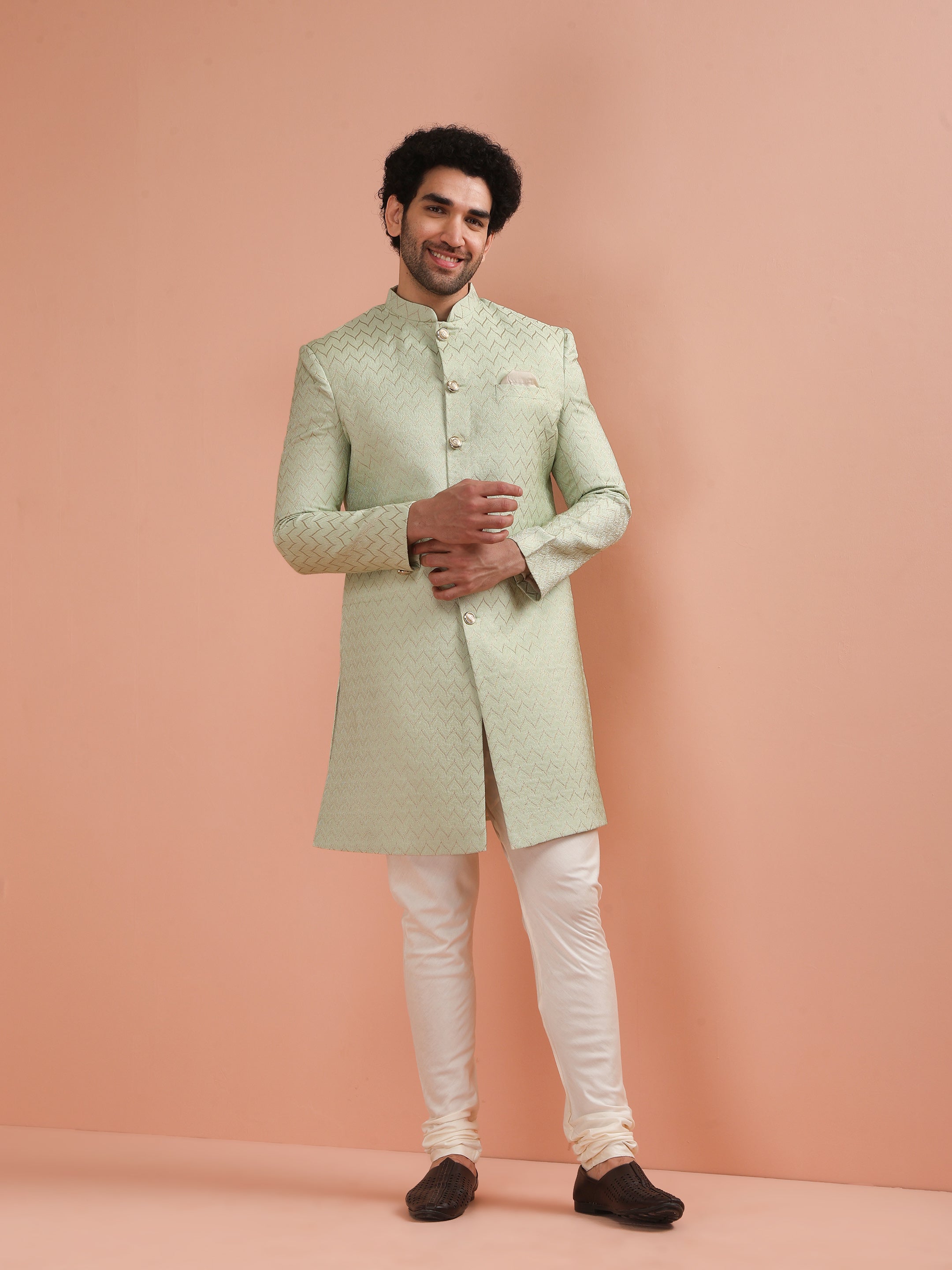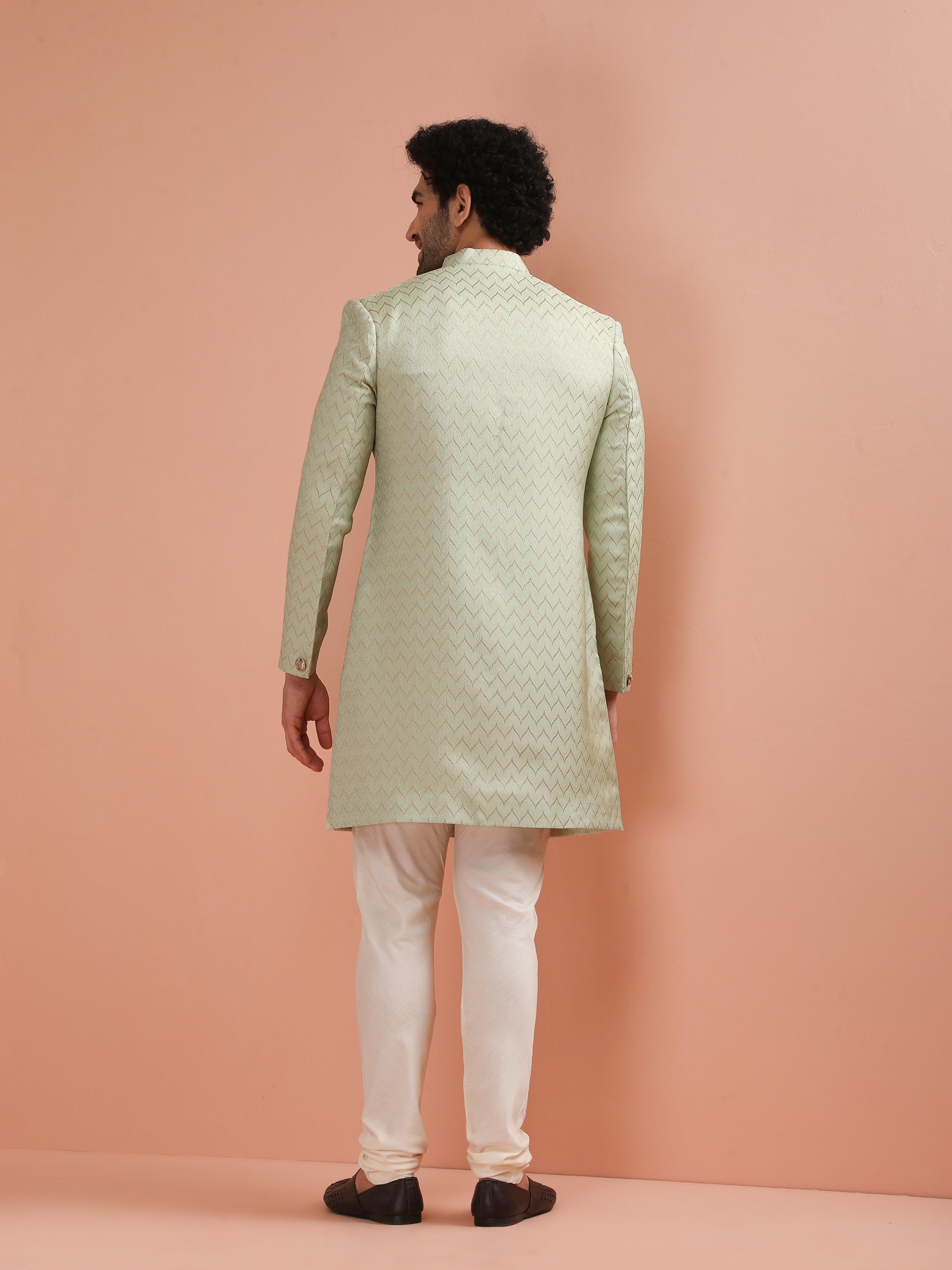 Men Green Jacquard Indowestern Churidar Set with Geometric