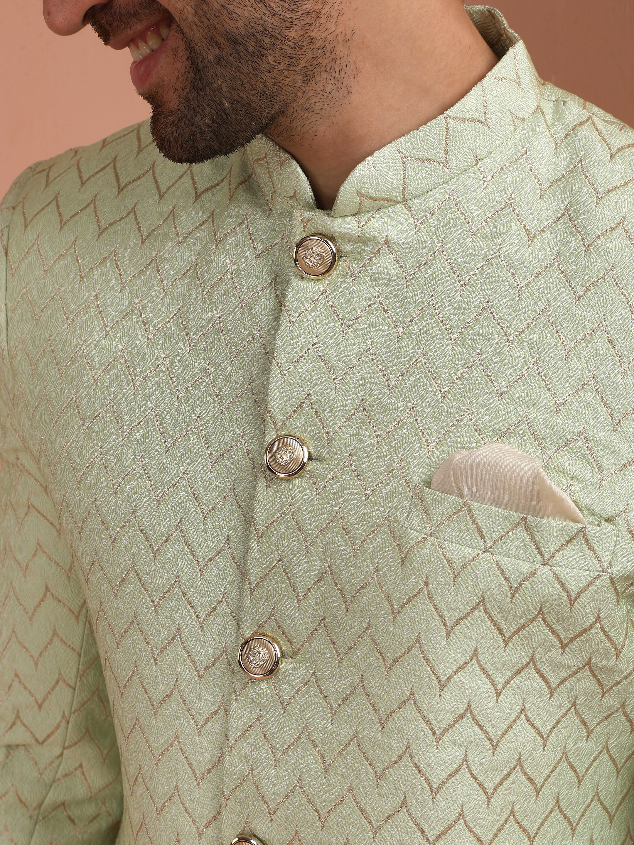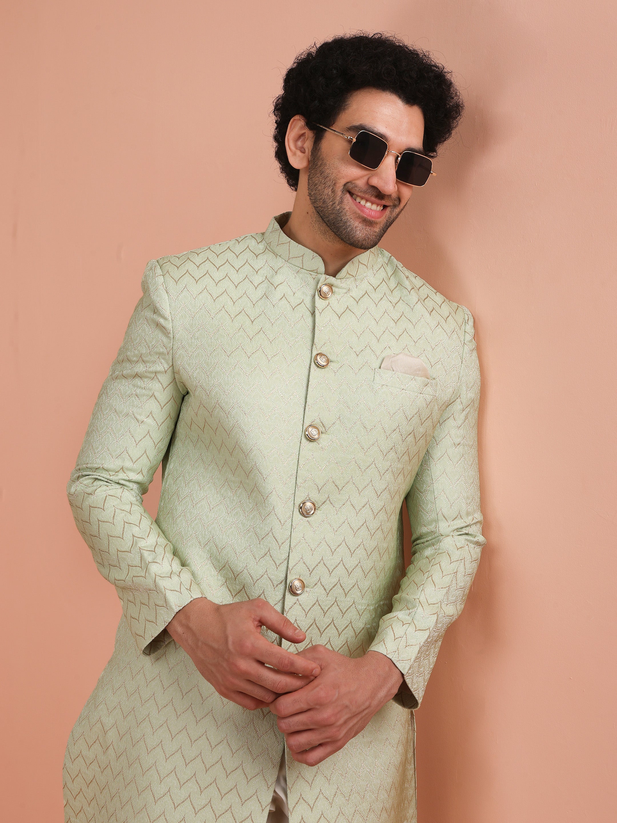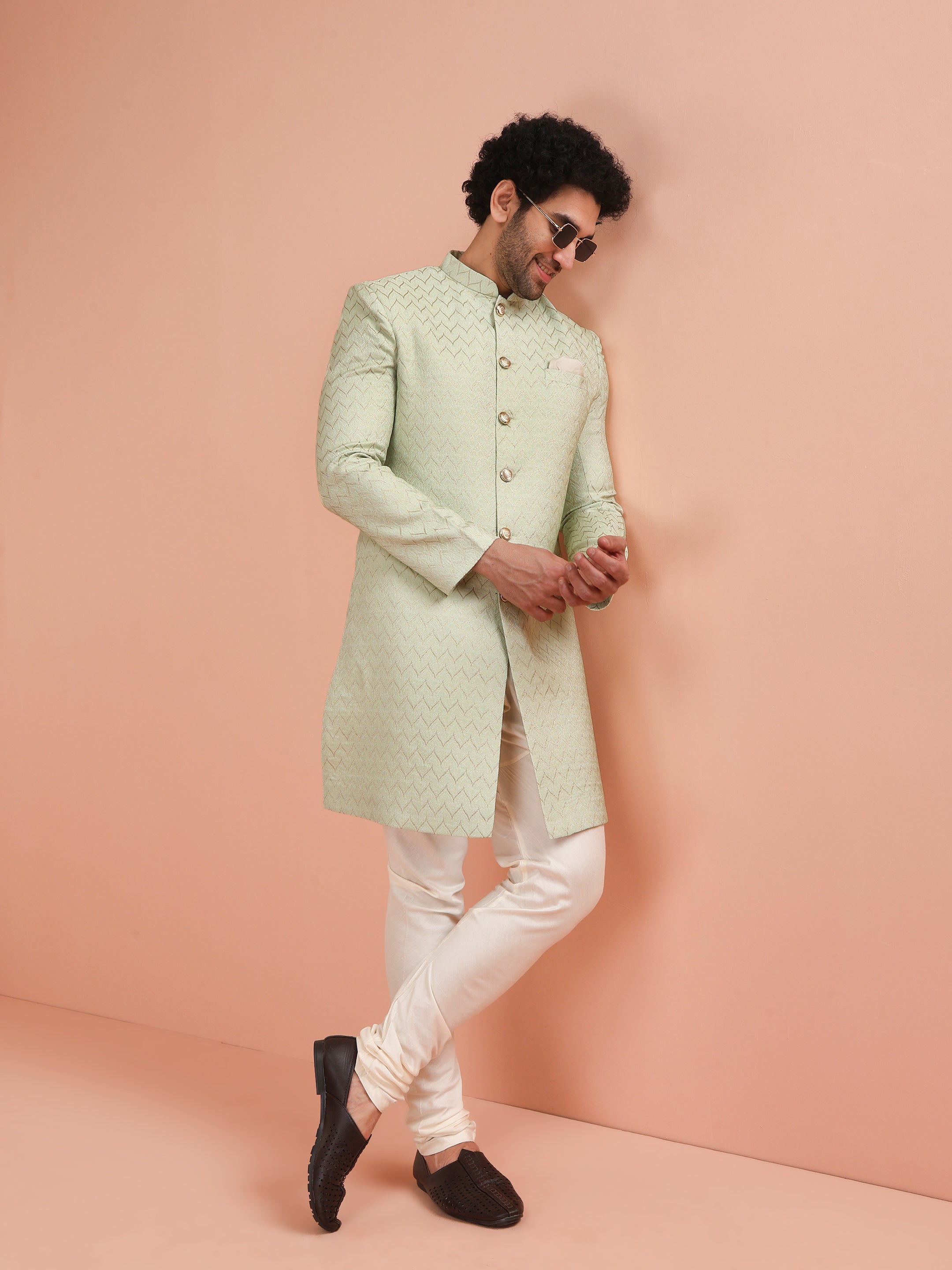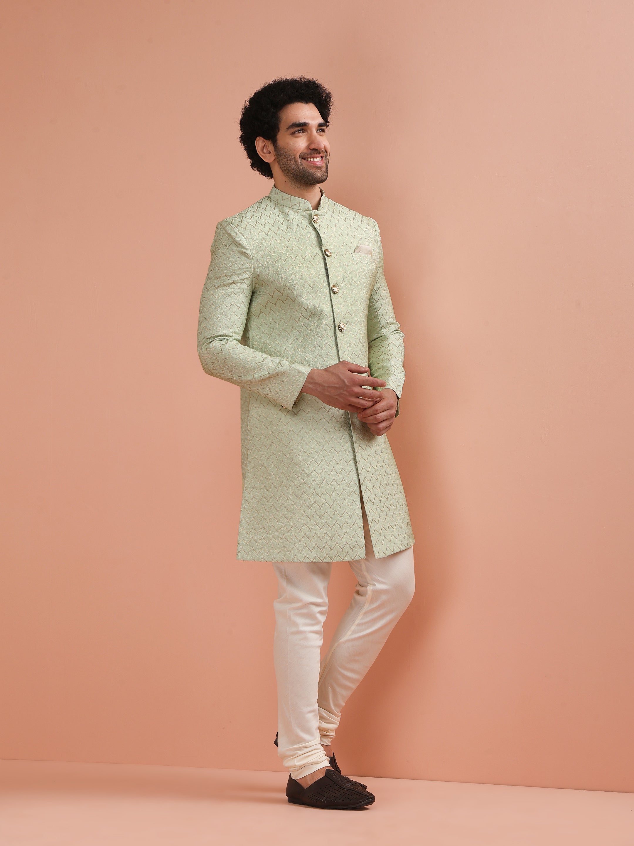 Men Green Jacquard Indowestern Churidar Set with Geometric