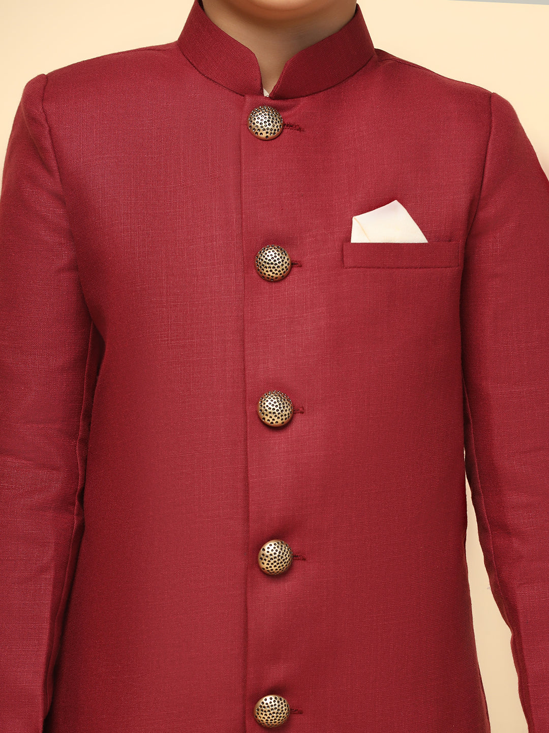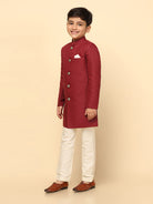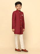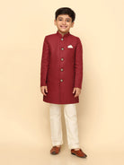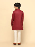 The Kisah Indo-Western Set is ideal for boys looking for stylish yet comfortable attire. Crafted from Cotton Blend fabric, Maroon color, stylish Solid Dyed pattern, and It is a great addition to your boys wardrobe and will win you compliments from everyone.