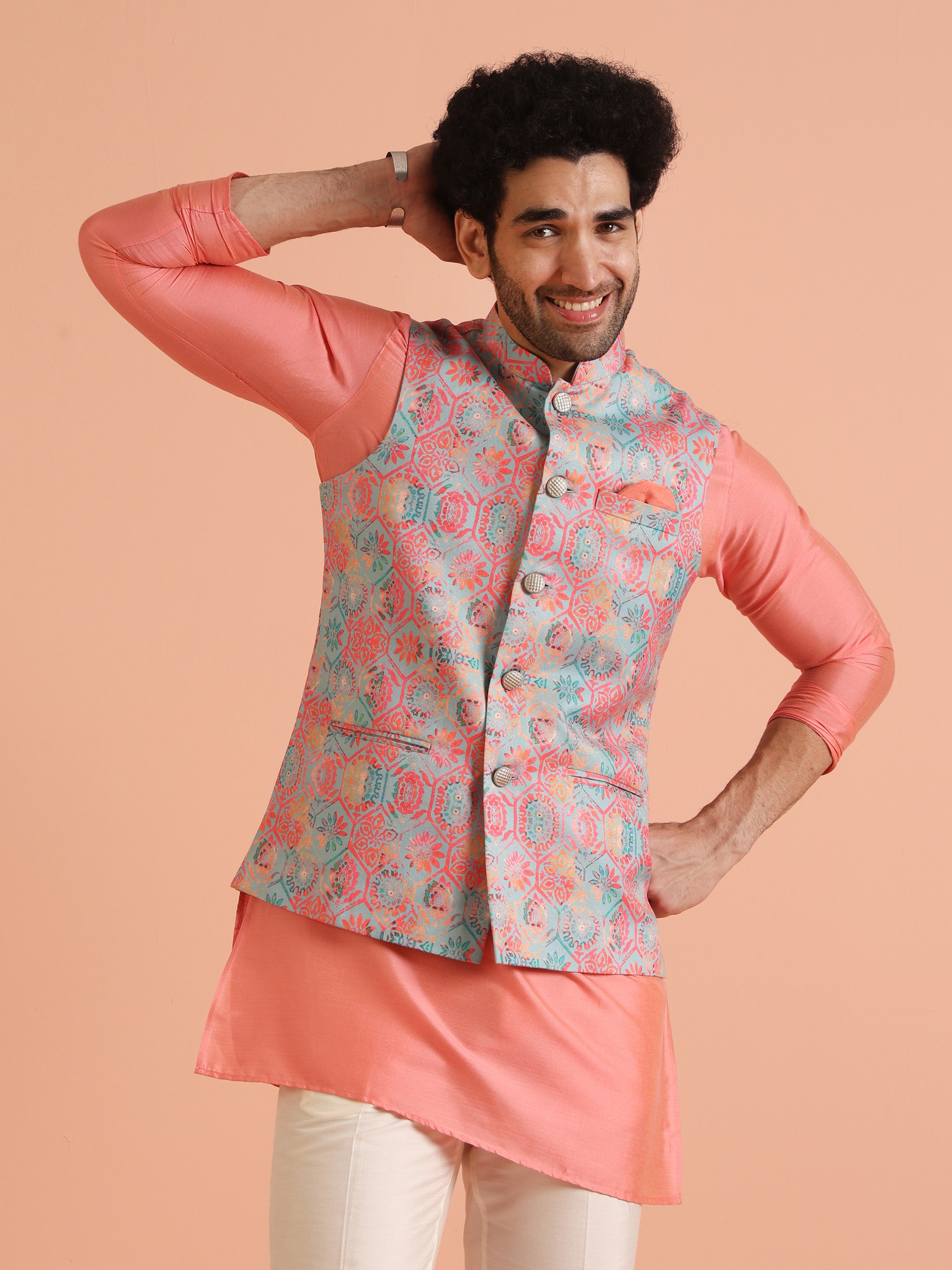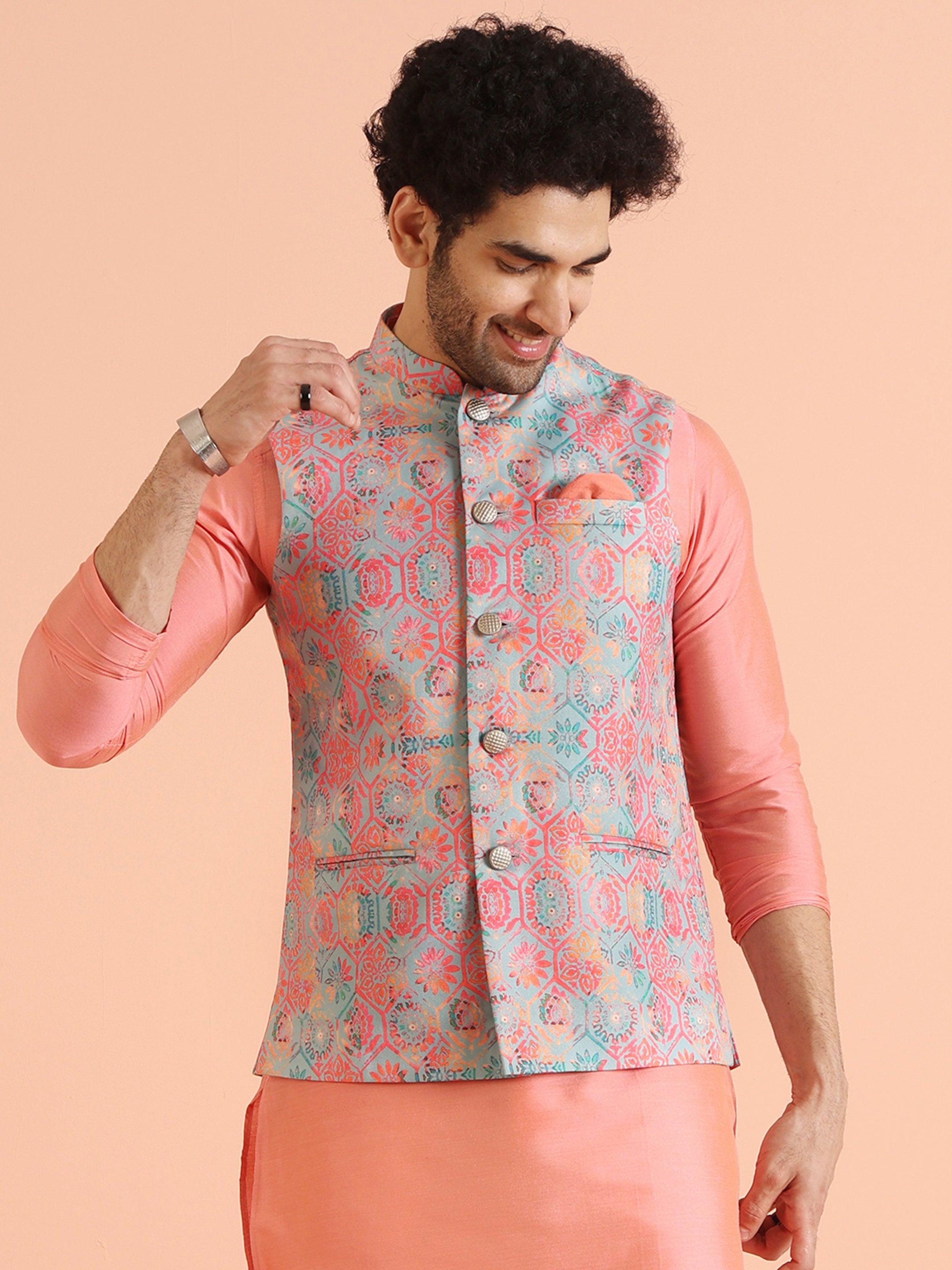 Enhance your ethnic style with this Men’s Multi-Coloured Nehru Jacket, designed to add a vibrant and modern touch to your traditional look. Made from a premium silk blend, this jacket features a textured pattern that brings sophistication and elegance to any outfit.