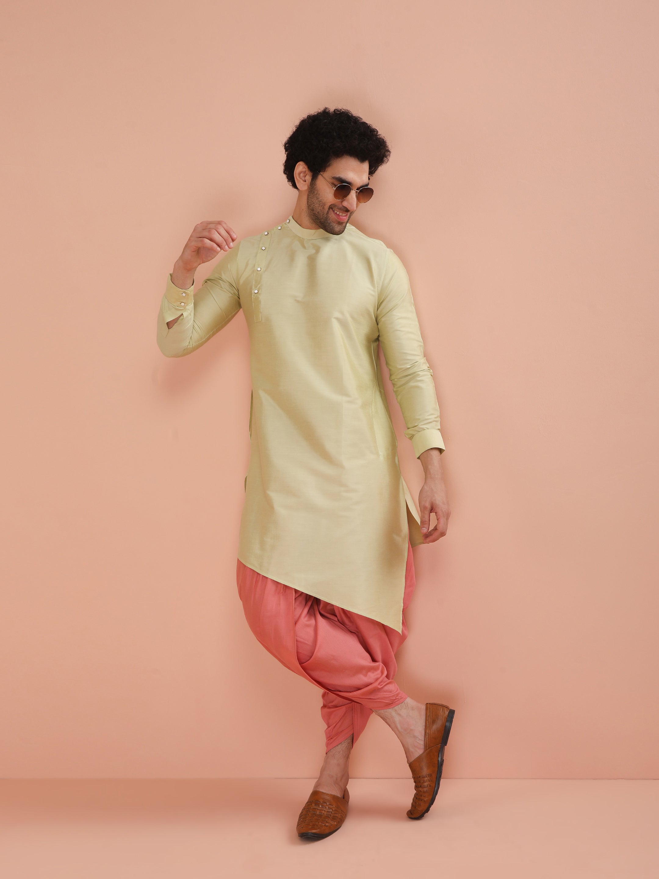 Step up your style with our Mint Green Asymmetric Kurta. Made from a comfy cotton blend, this solid-colored kurta has a cool, modern design that's perfect for any occasion. Whether it's a festive event or a casual outing, this kurta will keep you looking sharp and stylish.