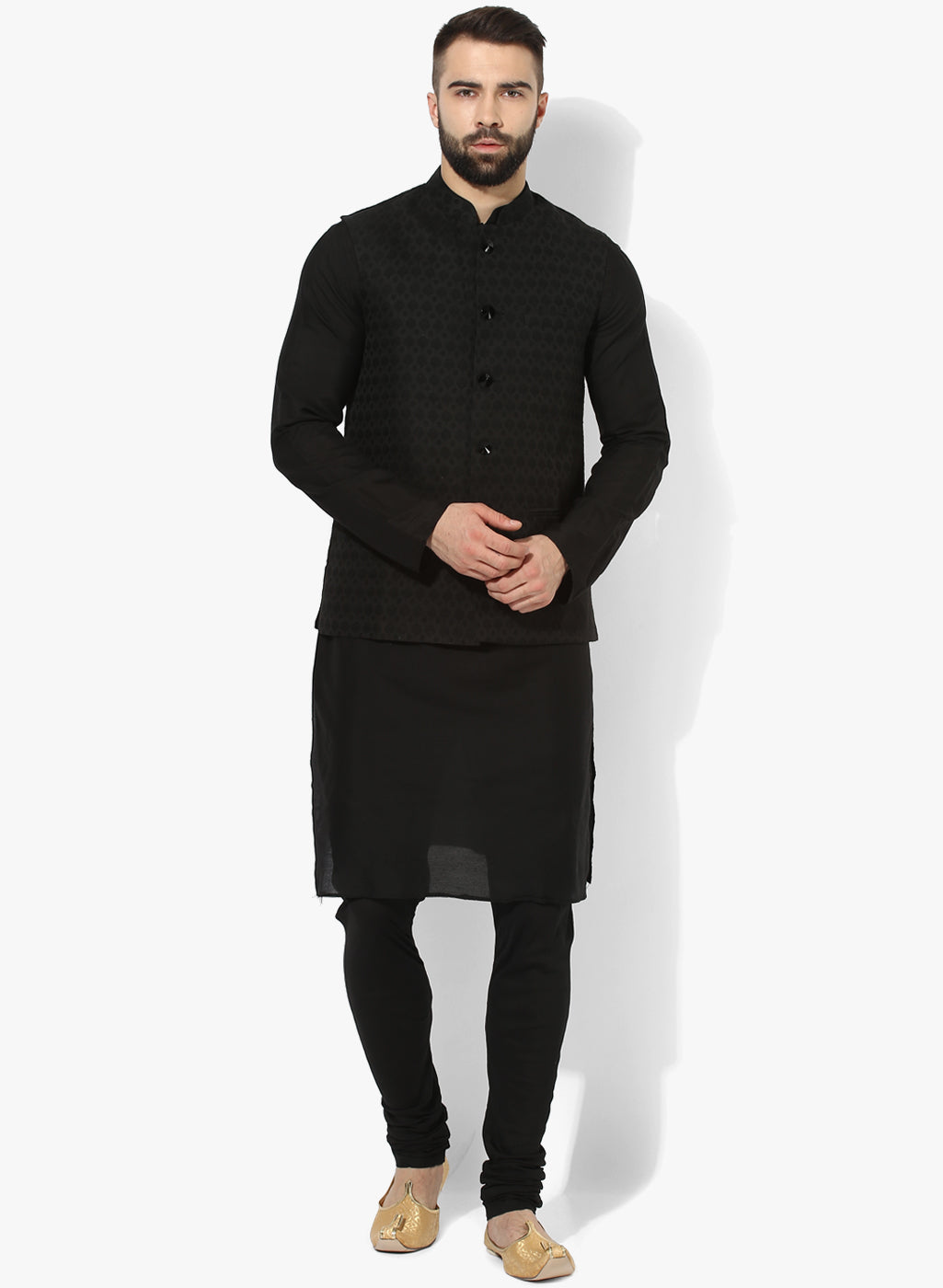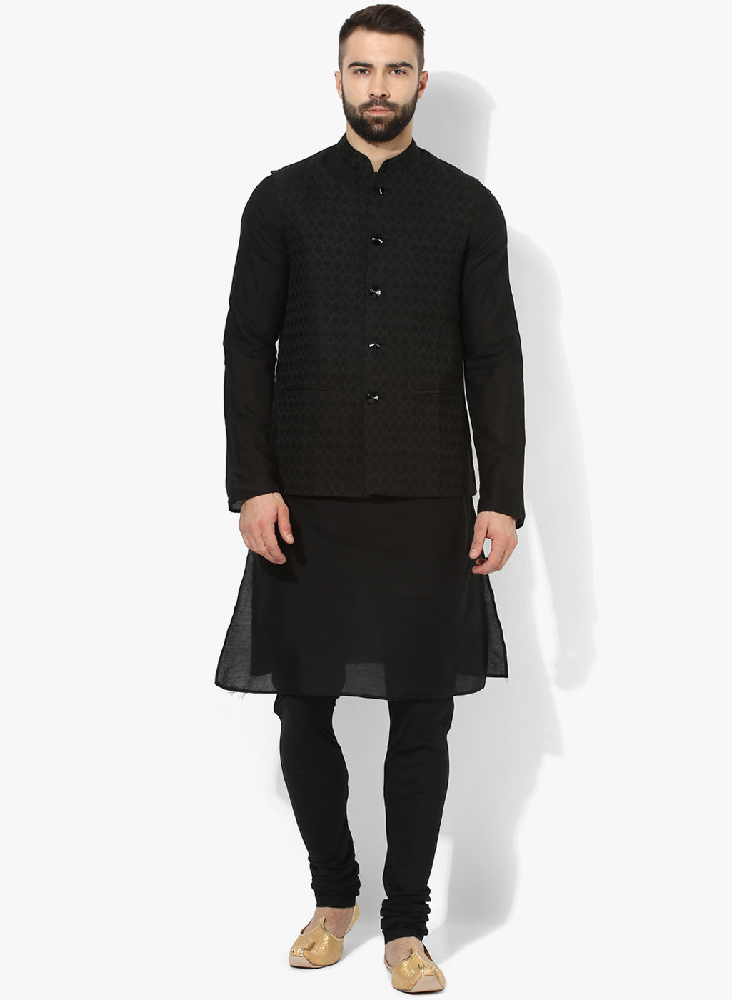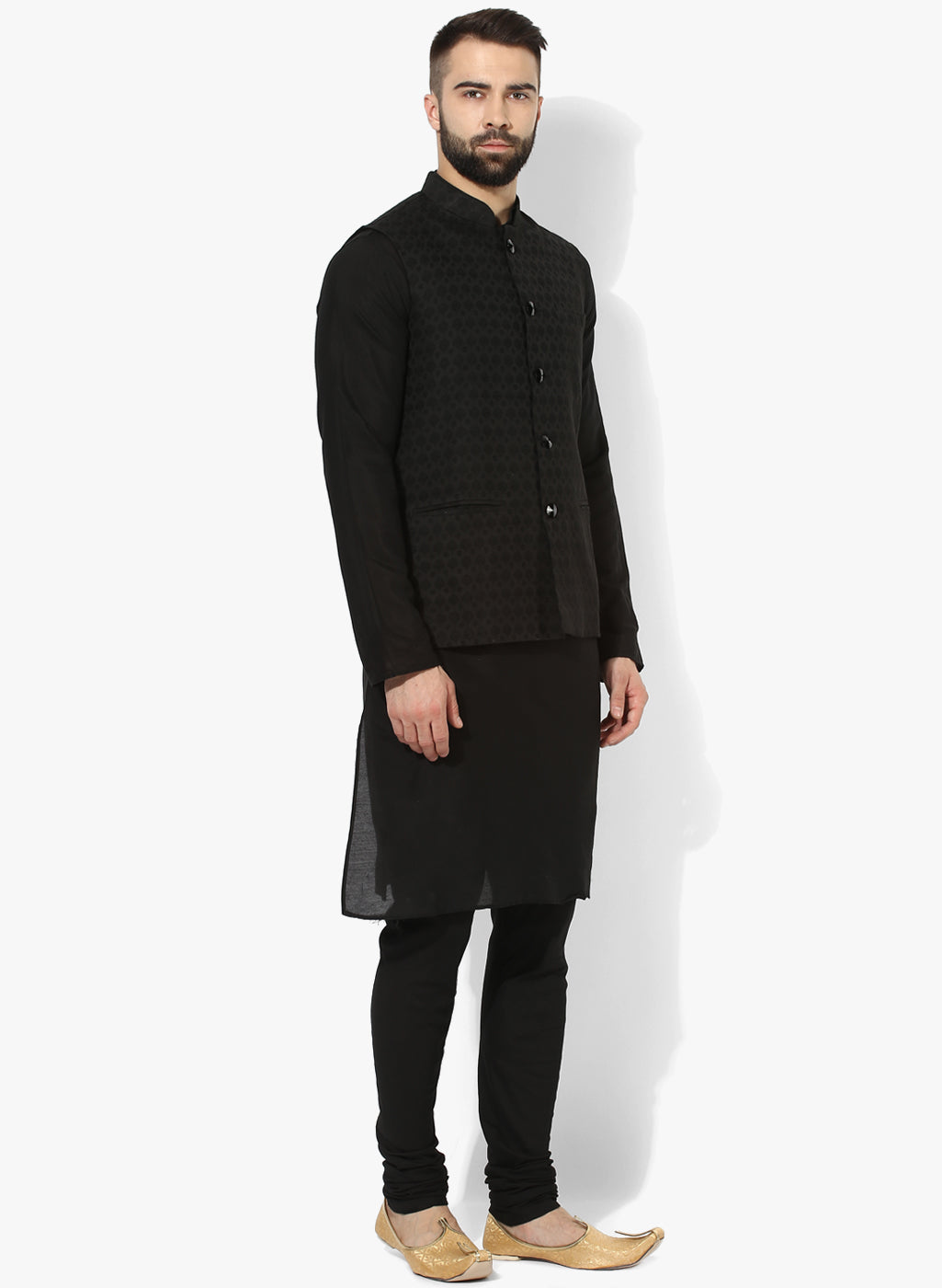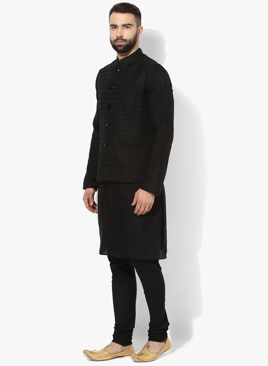 Step into style with our Black Kurta, Jacket & Churidar set. Crafted from a cotton blend with a textured design, this regular-fit outfit is perfect for festive events, keeping you both comfortable and stylish.