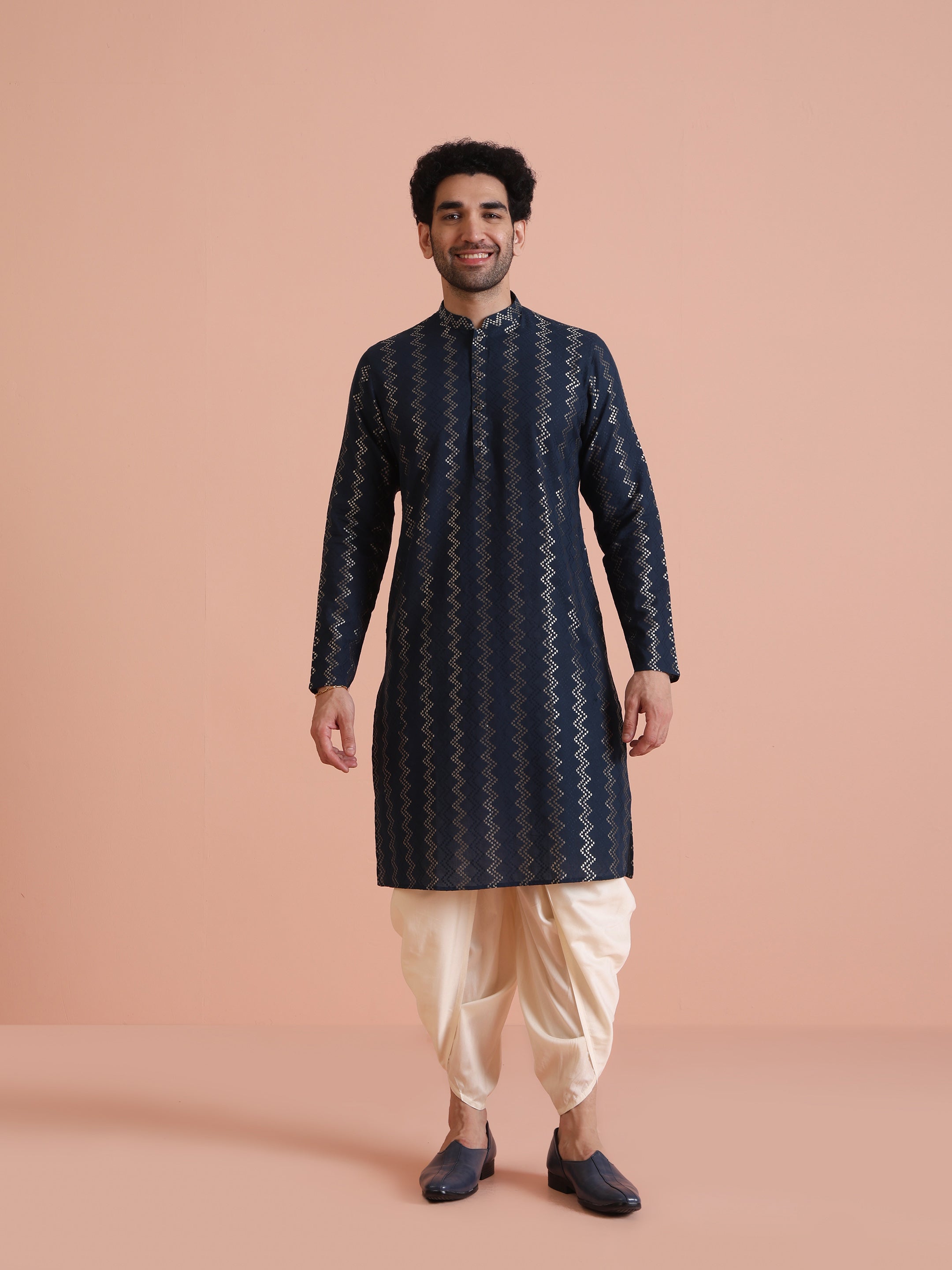 Keep it classic with this Navy Blue Cotton Blend Kurta. Featuring a textured design and regular fit, this kurta offers a refined, elegant look. Suitable for both casual and semi-formal events, this kurta brings a touch of sophistication to any occasion.
