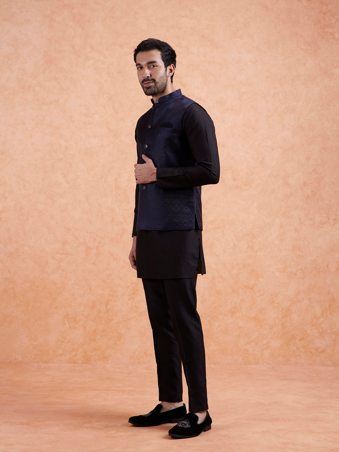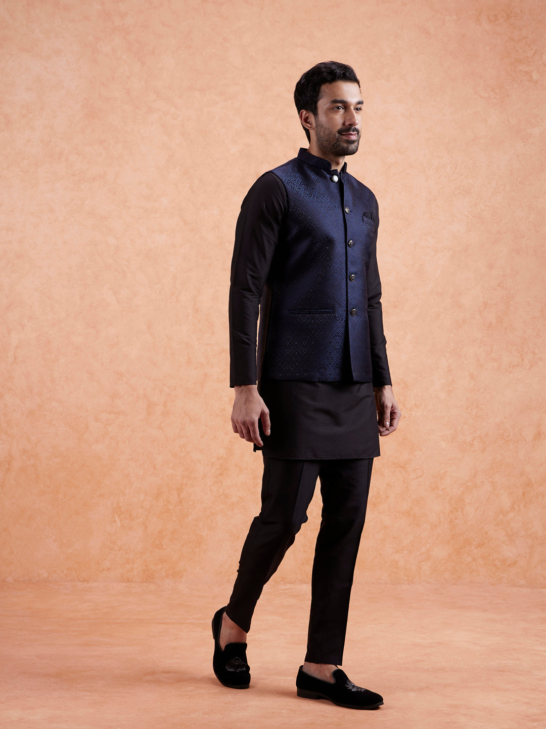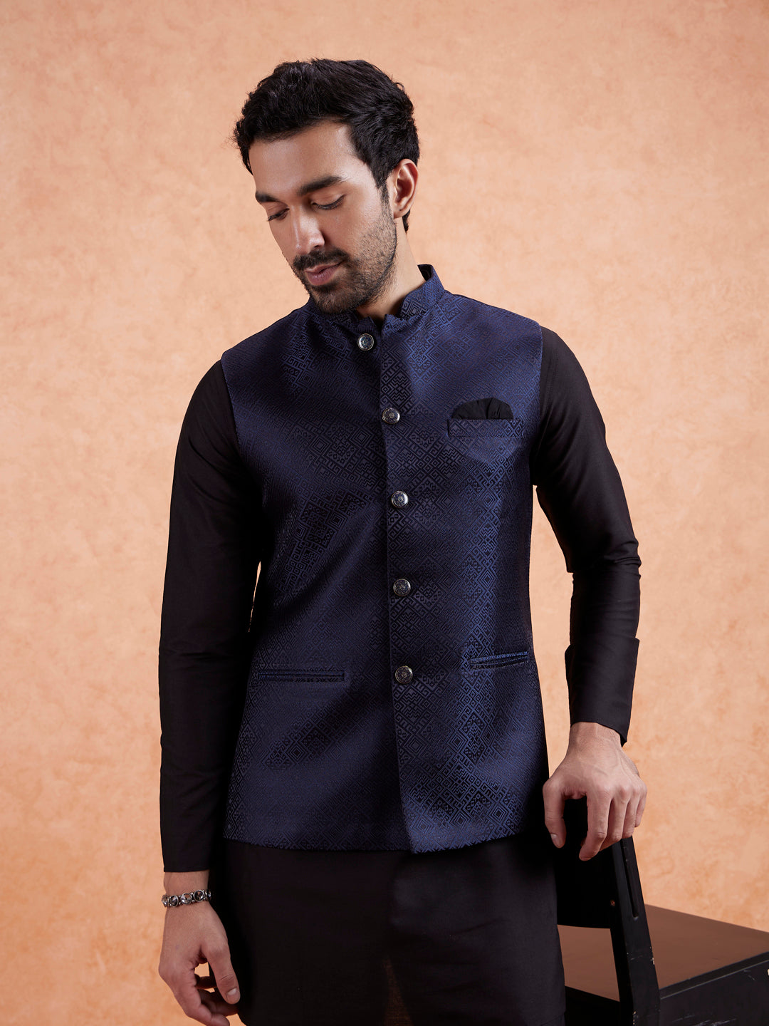 Add a sophisticated touch with this navy blue silk blend jacket featuring a textured design and regular fit. Ideal for pairing with your kurta, it enhances your ethnic ensemble.