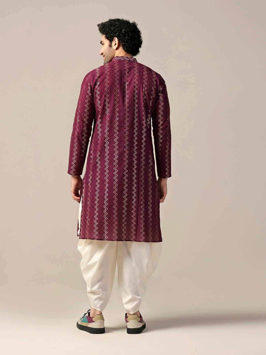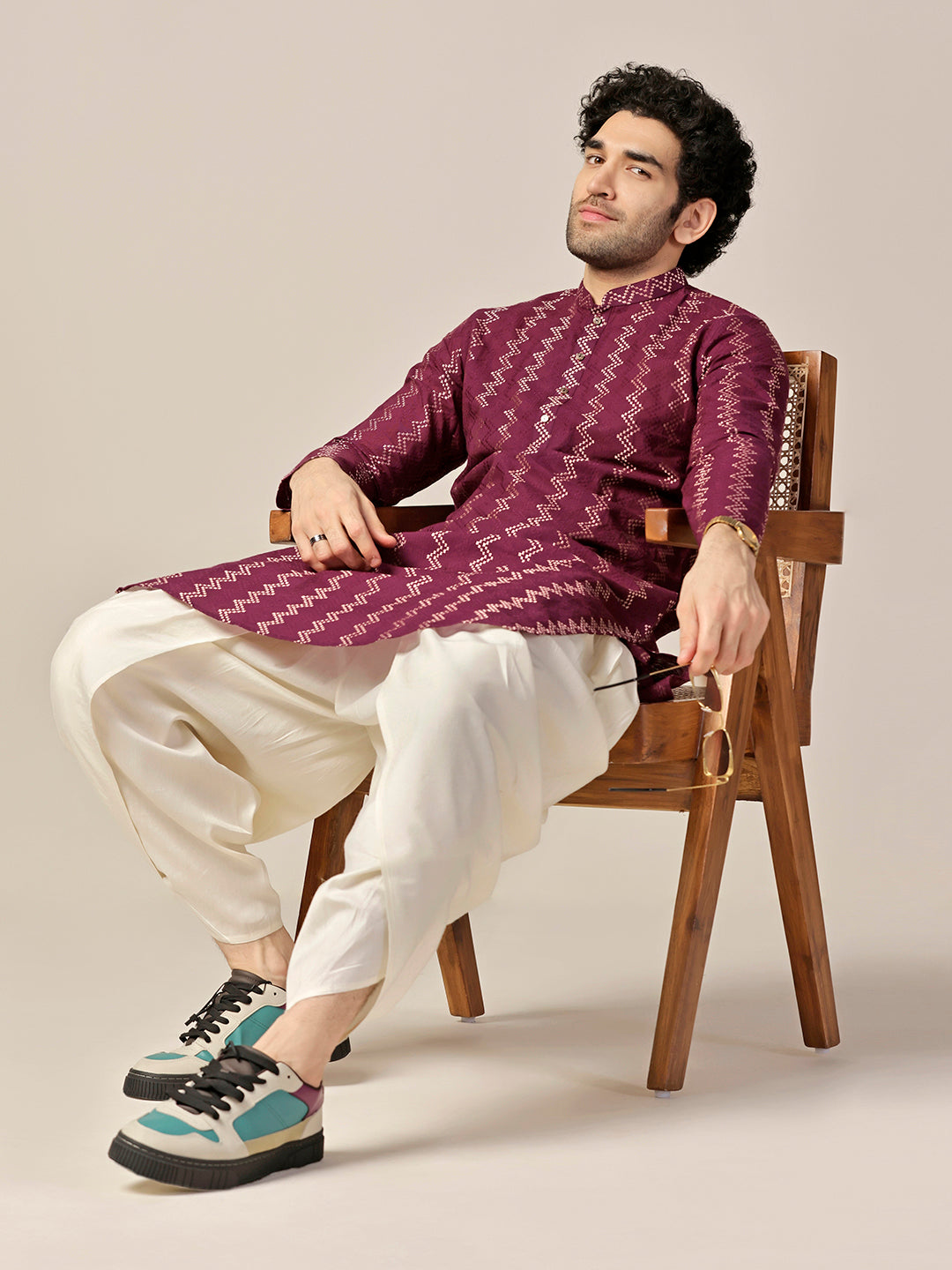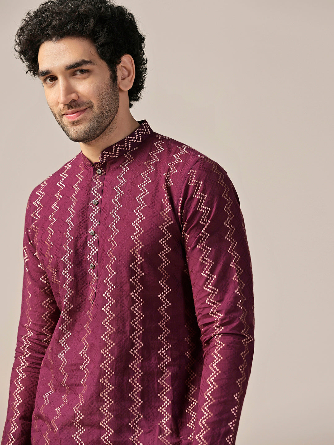 This magenta kurta features a textured design on a soft cotton blend fabric, offering a stylish look with a regular fit.