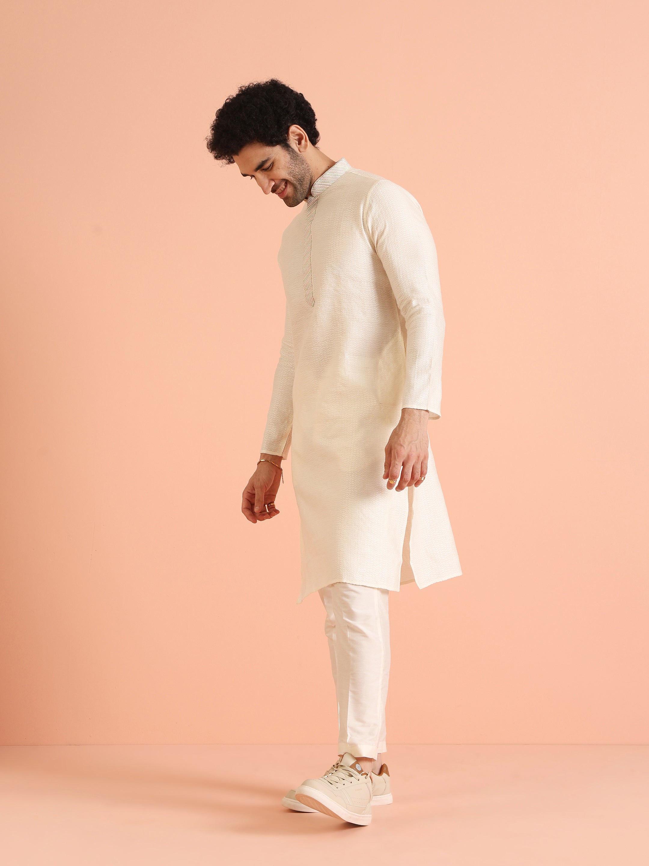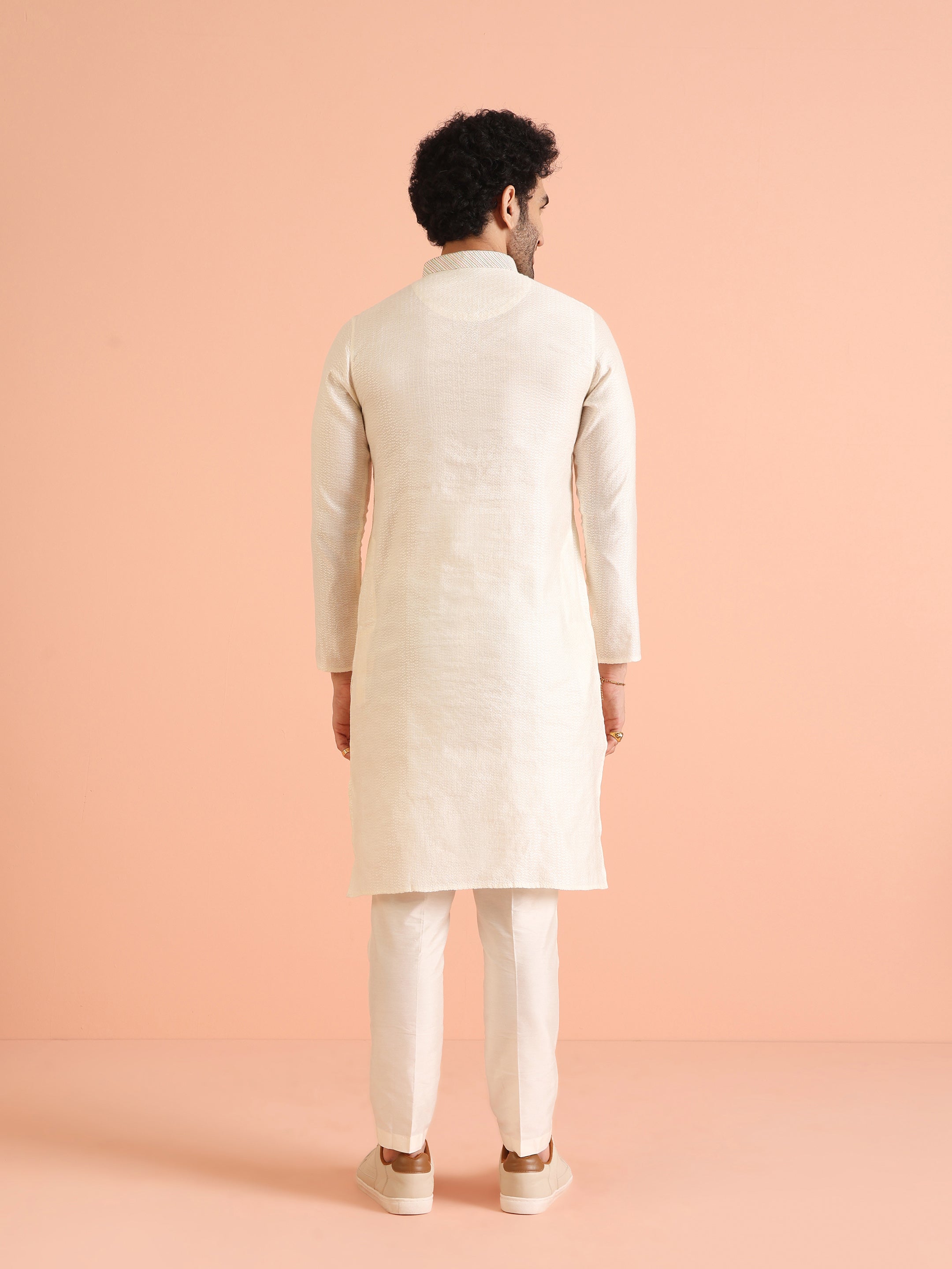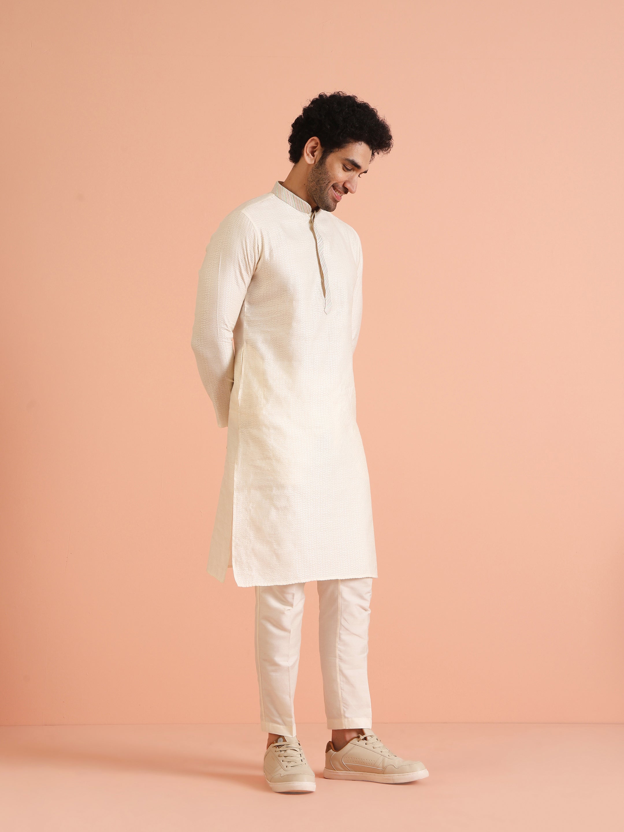 This white silk blend jacquard kurta features a woven design design and regular fit. Ideal for any occasion, it offers a blend of classic style and contemporary comfort.