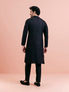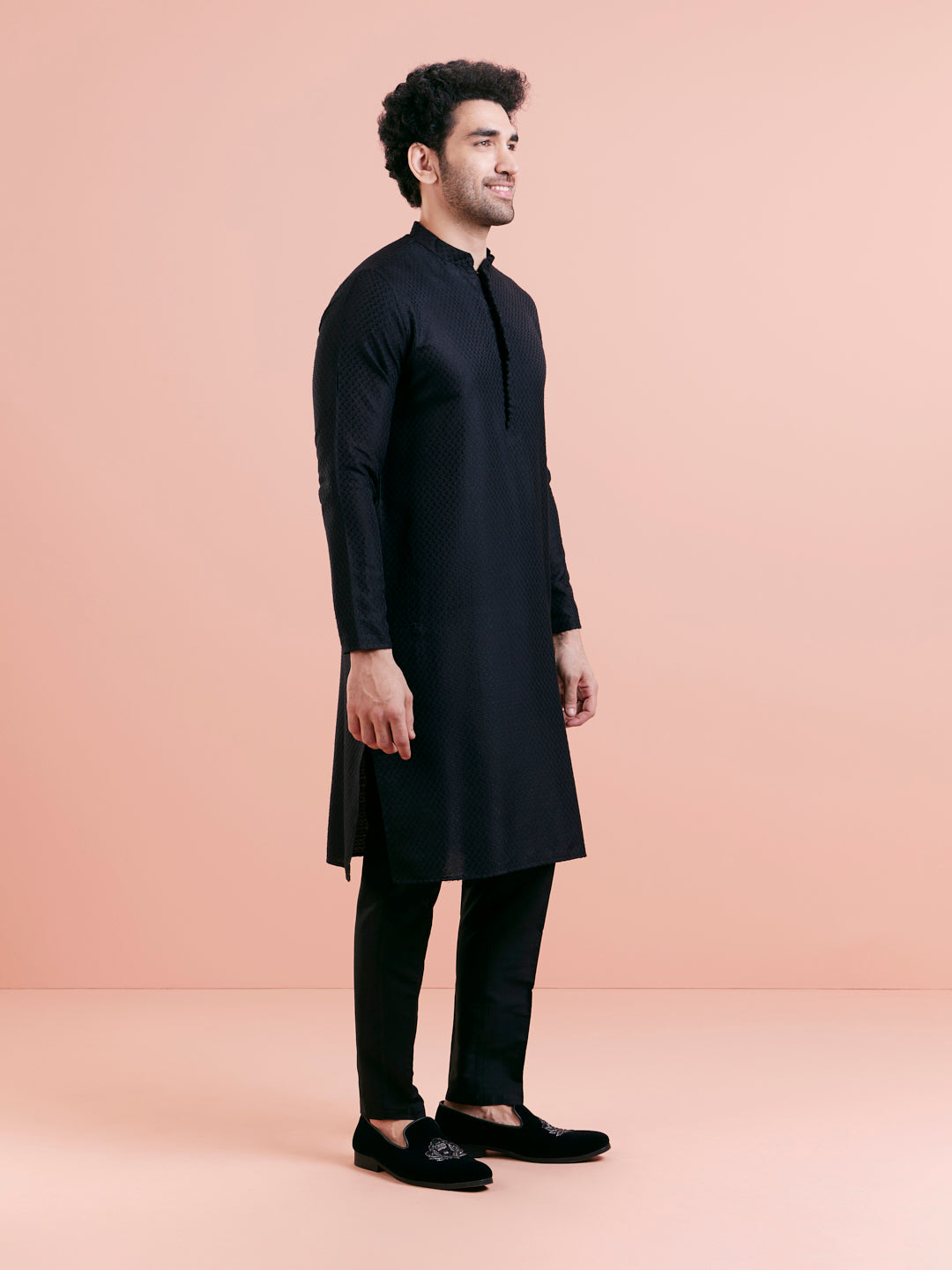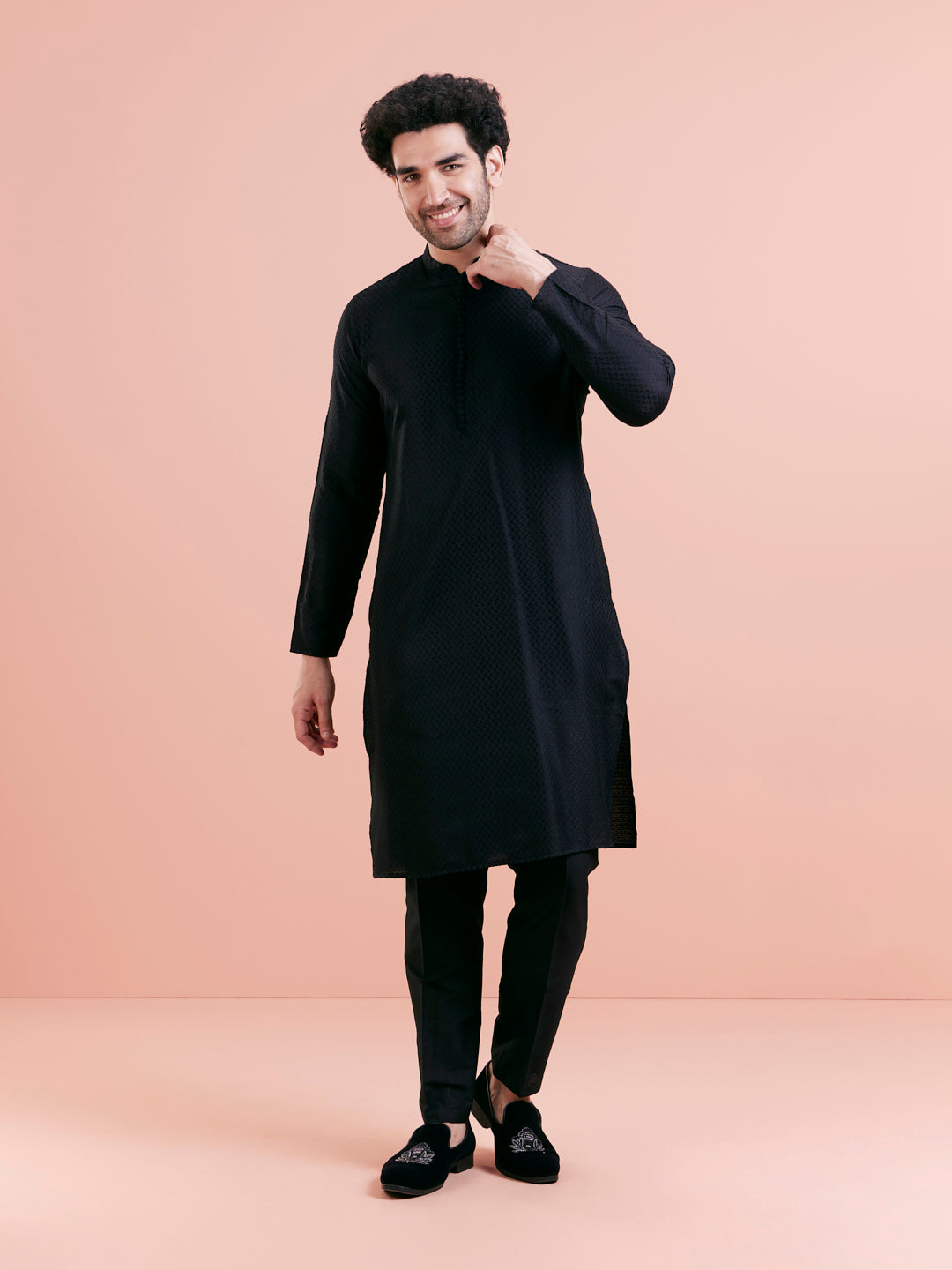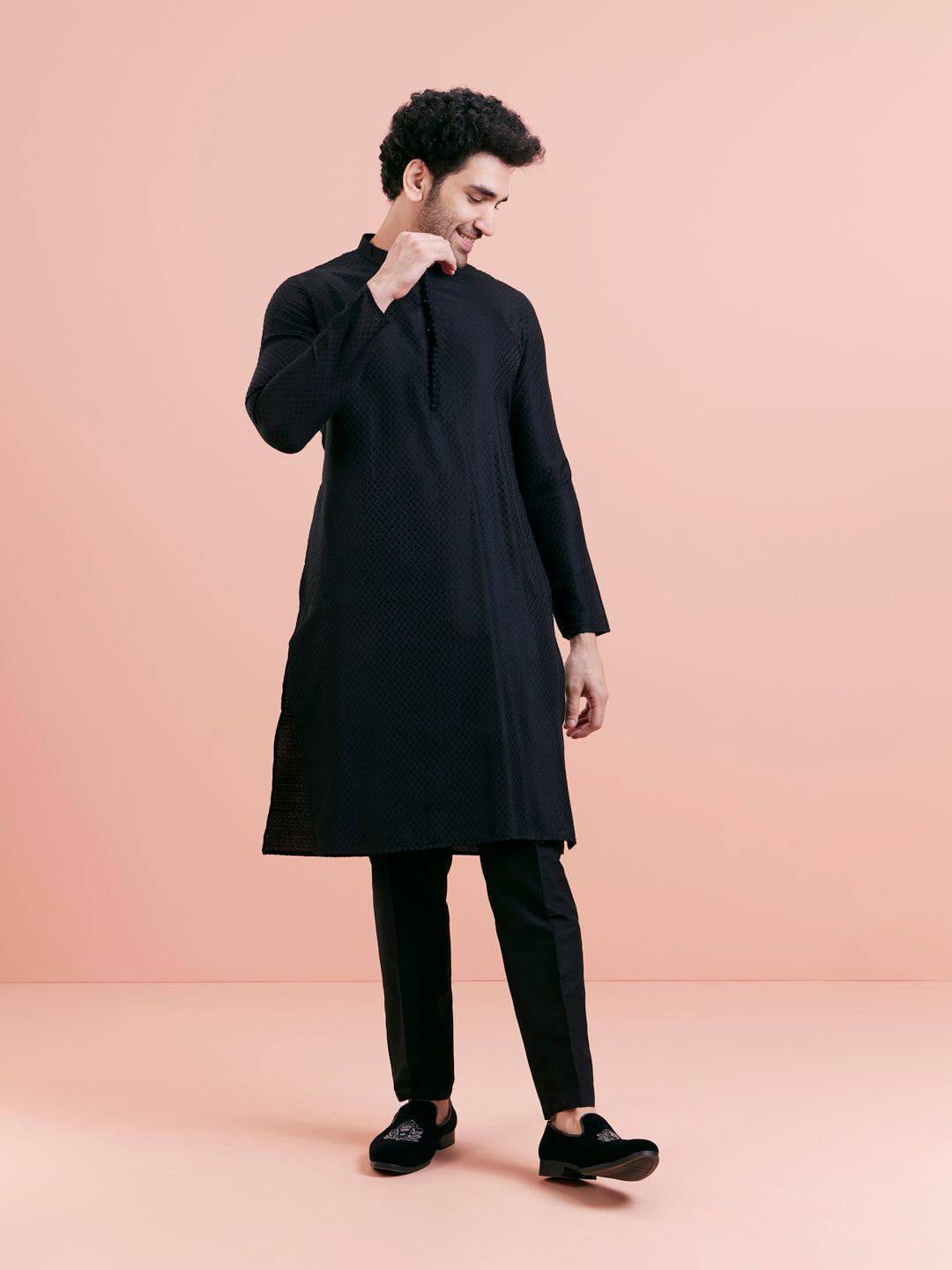 This black silk blend jacquard kurta features a textured design and regular fit. Perfect for any occasion, it combines style and comfort in one sophisticated ethnic piece.