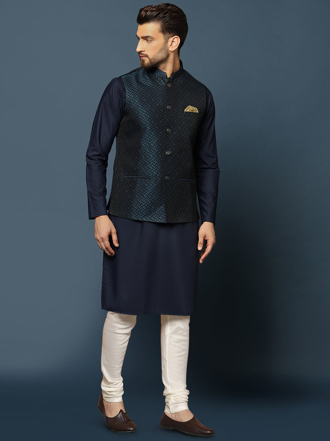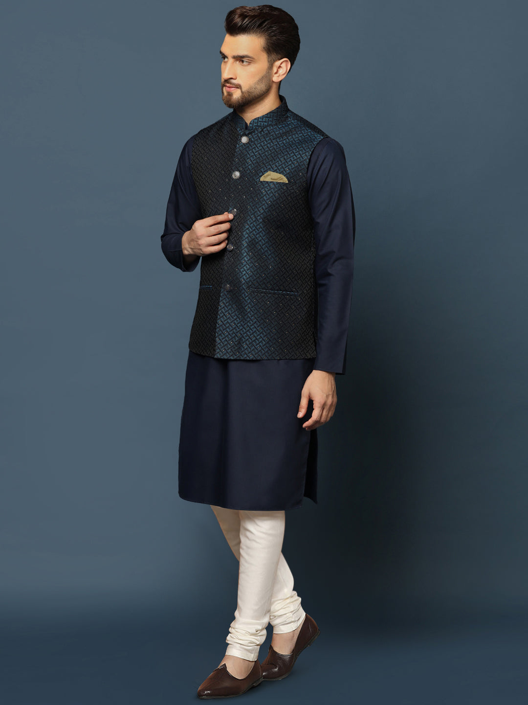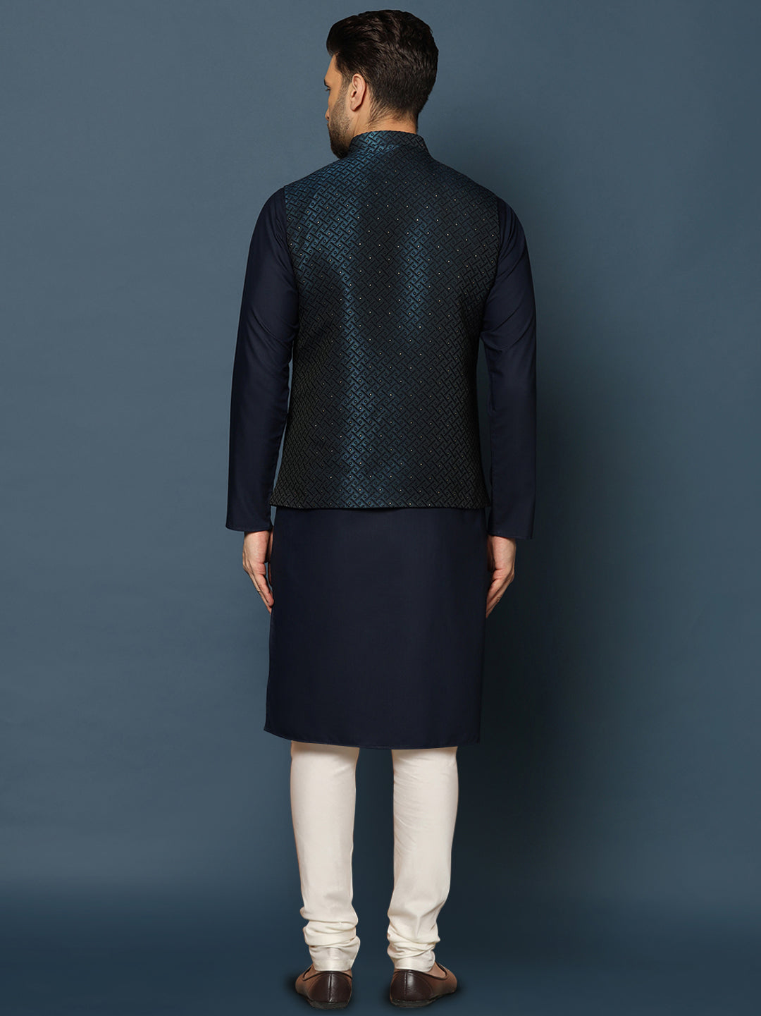 This navy blue silk blend jacquard kurta, jacket, and churidar set features embellished details and a regular fit. Perfect for festive occasions, it offers a blend of sophistication and comfort.