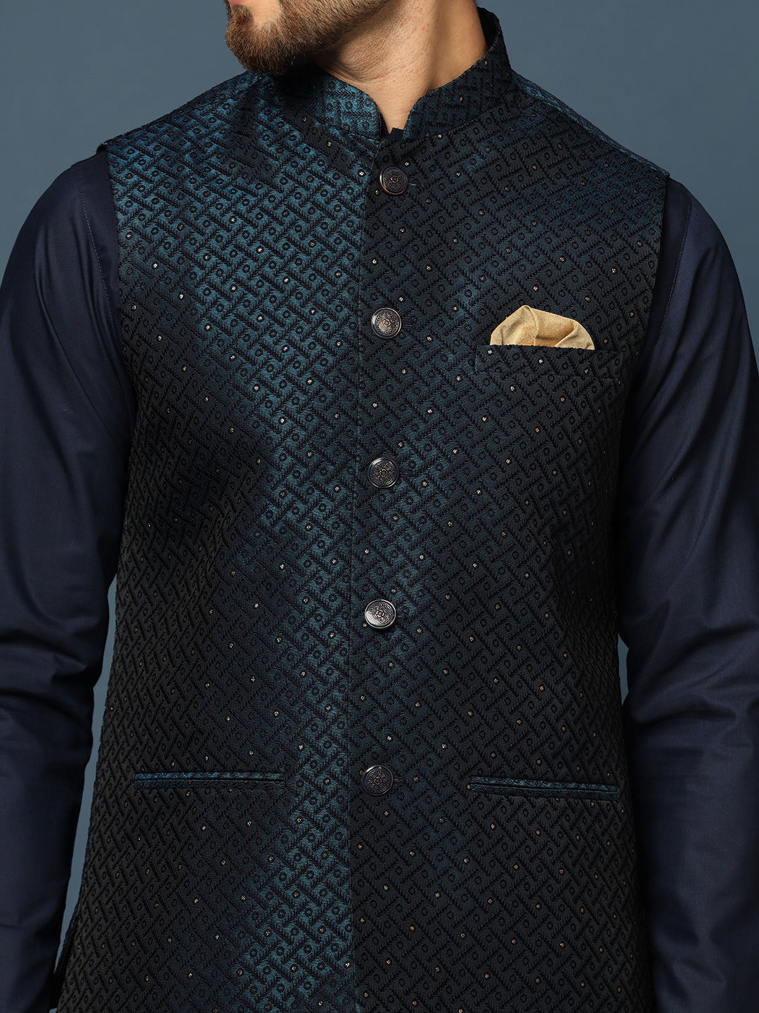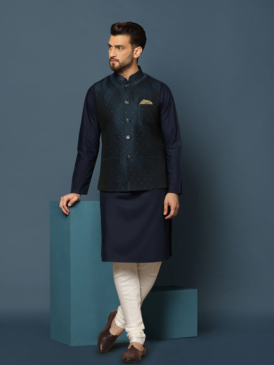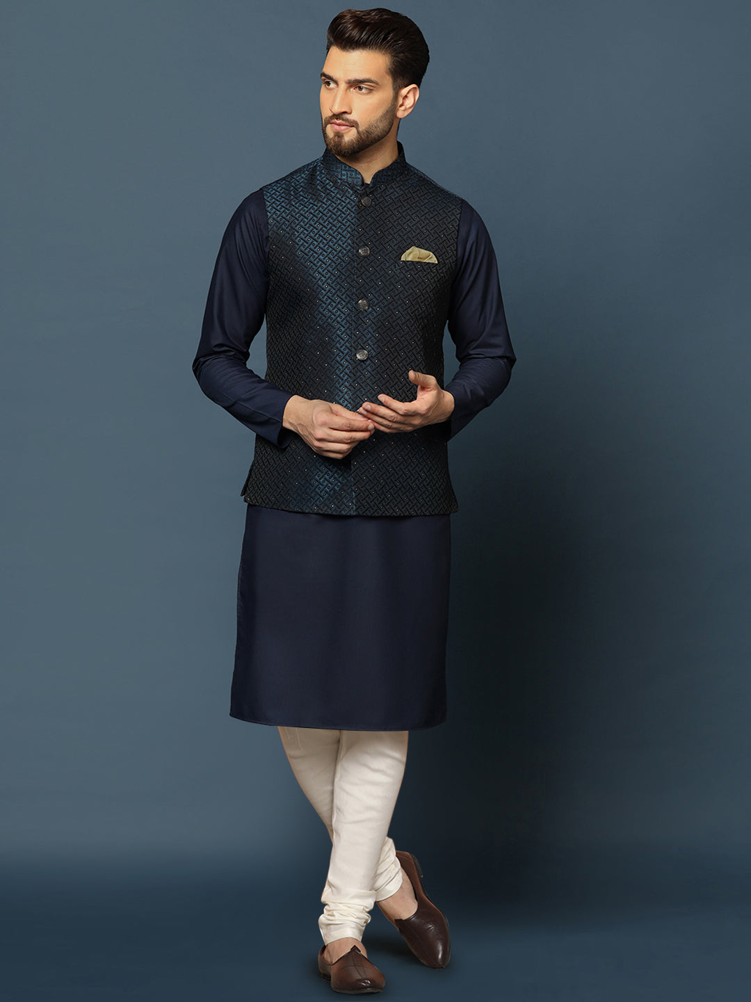 This navy blue silk blend jacquard kurta, jacket, and churidar set features embellished details and a regular fit. Perfect for festive occasions, it offers a blend of sophistication and comfort.