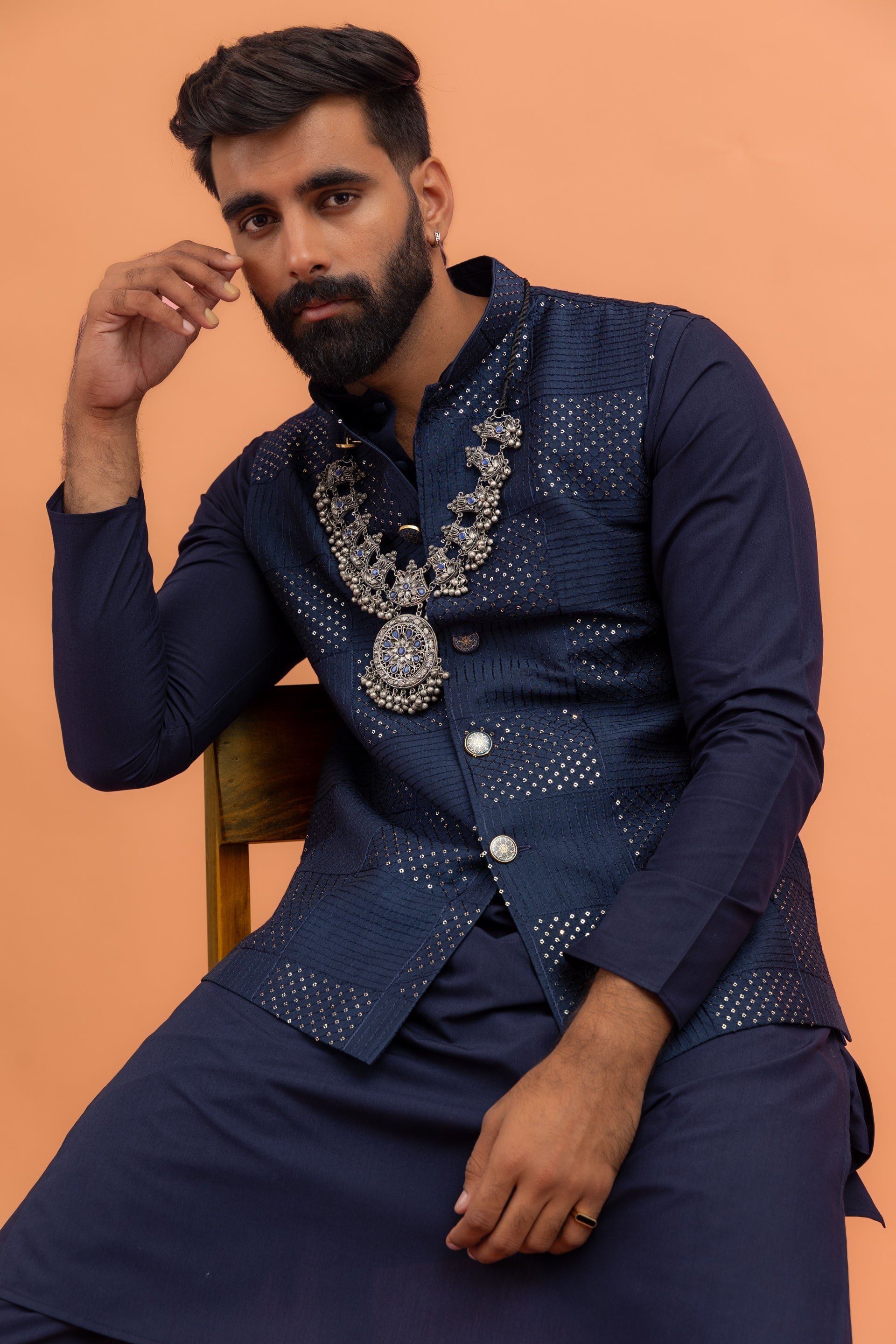 This navy blue cotton blend kurta, jacket, and trouser set features sequined embroidery and a regular fit. Perfect for festive events, it combines sparkle with sophistication.