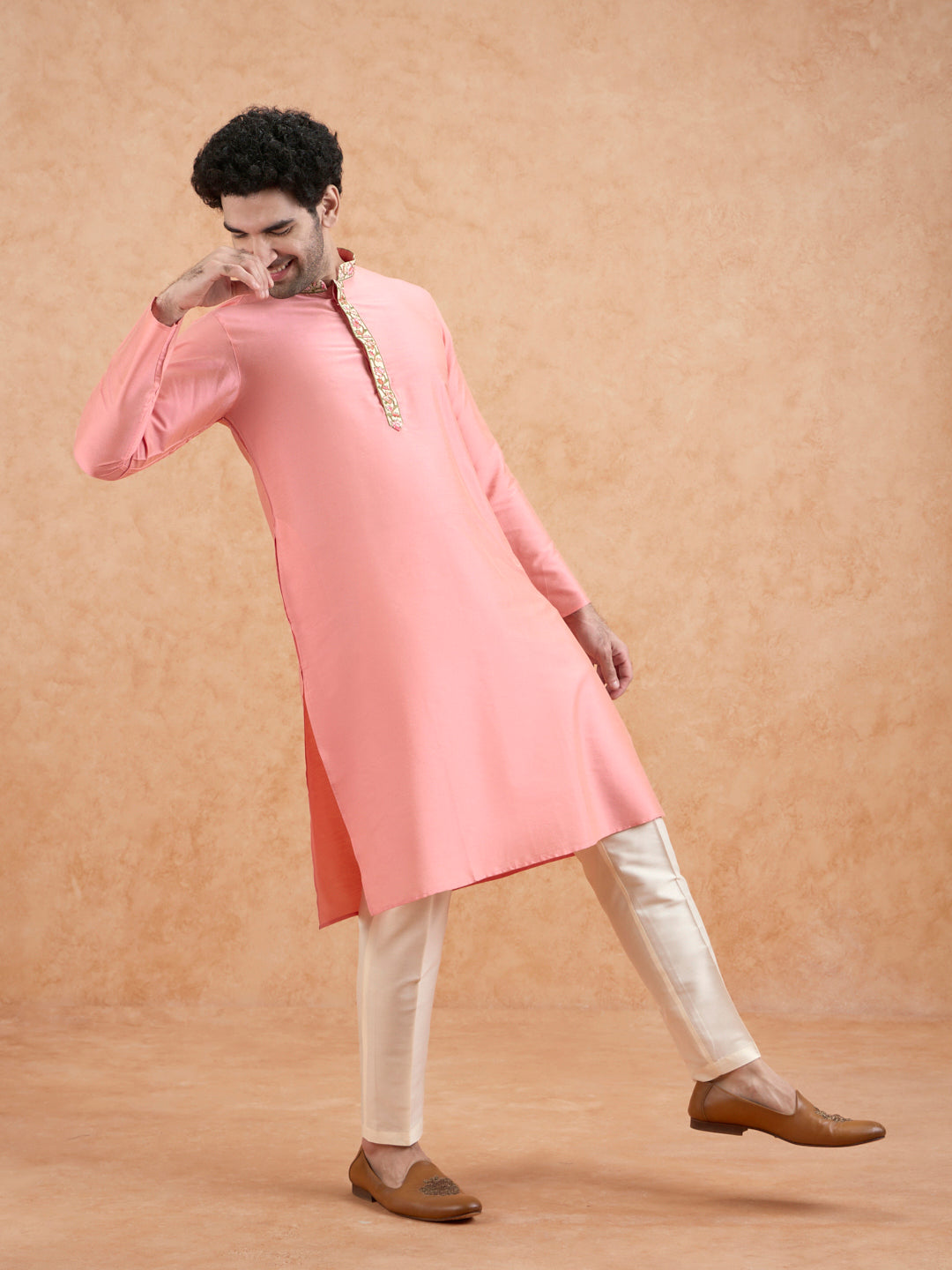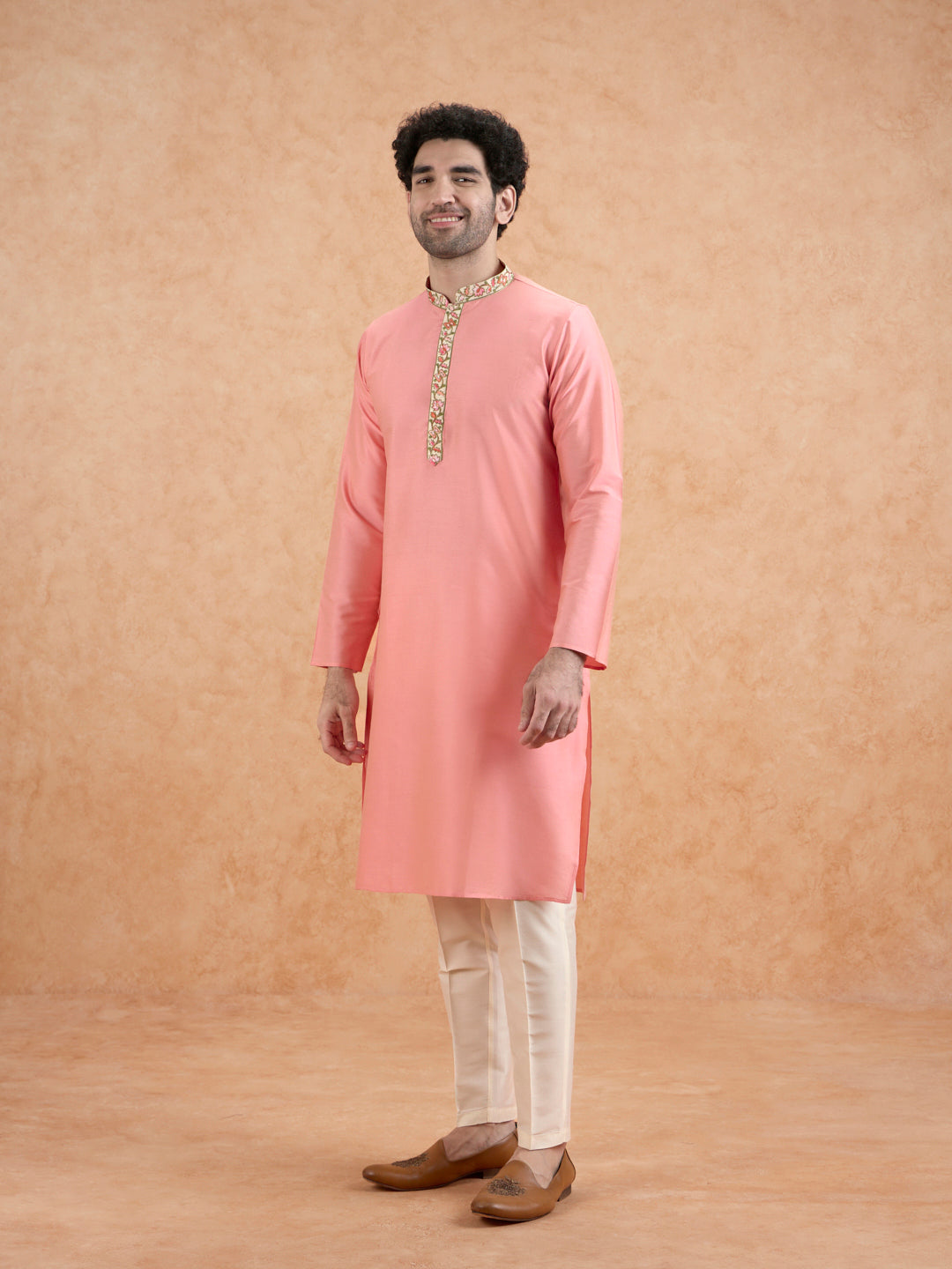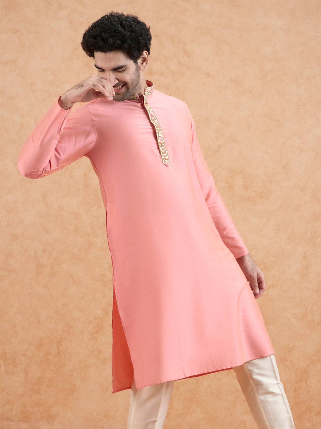 Brighten your look with our Hot Pink Kurta. This solid-colored cotton blend kurta features a regular fit, making it a stylish choice for any occasion.