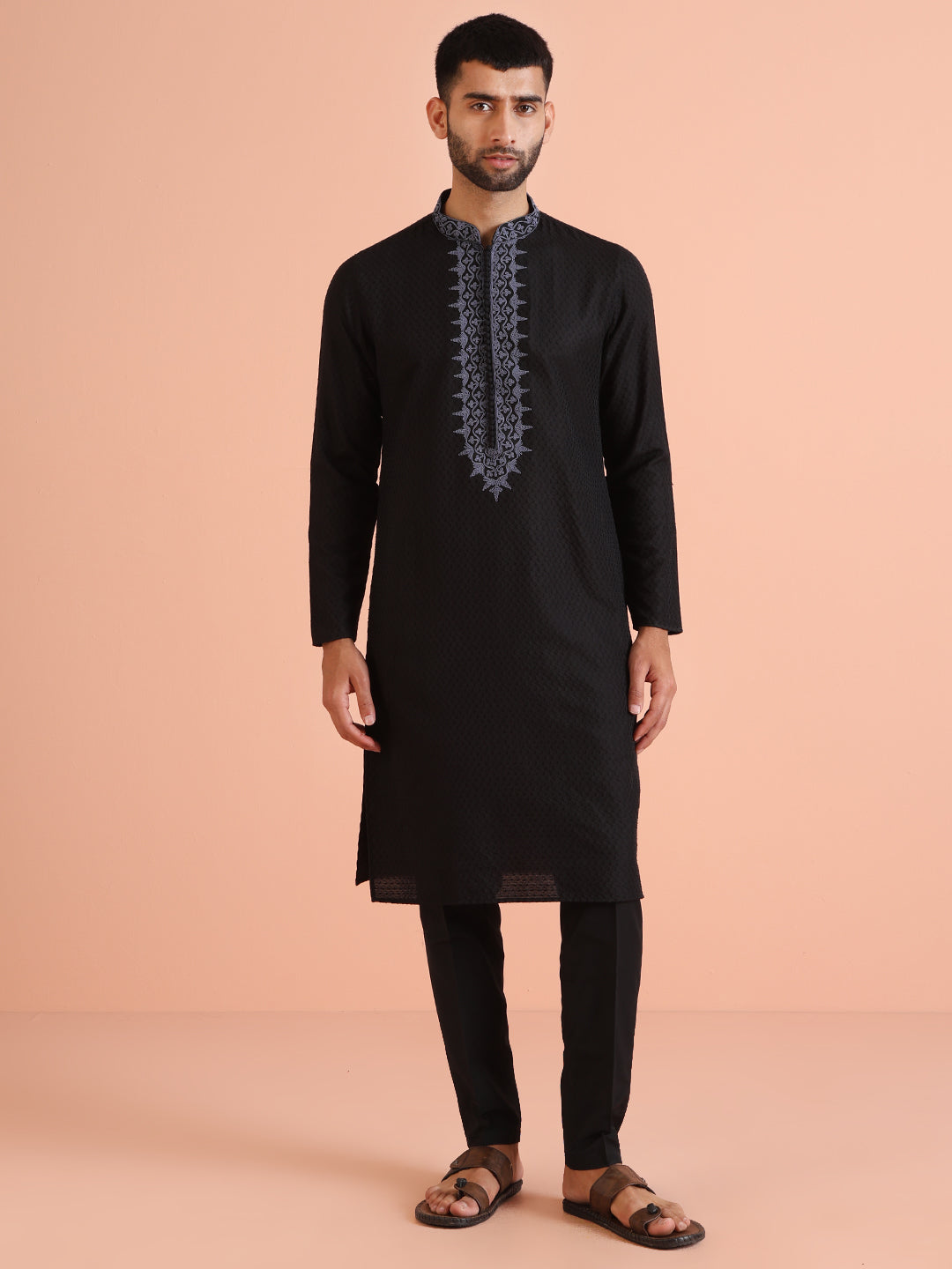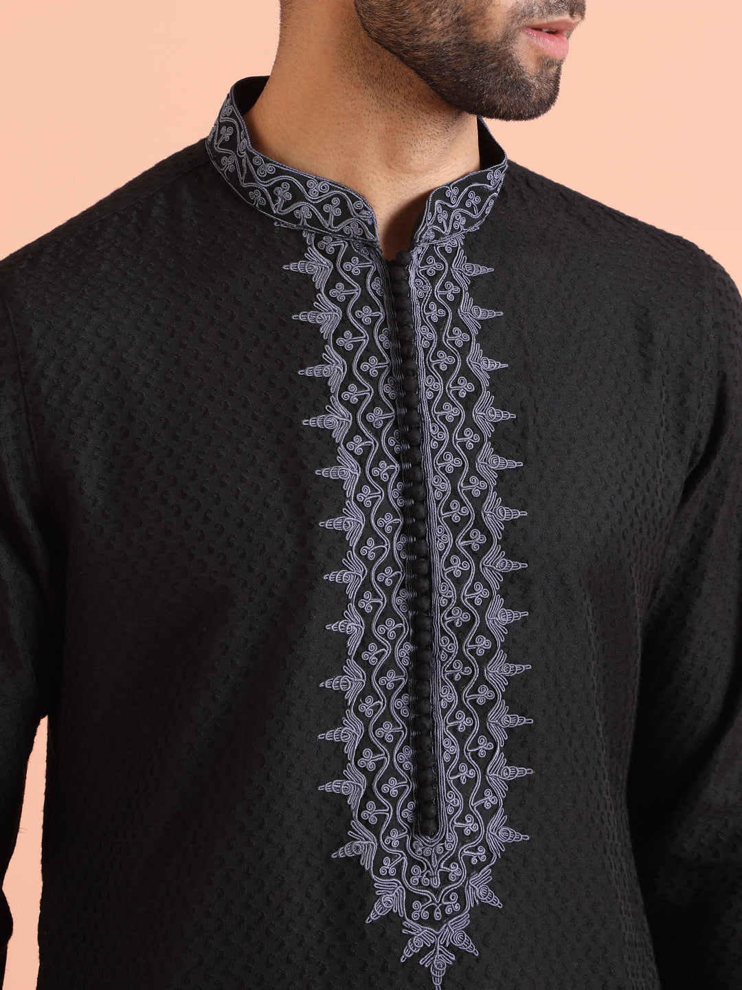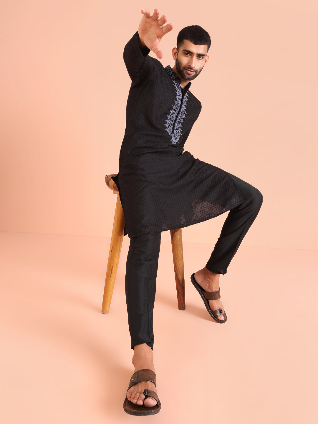 This Black Kurta Trouser Set is a yes for all your casual occasions. The Kurta is of Silk Blend which adds on to the defined and modern look. This set includes Bottomwear to complete your look