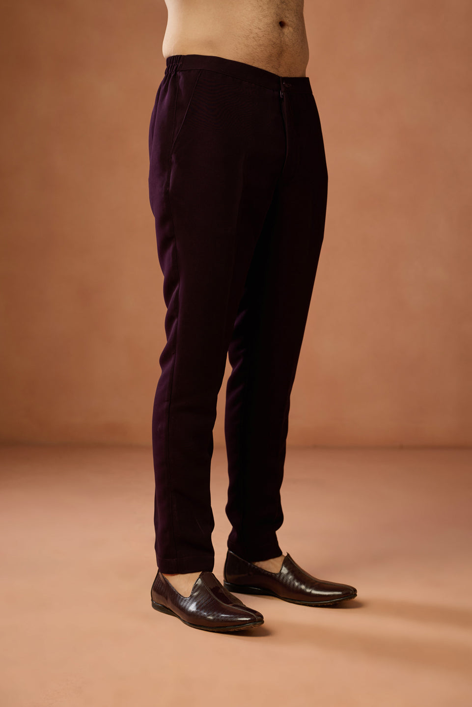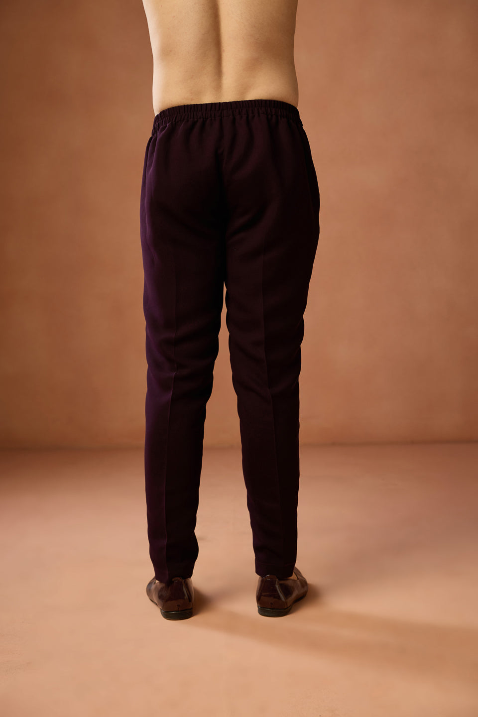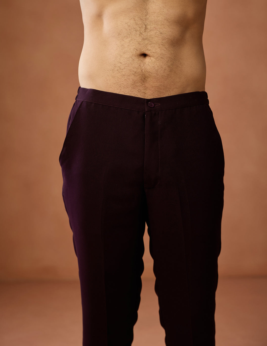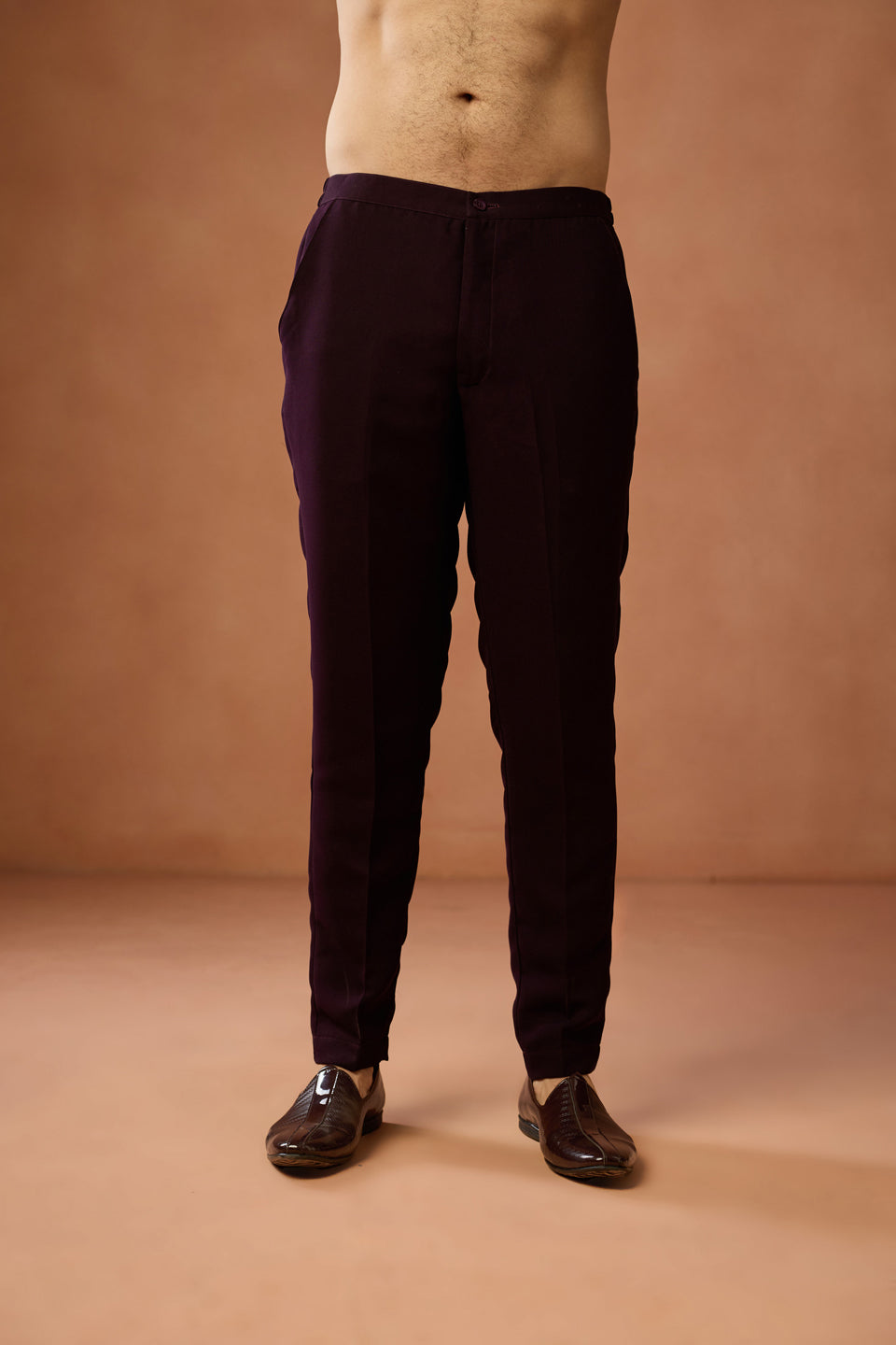 Kisah Menss Dark Wine Slim Fit Trouser in premium cotton-silk blend, versatile bottomwear for pairing with kurtas, sherwanis, or jackets.