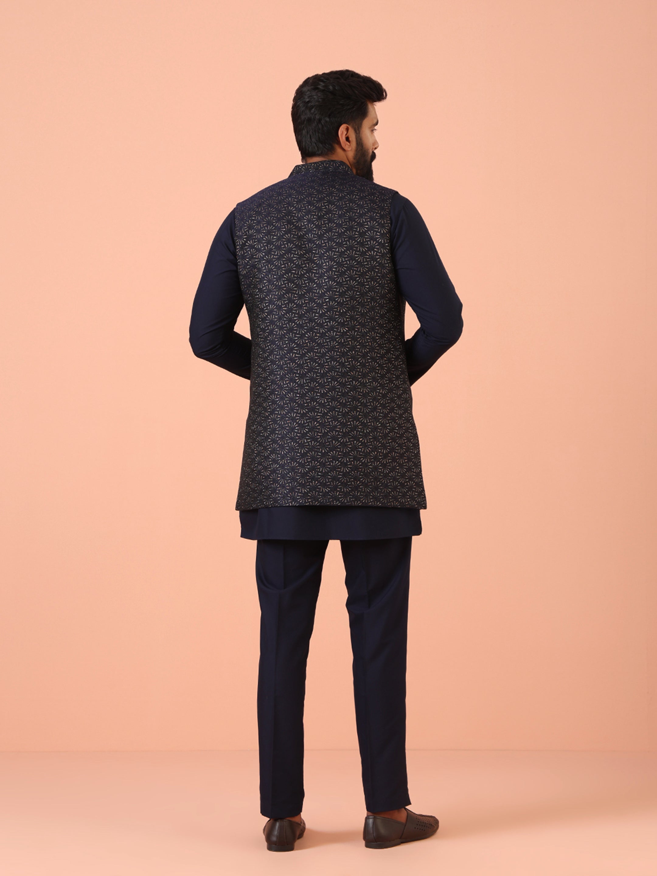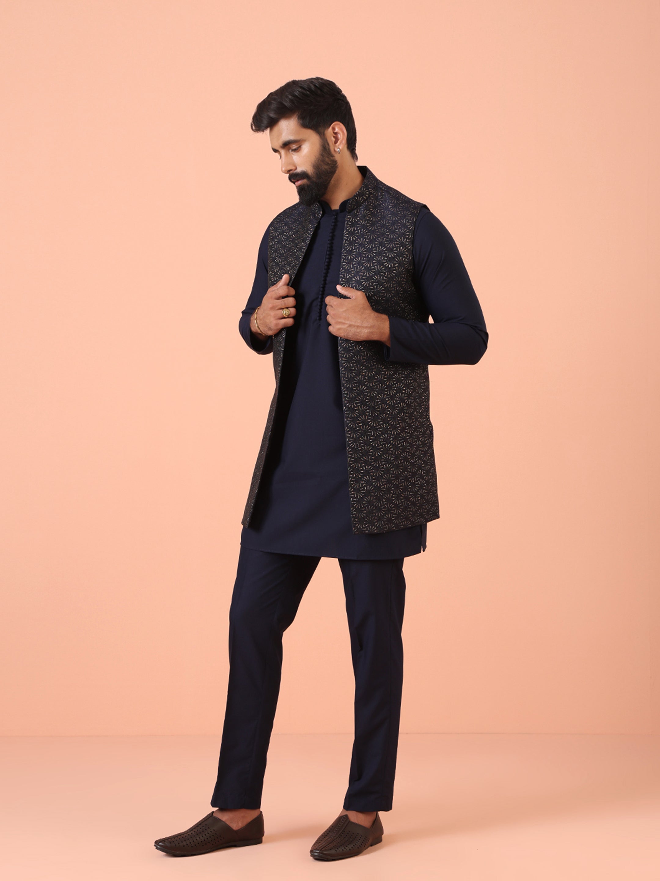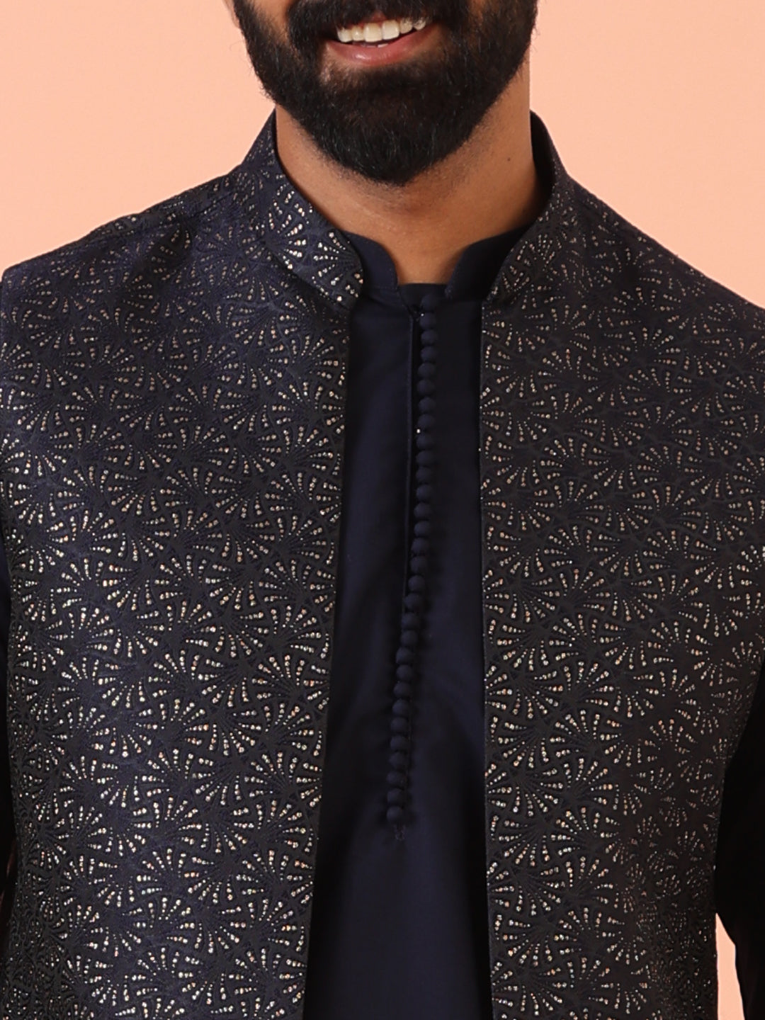 Experience classic elegance with this Men's Navy Blue Color Silk Blend Kurta Jacket Trousers Set. The Zari Pattern adds a refined touch, while the breathable fabric ensures comfort throughout the day. Ideal for festive events or casual wear, this Kurta Jacket Trouser Set is a wardrobe essential.