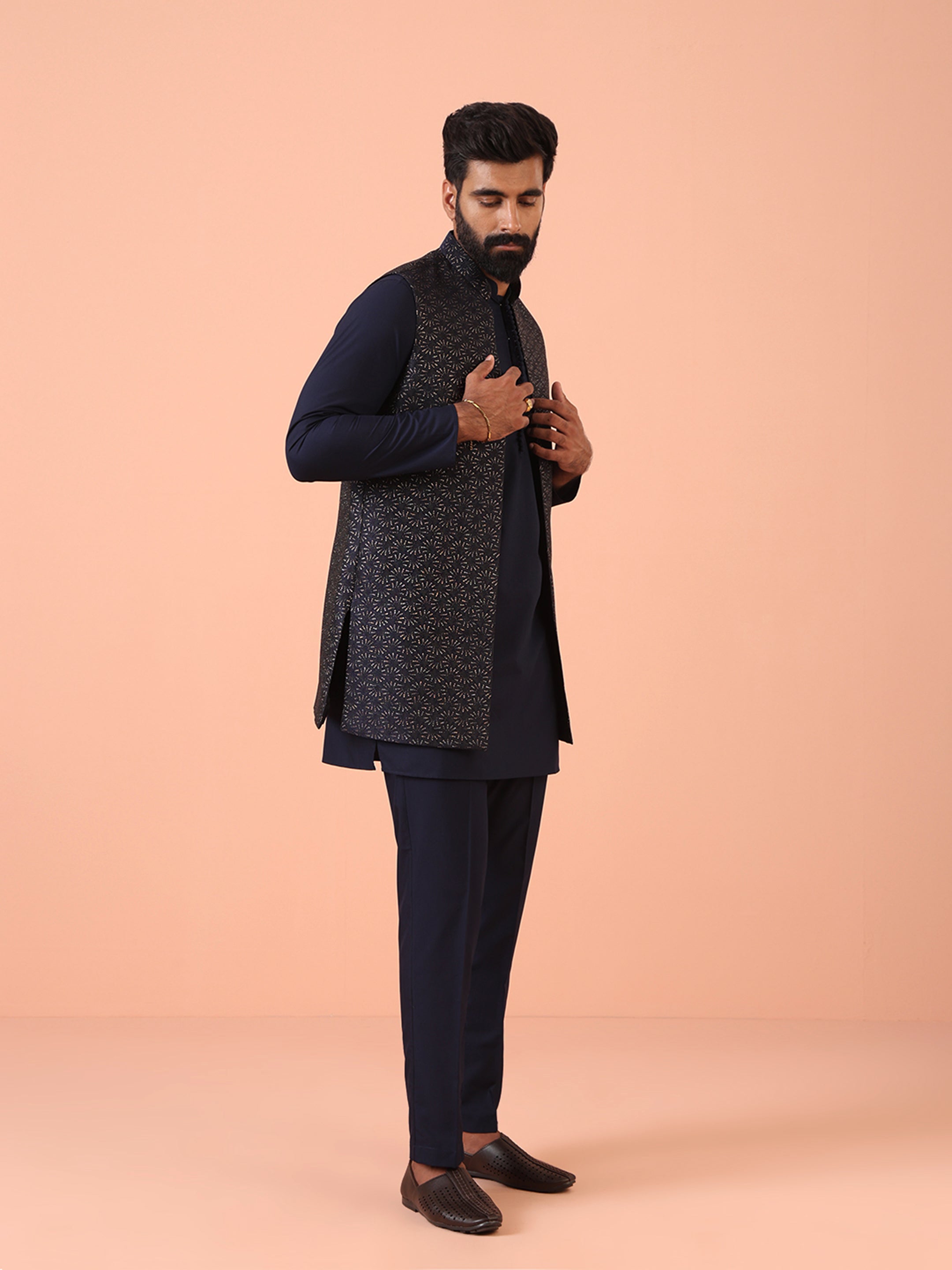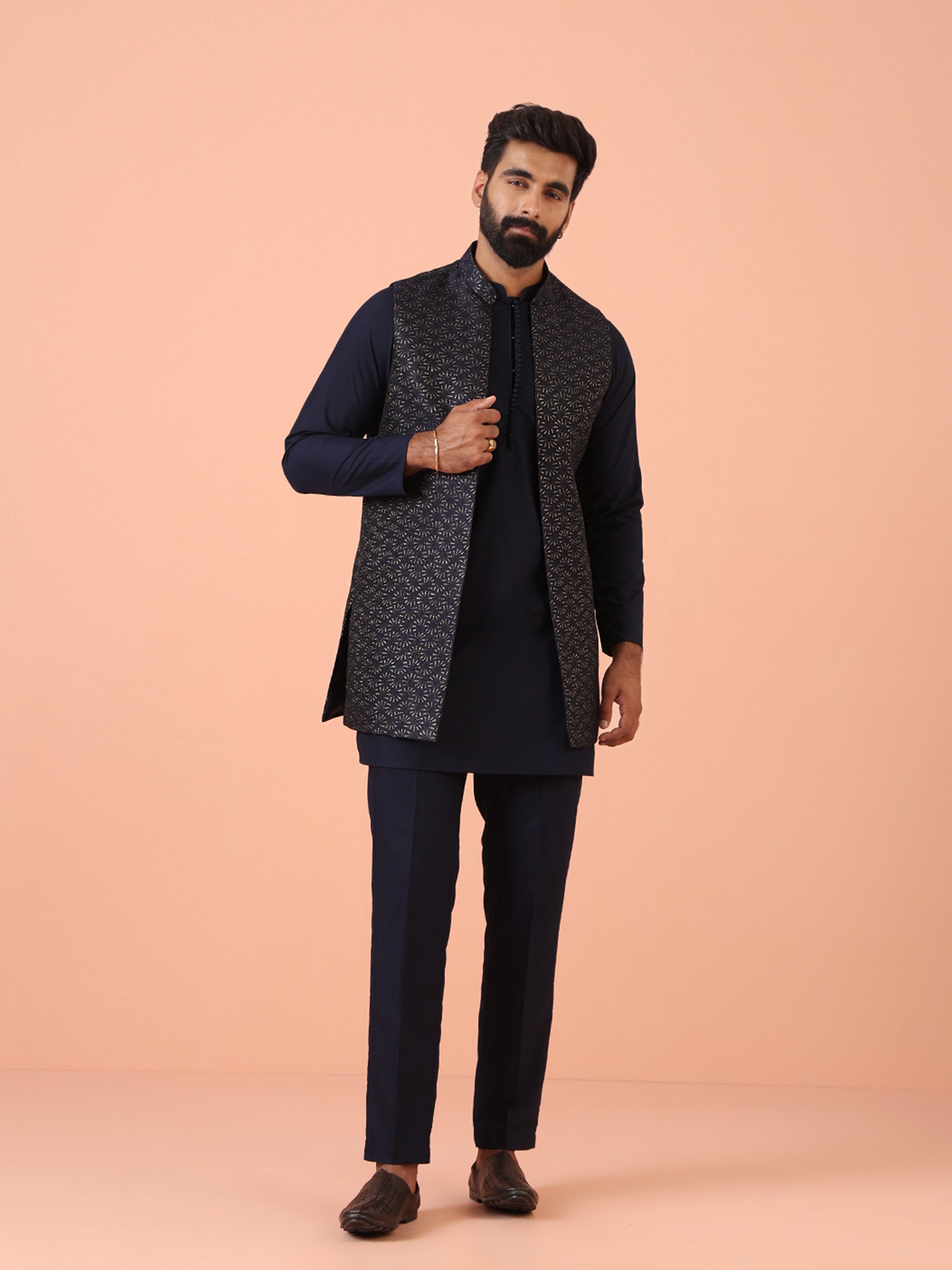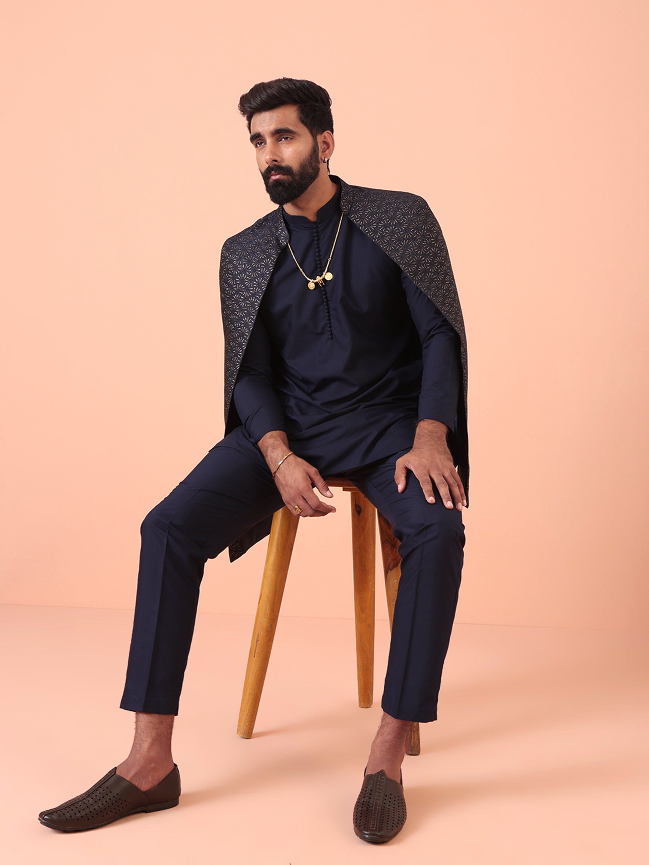 Experience classic elegance with this Men's Navy Blue Color Silk Blend Kurta Jacket Trousers Set. The Zari Pattern adds a refined touch, while the breathable fabric ensures comfort throughout the day. Ideal for festive events or casual wear, this Kurta Jacket Trouser Set is a wardrobe essential.