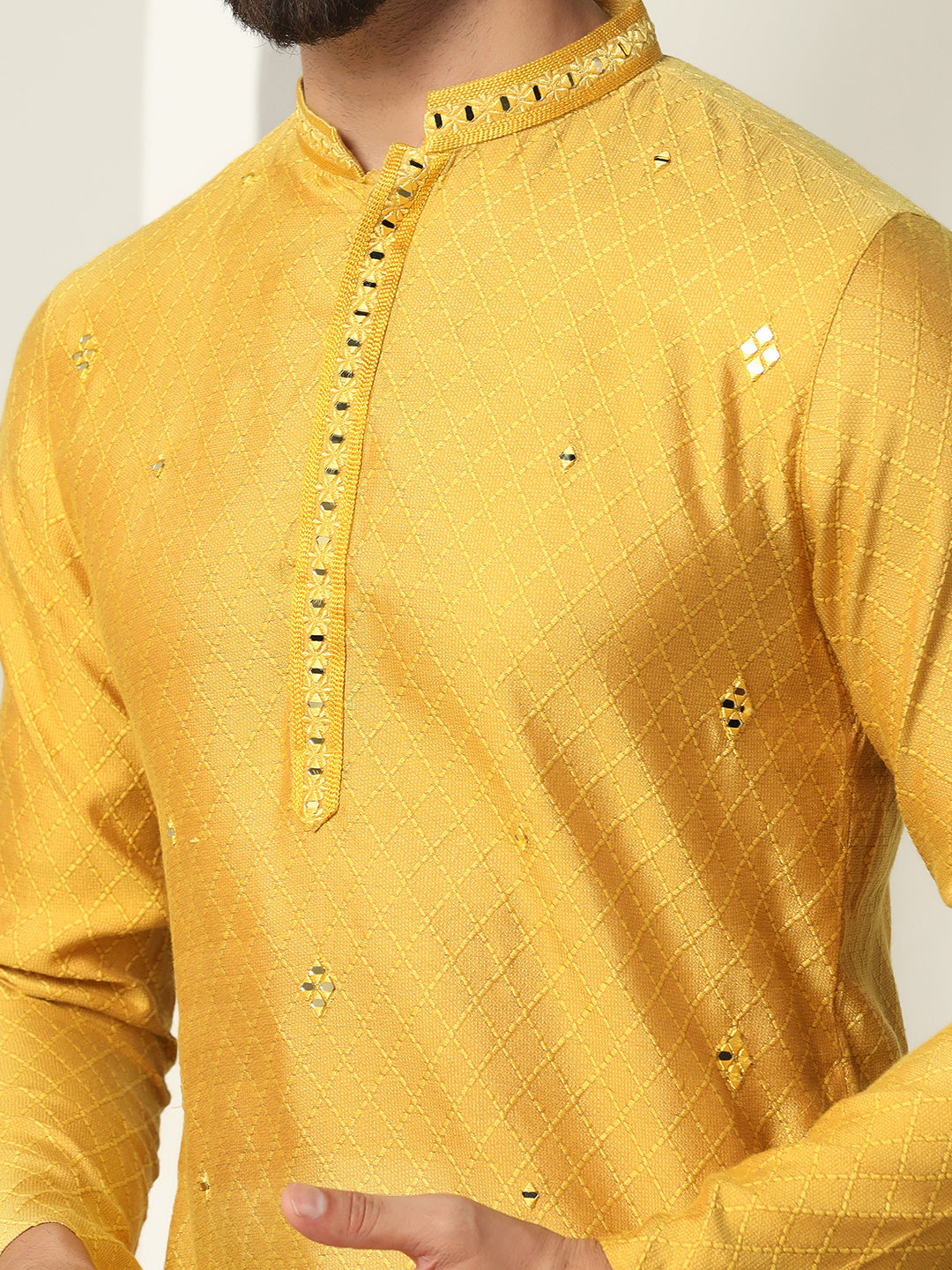 This Kurta Set with Mustard Color is an elegant mandarin collar style that is perfect for occasional wear. With a full sleeve Woven Design design and comfortable fabric, it will make you look stylish.