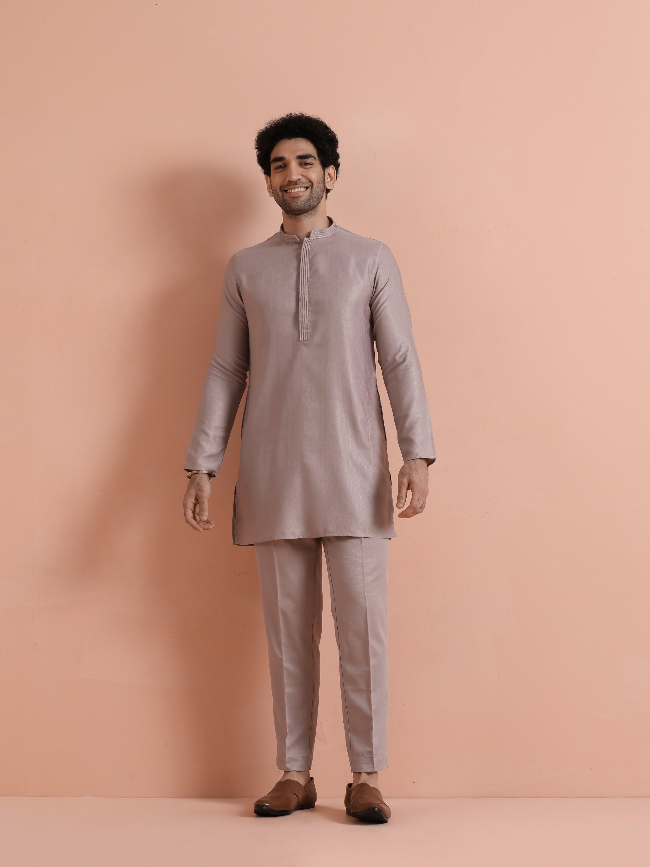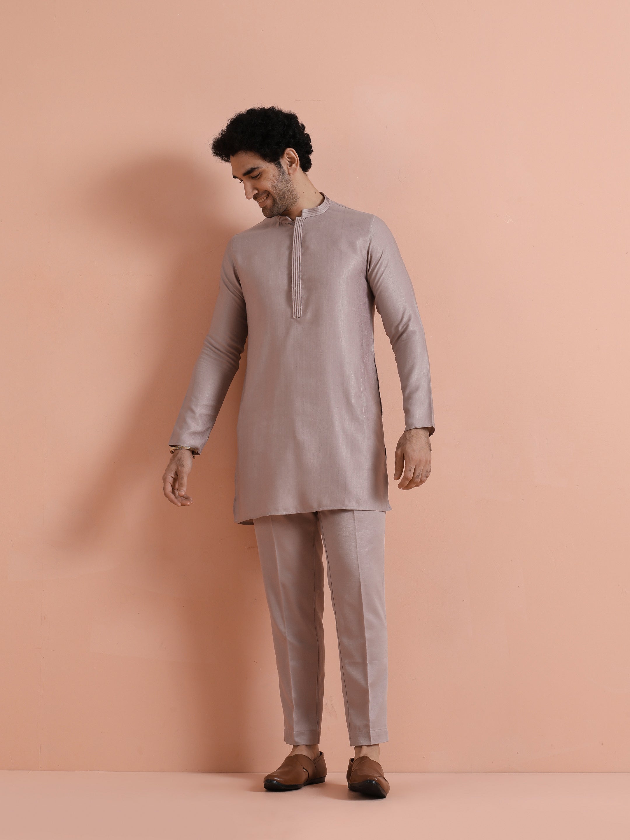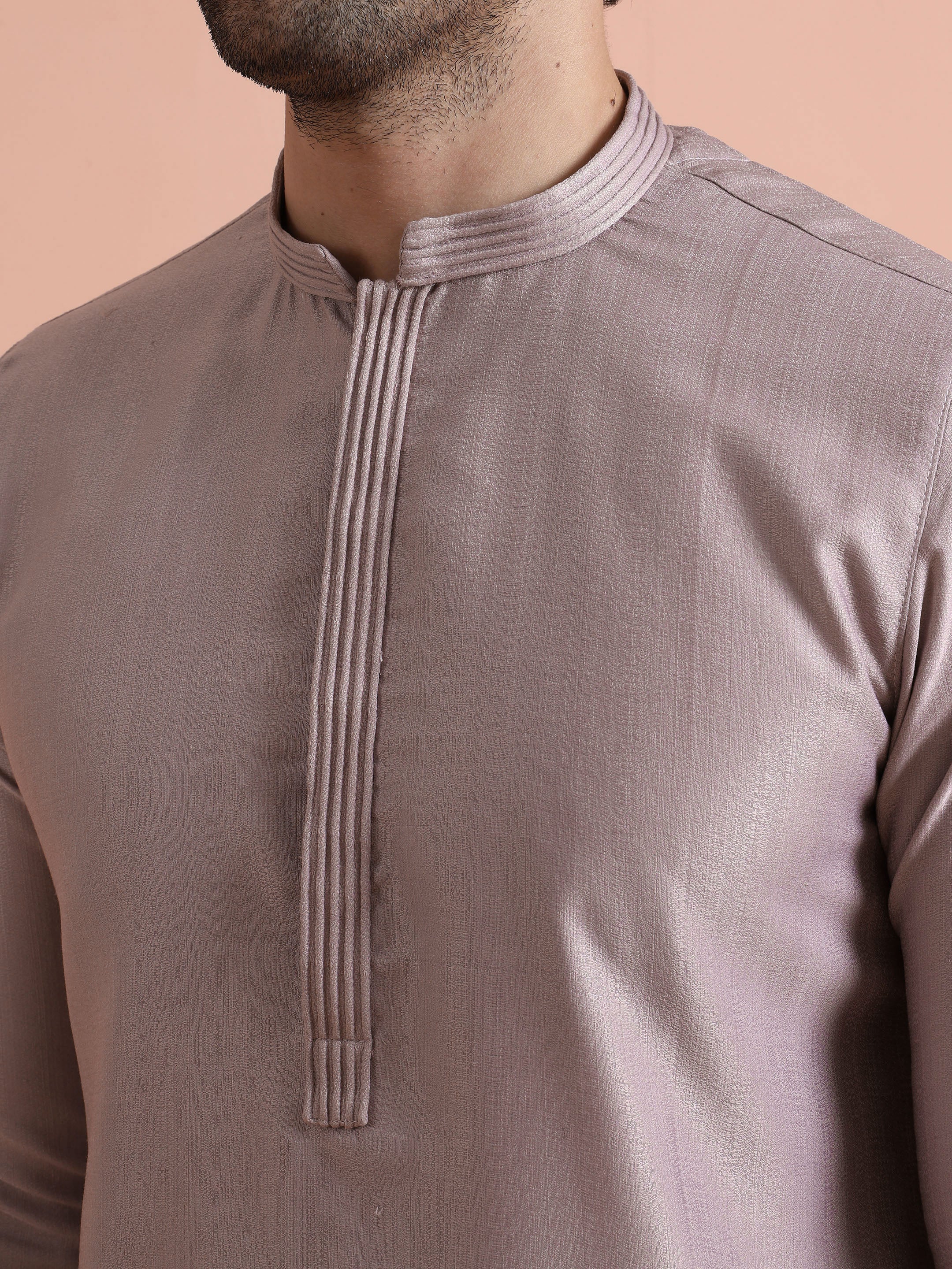 Elegant mauve silk blend mid kurta trouser set with minimal design. Ideal for festive gatherings, weddings, and evening occasions. Stylish, comfortable, and versatile.