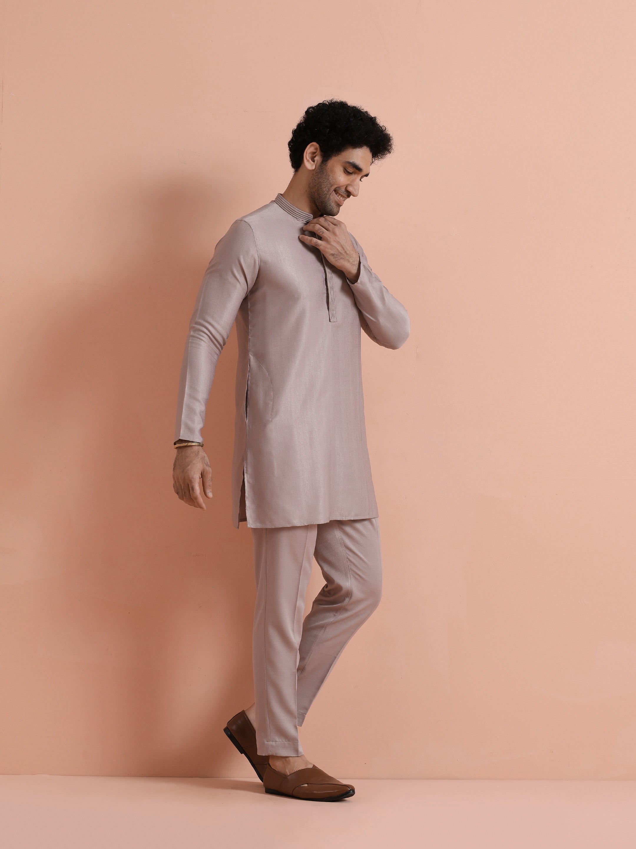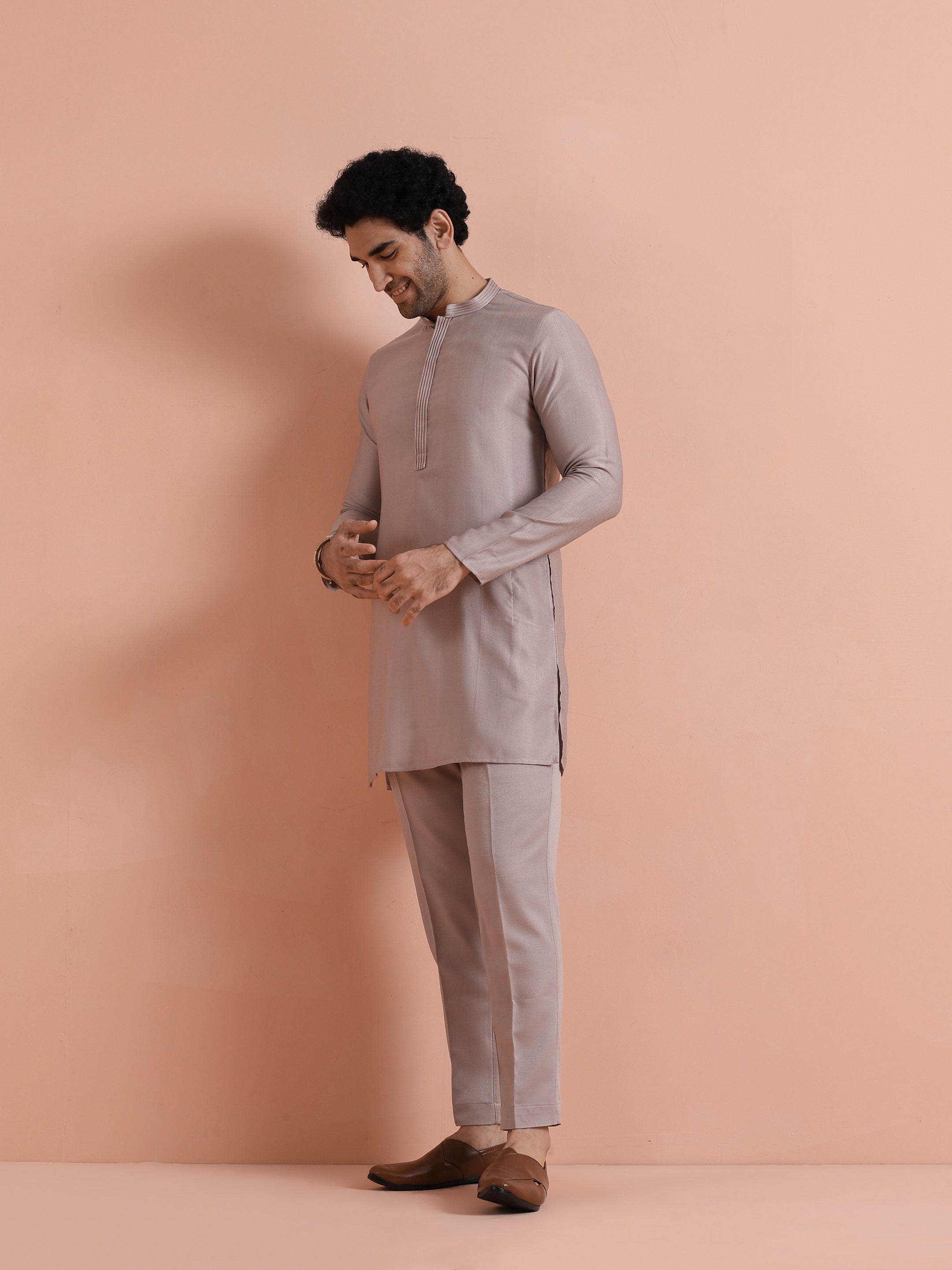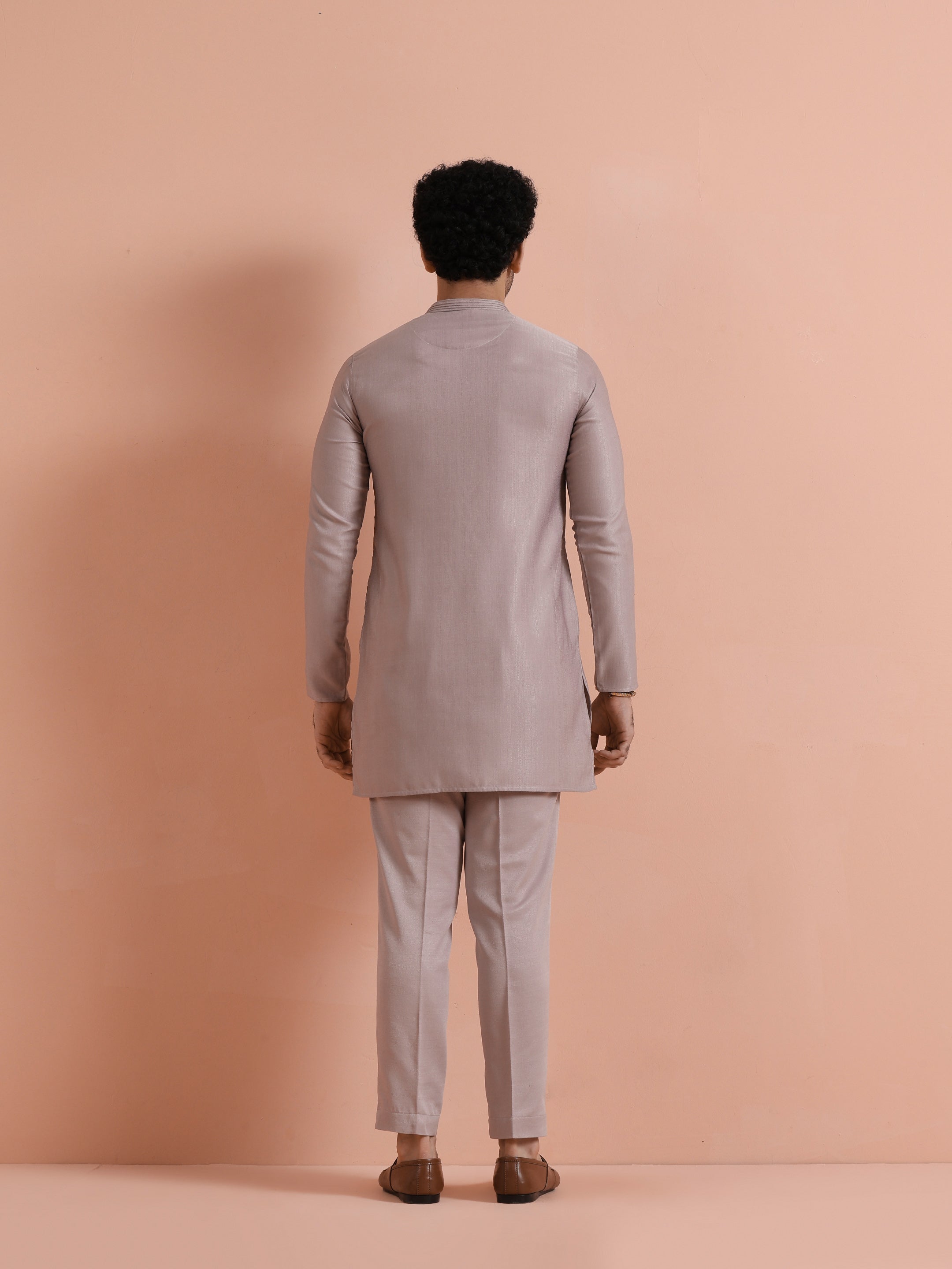 Elegant mauve silk blend mid kurta trouser set with minimal design. Ideal for festive gatherings, weddings, and evening occasions. Stylish, comfortable, and versatile.