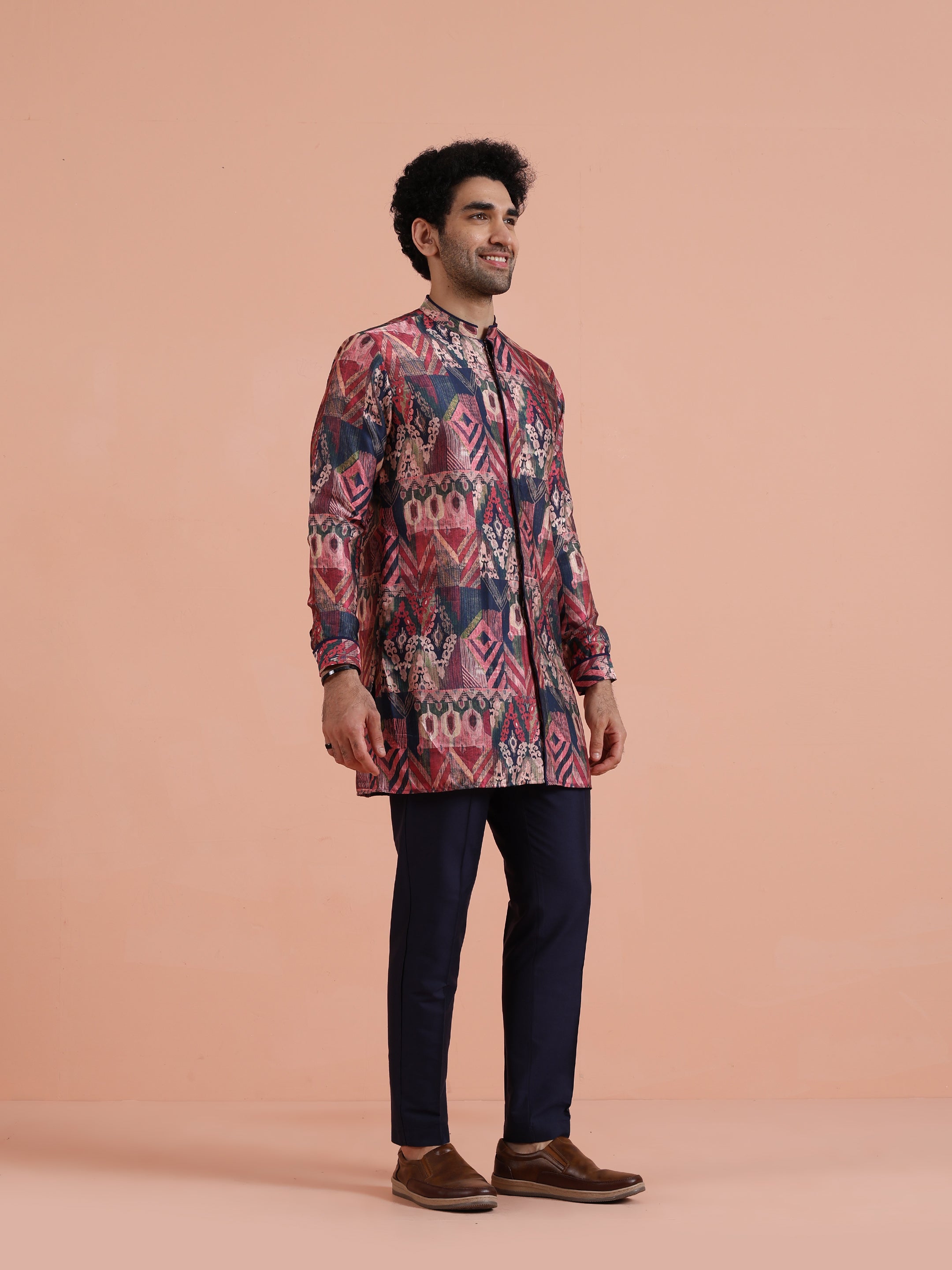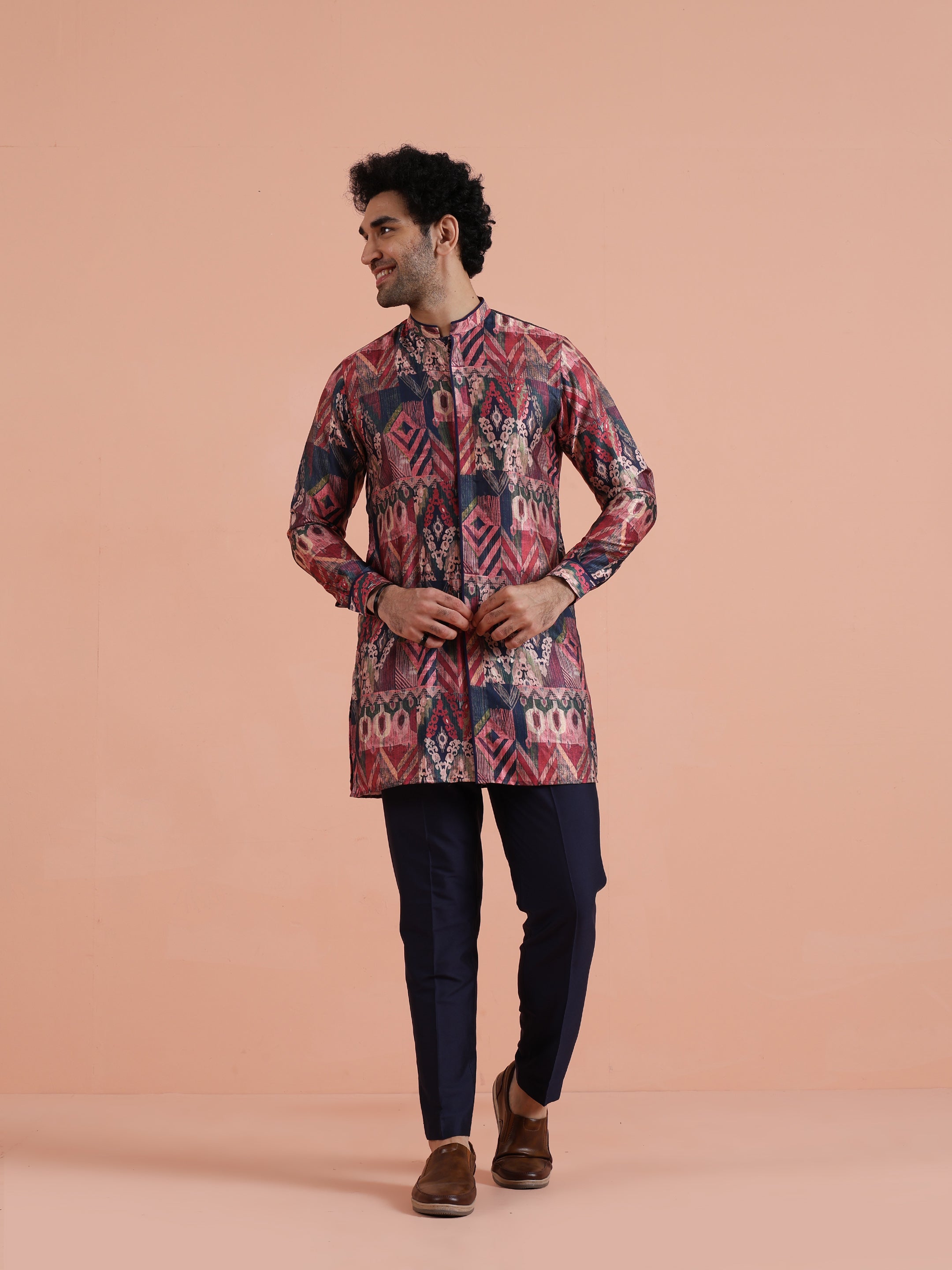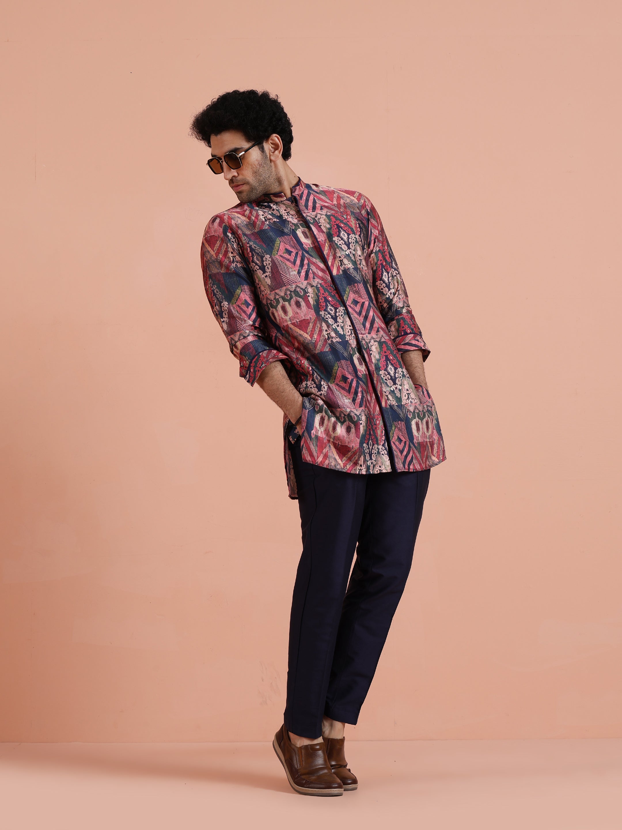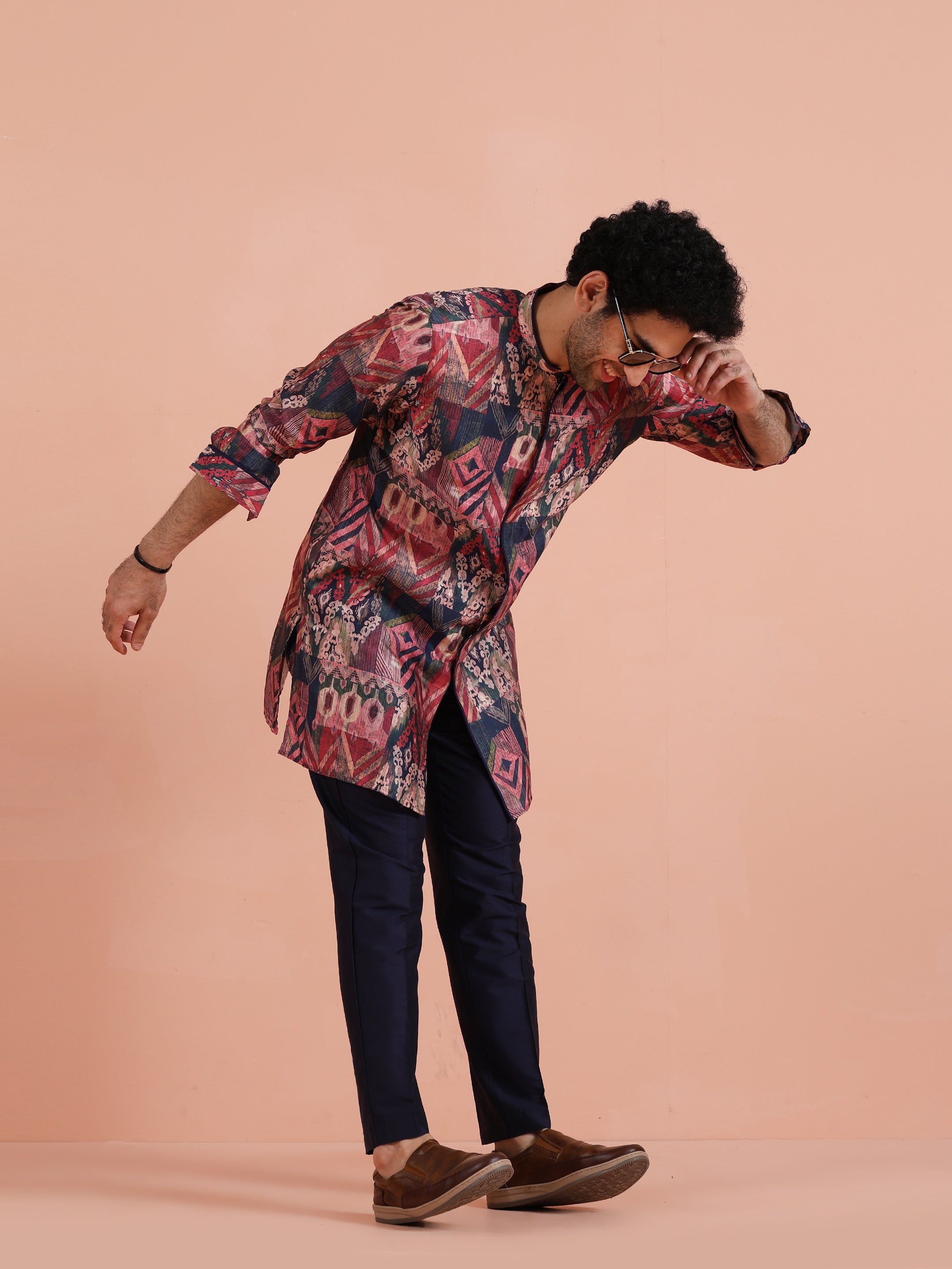 Kisah Menss Multicolor Geometric Mid Kurta Set with navy trousers bold ethnic outfit for weddings, festive evenings, and Indo-fusion parties.